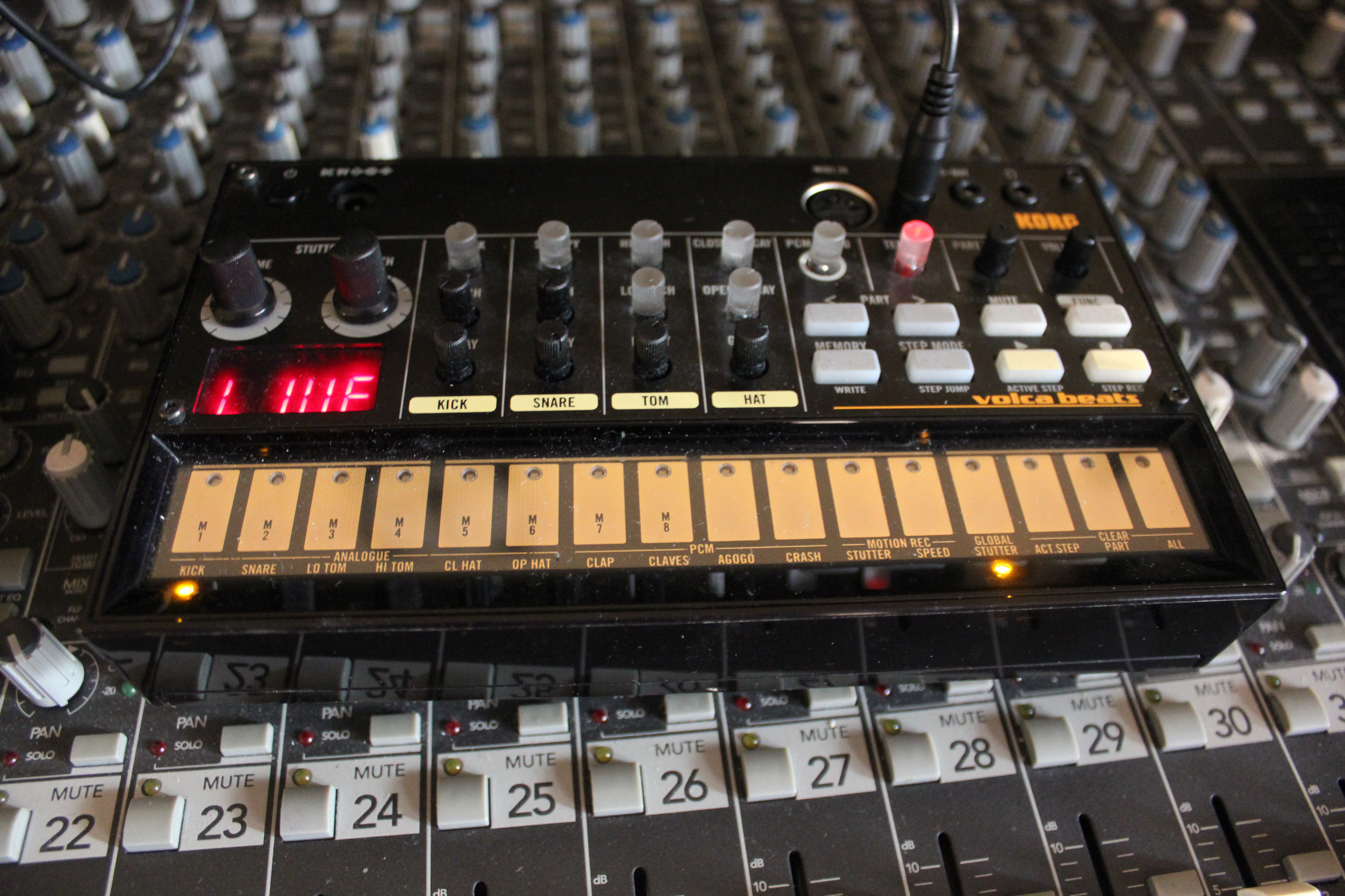 Le Volca Beats est une BAR hybride avec 4 ensembles de sons analogiques (grosse caisse, caisse claire, toms haut/bas, hi-hats ouverts/fermés) et 4 sons PCM (Clap, Claves, Agogo, Crash). Premier constat, la grosse caisse déchire sa race. Quand on baisse le pitch, elle dégouline de gras dans les infrabasses, ce qui n’est pas pour nous déplaire ; le Decay ajoute de la matière, alors que le click ajoute une attaque à plus haute fréquence, dont il ne faut pas trop abuser car le niveau est (un peu trop) élevé. La caisse claire est à notre sens le point faible sonore de la machine : le son de base n’est déjà pas inoubliable, même en jouant sur les paramètres de pitch et Decay, mais dès qu’on veut ajouter du timbre sur l’attaque (Snap) pour sortir du ploum ploum, on crée un bruit distordu pas du tout musical ; en creusant sur le net, on trouve des modifications pour améliorer considérablement les choses en ajoutant quelques composants, mais il faut savoir ce qu’on fait, pas mal de dextérité vu la taille des CMS, car la garantie saute… à ce sujet une pensée pour la Volca Beats de notre ami Arakisse, qui selon nos dernières informations a succombé à ses interventions chirurgicales en ces lieux.