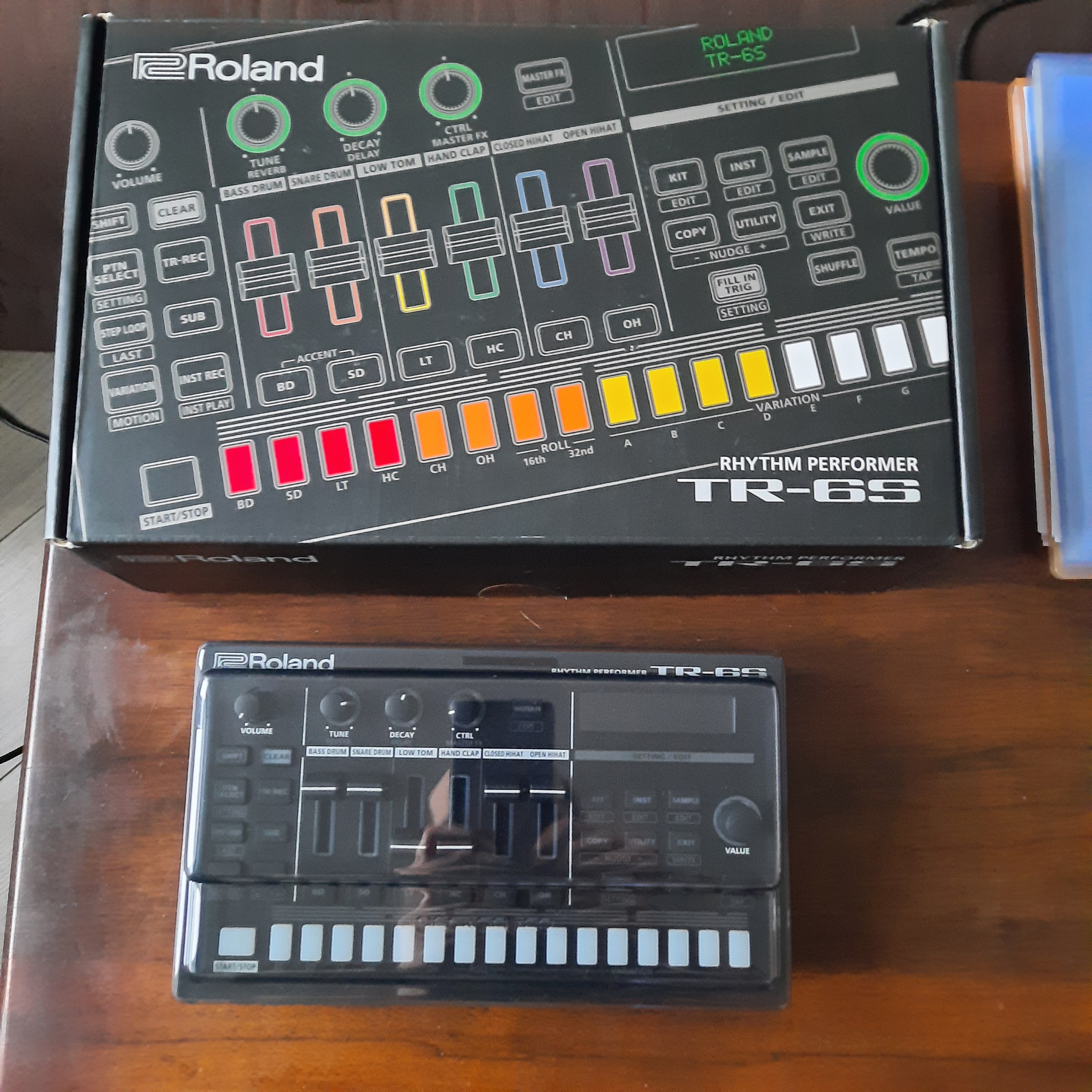Boîte à rythmes Roland TR-6S, accompagnée de son Decksaver et boîte d’origine. Très bon état.