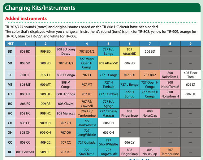 - Modes : TR-REC, PATTERN SELECT, INST PLAY, INST REC, DRUM KIT SEL, DRUM INST SEL