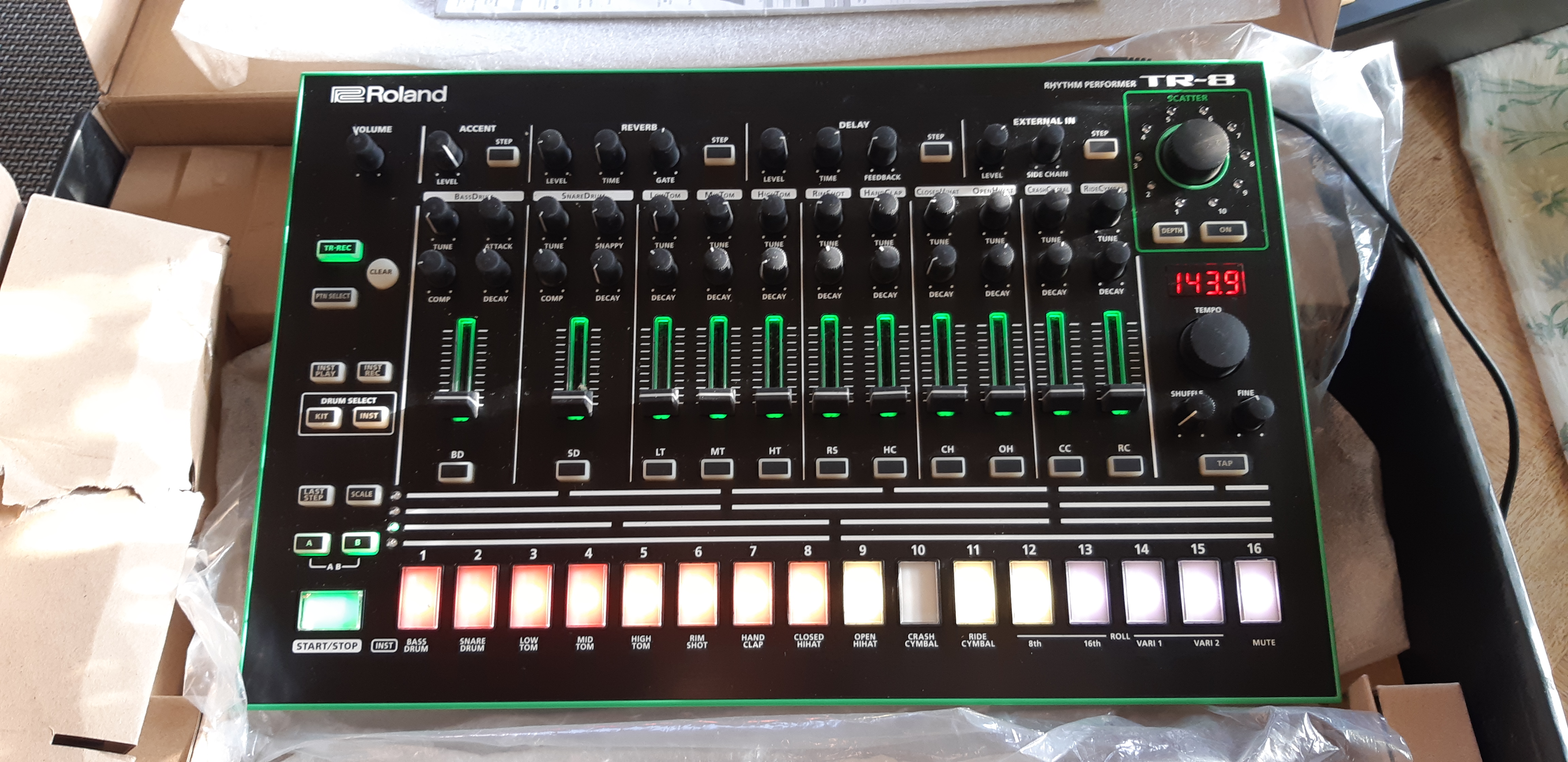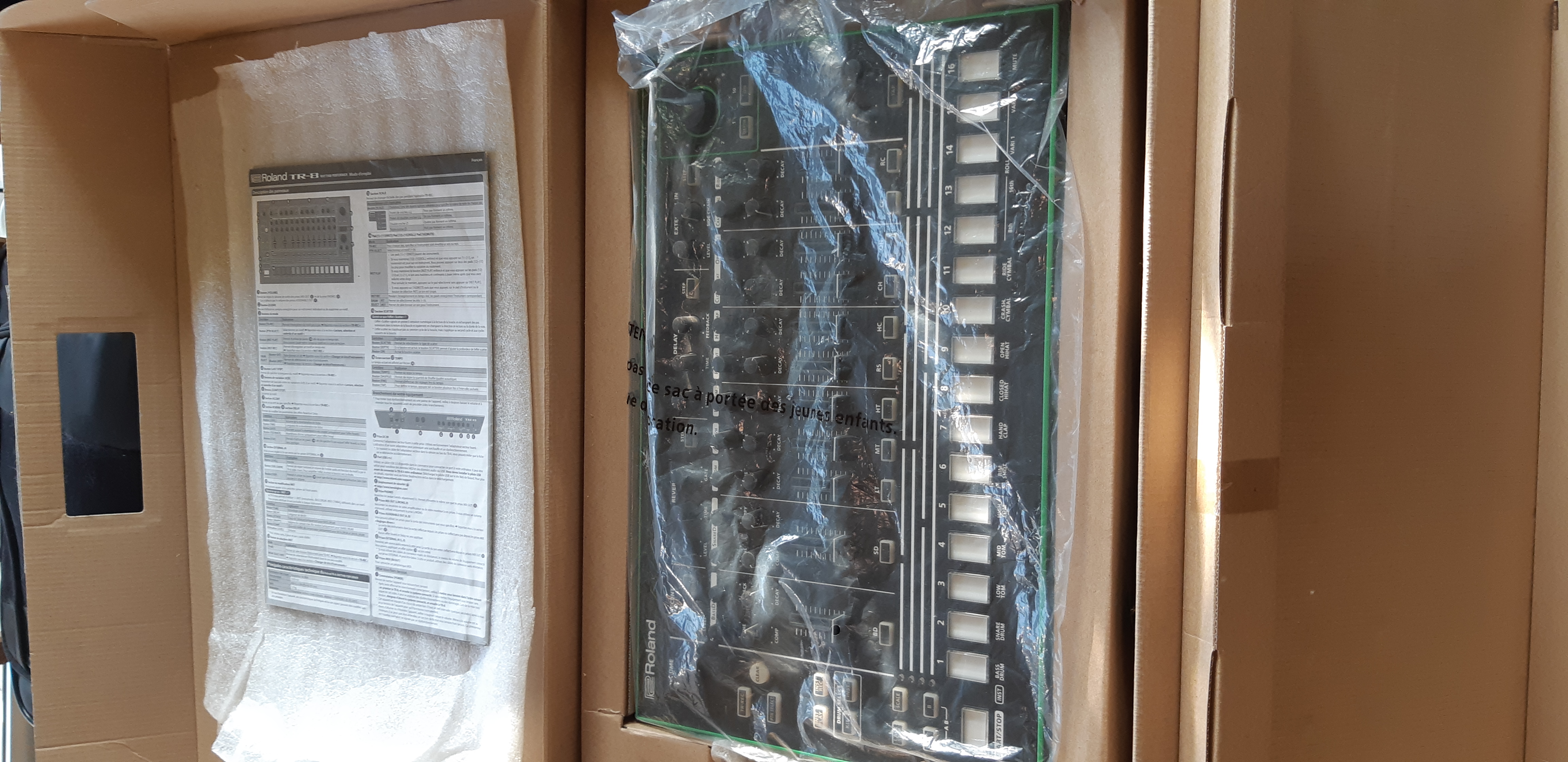 Après en avoir utilisé plusieurs (une DR110 plutôt limité, une DR-5 sympa surtout pour un guitariste mais plutôt pénible à programmer, un volca sample 2 convertit en pure boite à rythme) j'ai trouvé cette TR-8 (qui cote environ 200 balles d'occasion) en panne à une cinquantaine d'euros. Après avoir réparé la machine j'ai pu constater qu'en prime mon modèle disposait de l'expansion 7x7.