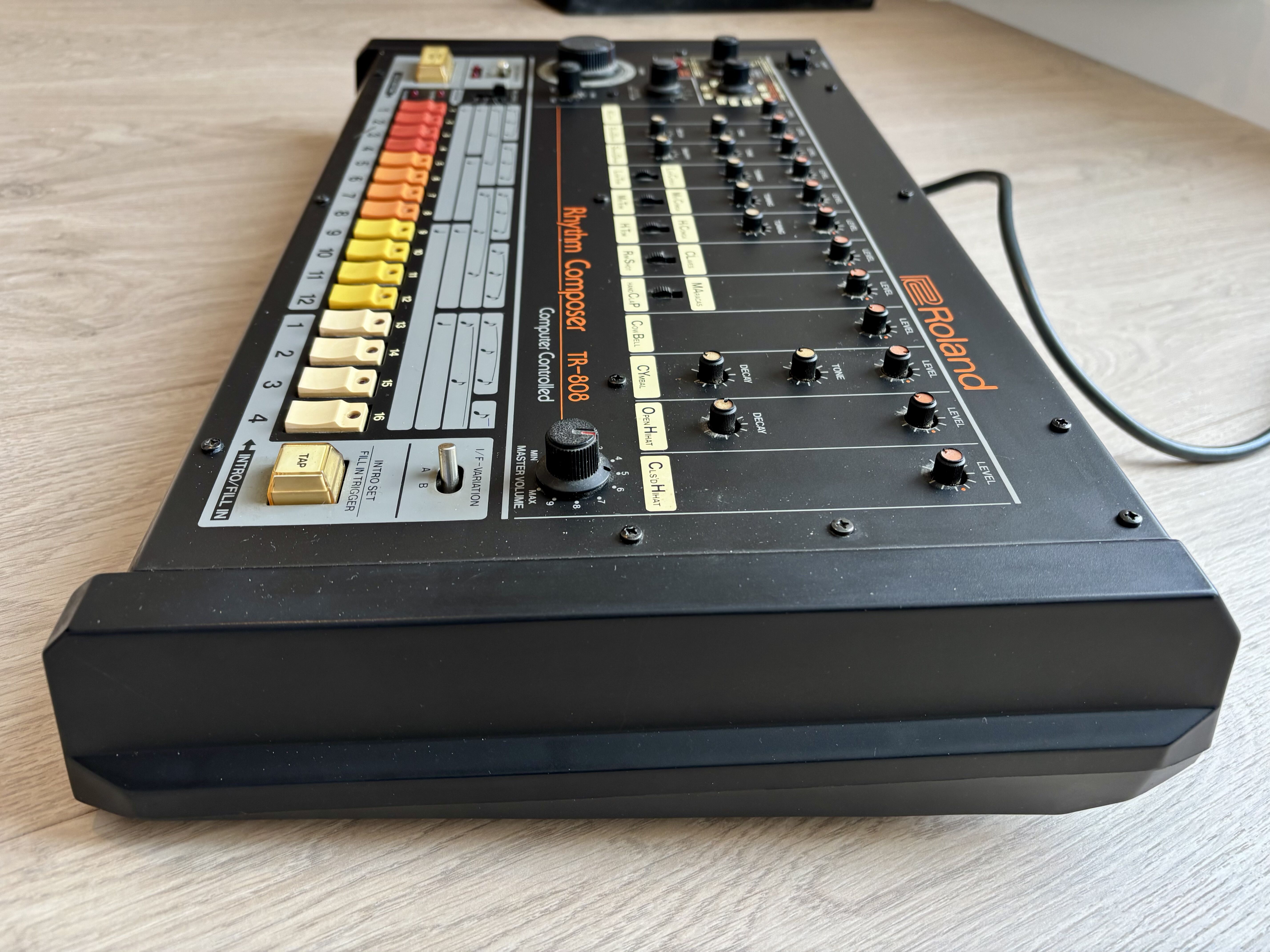 Après avoir essayé vainement d’autres BAR fort peu convaincantes, j’ai pu faire l’acquisition d’une ROLAND TR 808 aux puces de Saint Ouen pour la modique somme de 1500 francs (230 €)