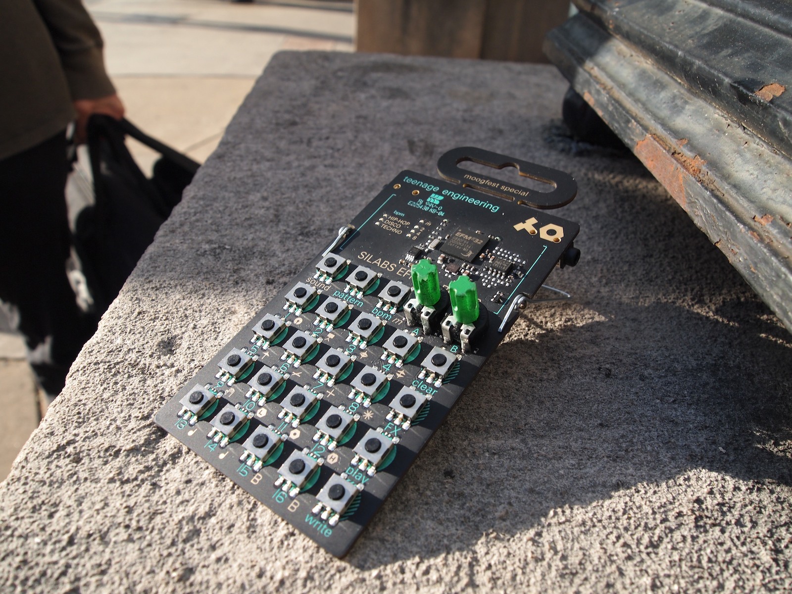 Le prototype de boîte à rythmes présenté par Teenage Engineering est ultra-compact (le circuit tient dans une enveloppe) et comprend 2 potards avec verrouillage des paramètres à chacun des 16 pas du séquenceur, ainsi que différents boutons pour choisir le son, le pattern, le tempo, l’effet et les modes de lecture et d’écriture.