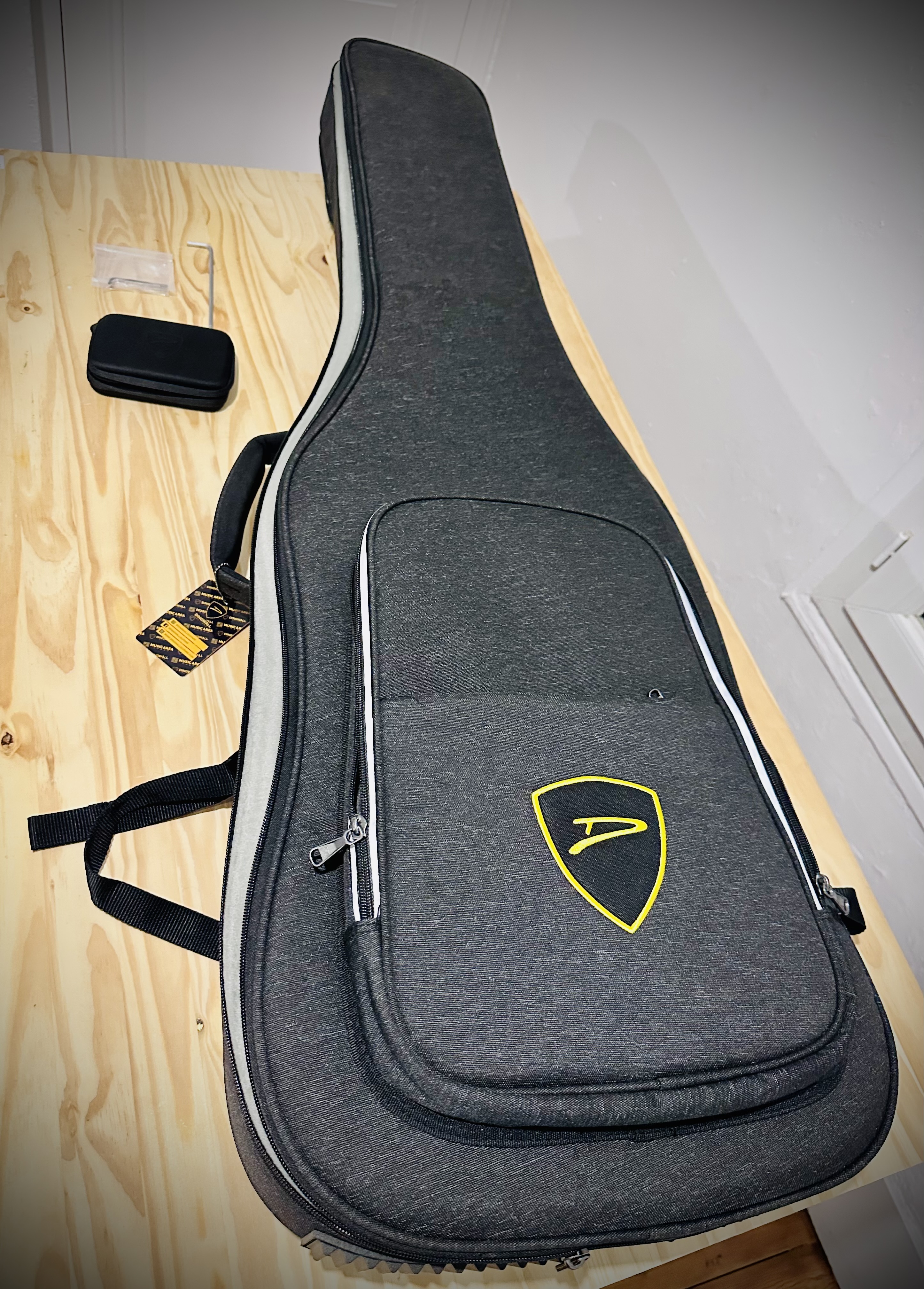 Elle vient évidement avec sa housse et les goodies, et est montée avec des cordes D’Addario NYXL 45-130