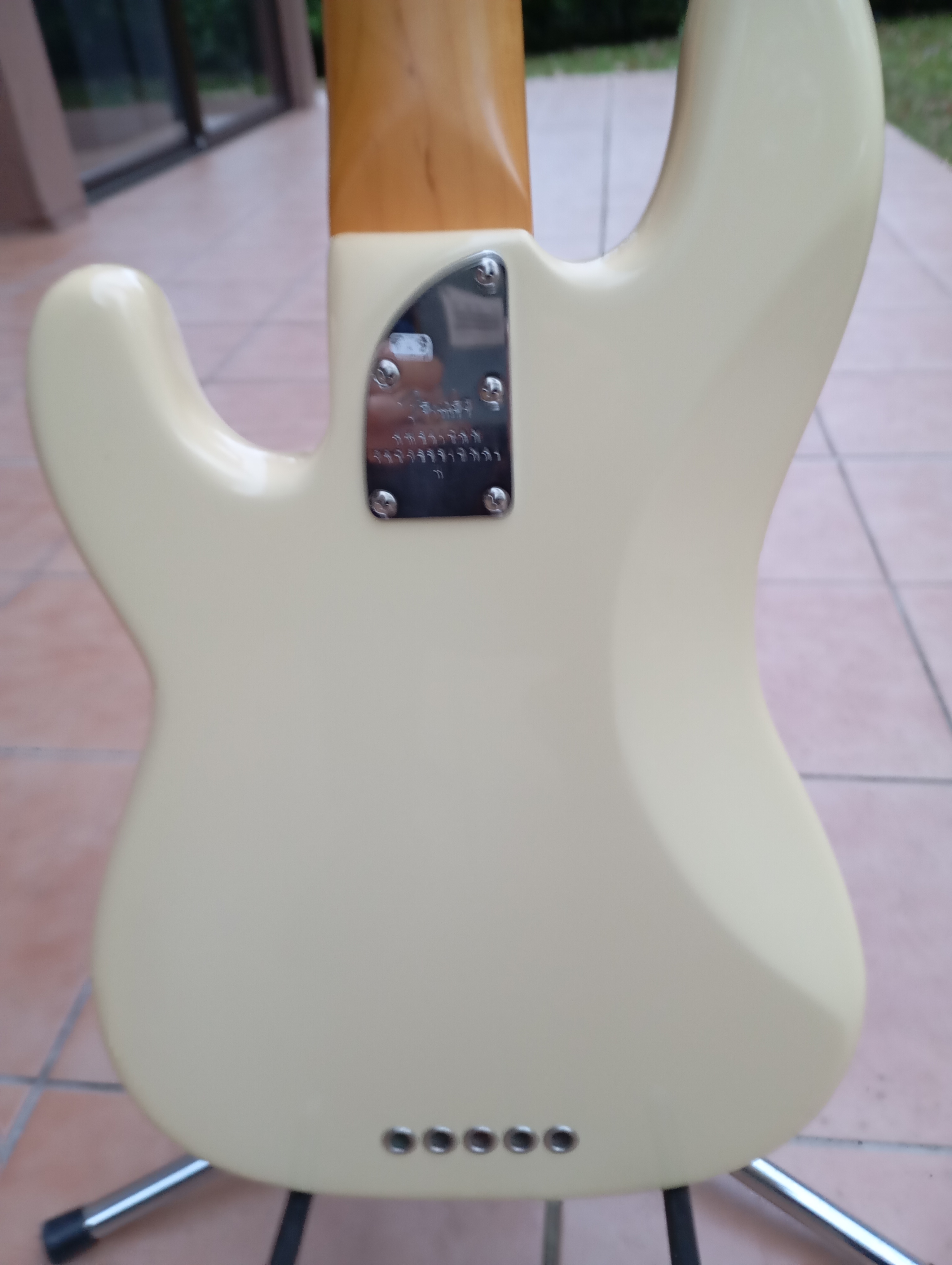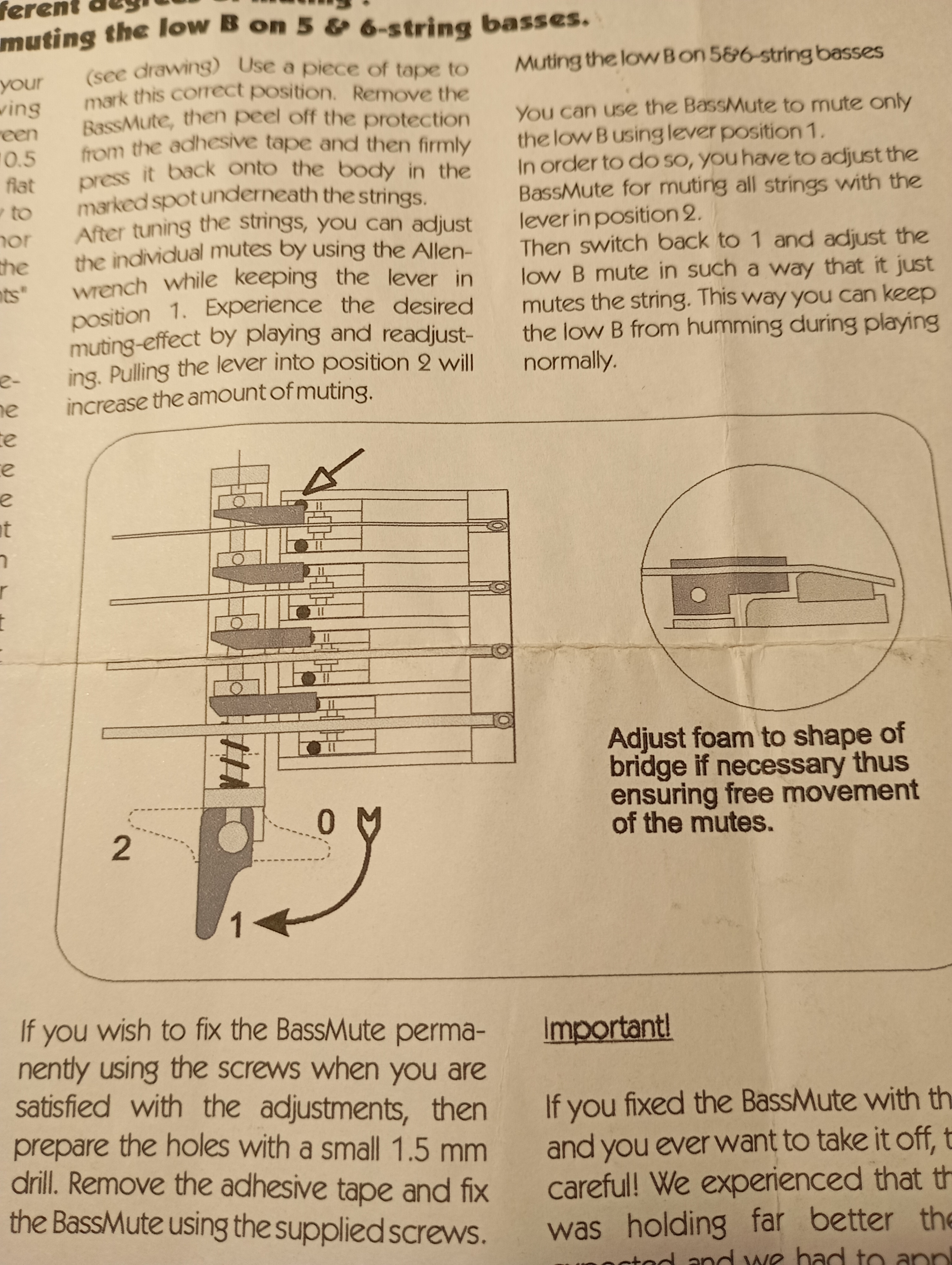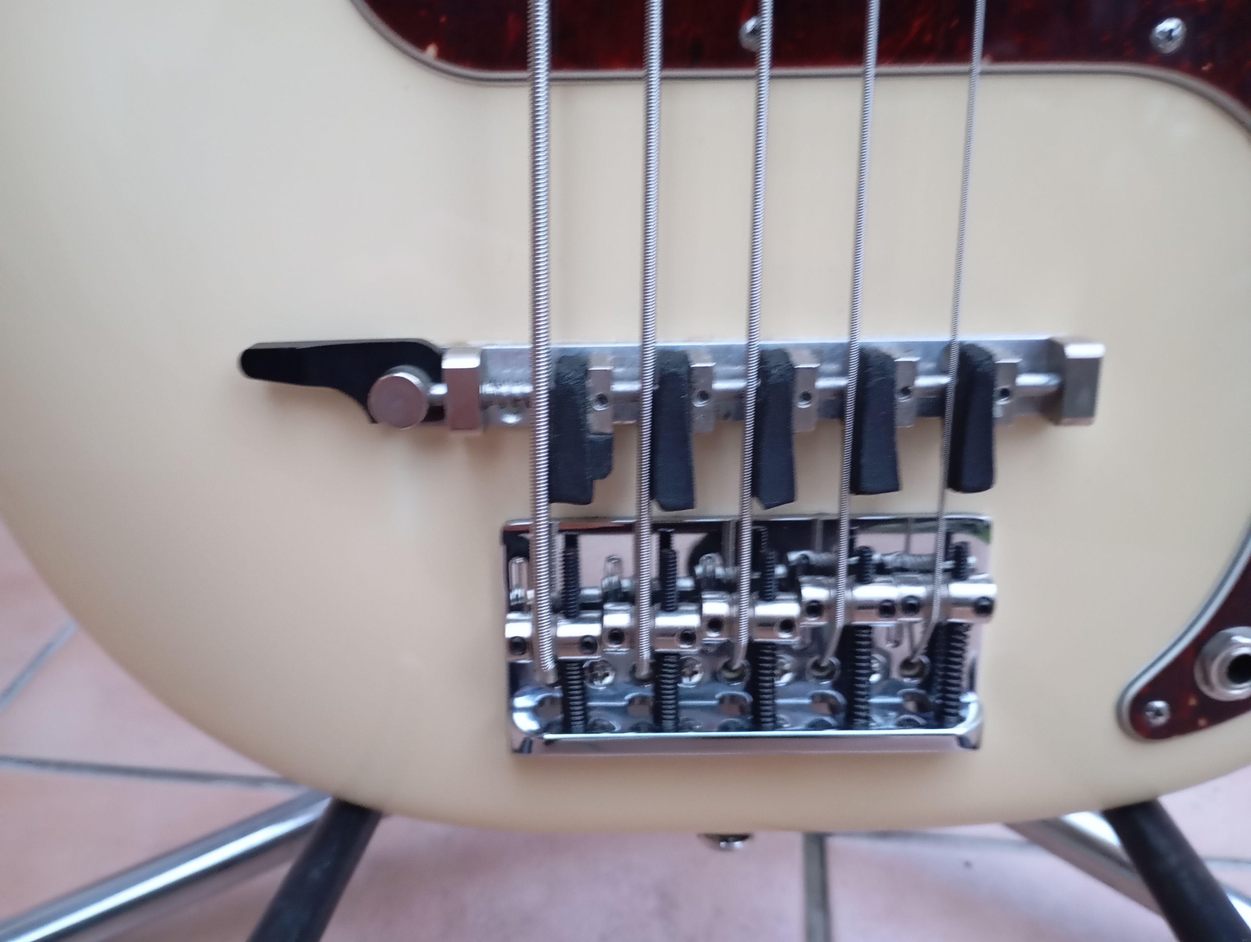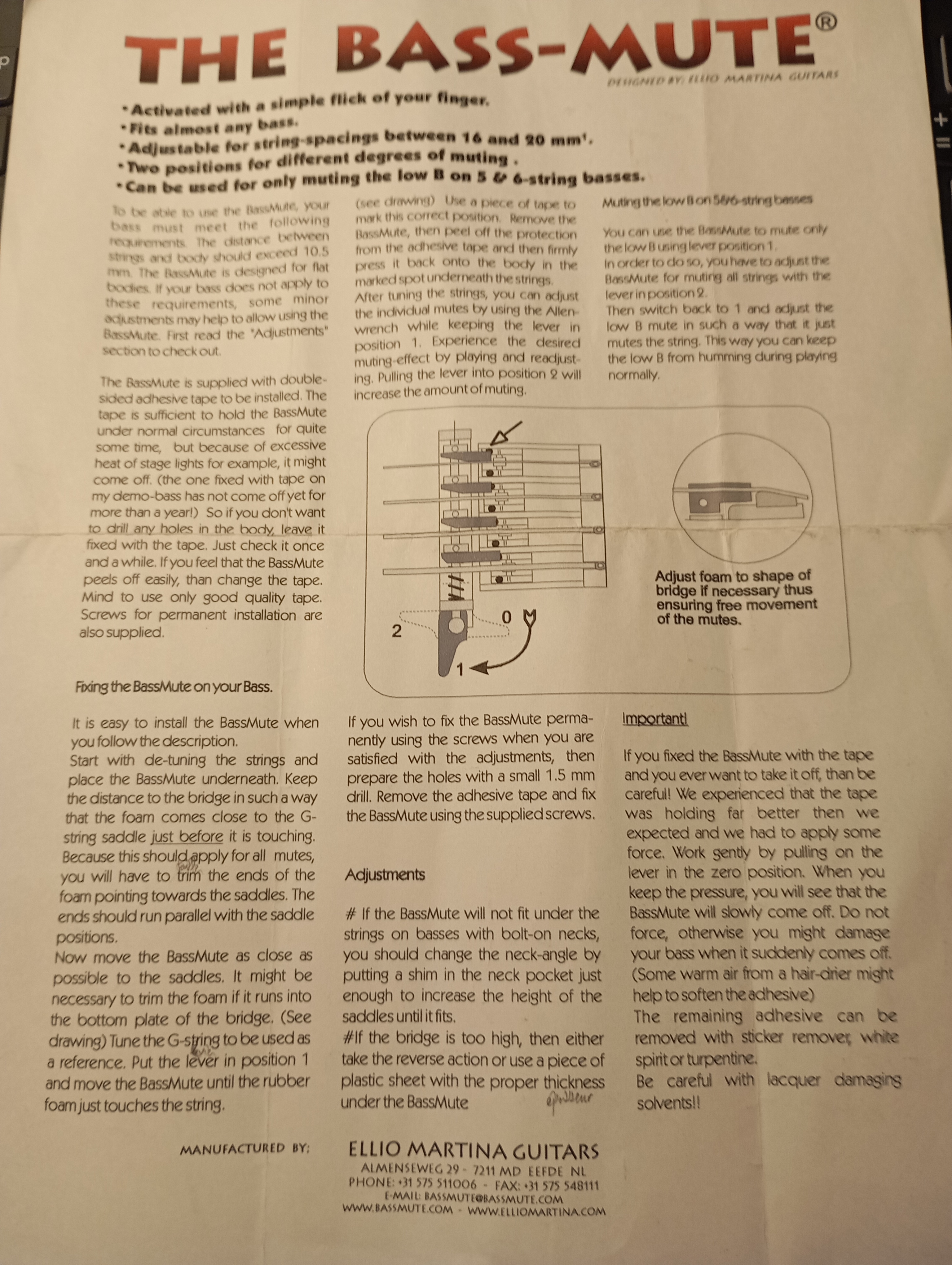 Je laisse avec le Bass Mute, ingénieux système conçu par Ellio Martina, permettant d'étouffer les cordes (pour les styles type reggae, salsa ou autre), et ce à l'aide d'un simple levier à 3 positions (off et 2 niveaux de mute), qui permet de passer de non étouffé à étouffé en une fraction de seconde, contrairement à d'autres systèmes fixes. L'étouffement est ajustable à sa guise pour chaque corde à l'aide d'une clé à allen.