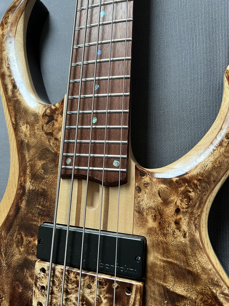 SPECS type de manche BTB5 5 pièces érable/noyer Manche traversant avec tiges de renfort en graphite table/dos/corps Table en ronce de peuplier Corps en aile de frêne/okoumé touche en jatoba incrustation de points en abalone frettes Medium en acier inoxydable nombre de frettes 24 (+ frette zéro)