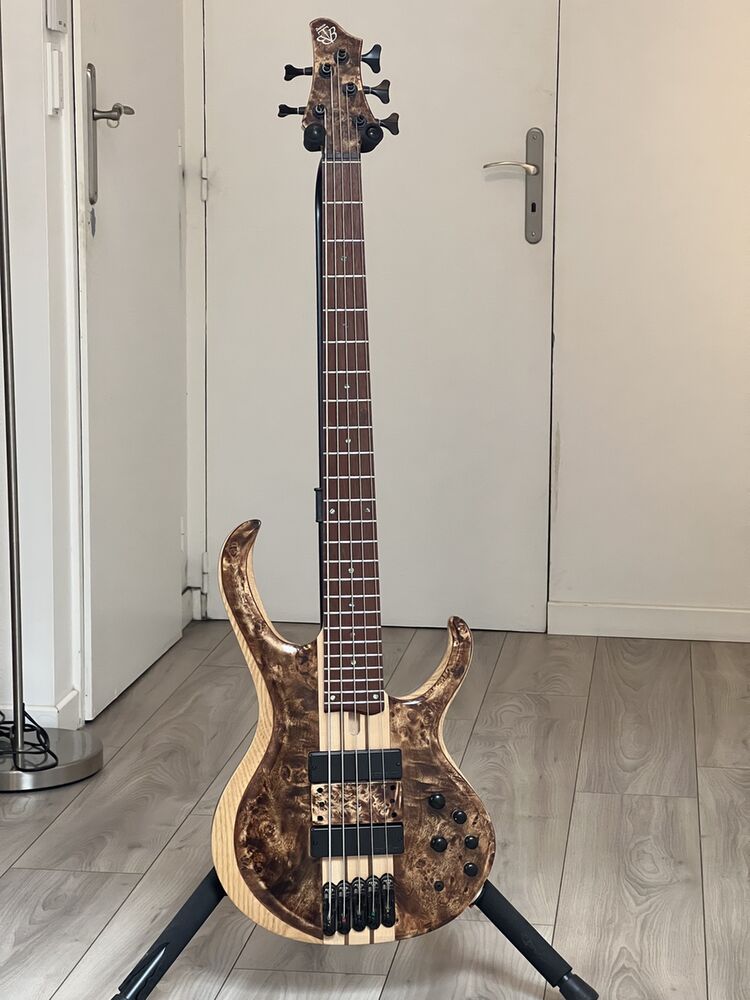 On ne présente plus les basses Ibanez, elles ont largement fait la preuve de leurs qualités. Cette Ibanez BTB 845V fait partie du haut de gamme de la marque. 5 cordes, électronique active, micros Bartolini, accordage en mi, la, ré, sol, do ou si, mi, la, ré, sol au choix. Très bon niveau de finition. Elle est super confortable grâce à un diapason en 33 pouces d’où le V qui inclue cette basse dans la série Volo sorte de « Médium Scale » Le manche est incroyable en érable et en noyer fret Zéro touché en Jatoba La palette sonore est très large, excellent sustain grâce au manche conducteur. Je m’en sépare à contre cœur pour acheter un nouvel instrument Elle est équipée de filets plats de chez Ernie Ball, les cordes sont assez récentes et très peu jouées Je la laisse à petit prix mais elle est souvent proposée beaucoup plus chère car c’est un modèle très rare.