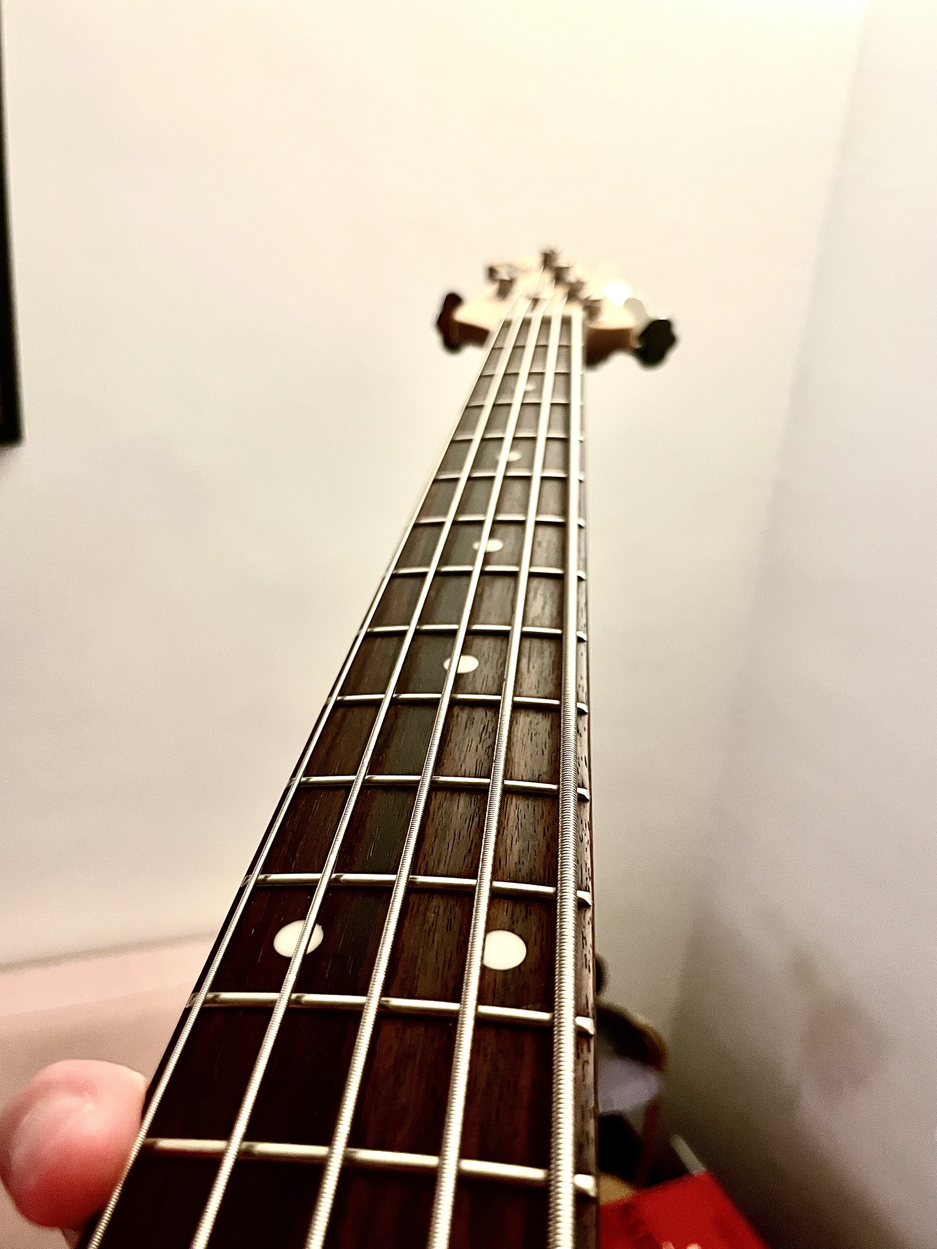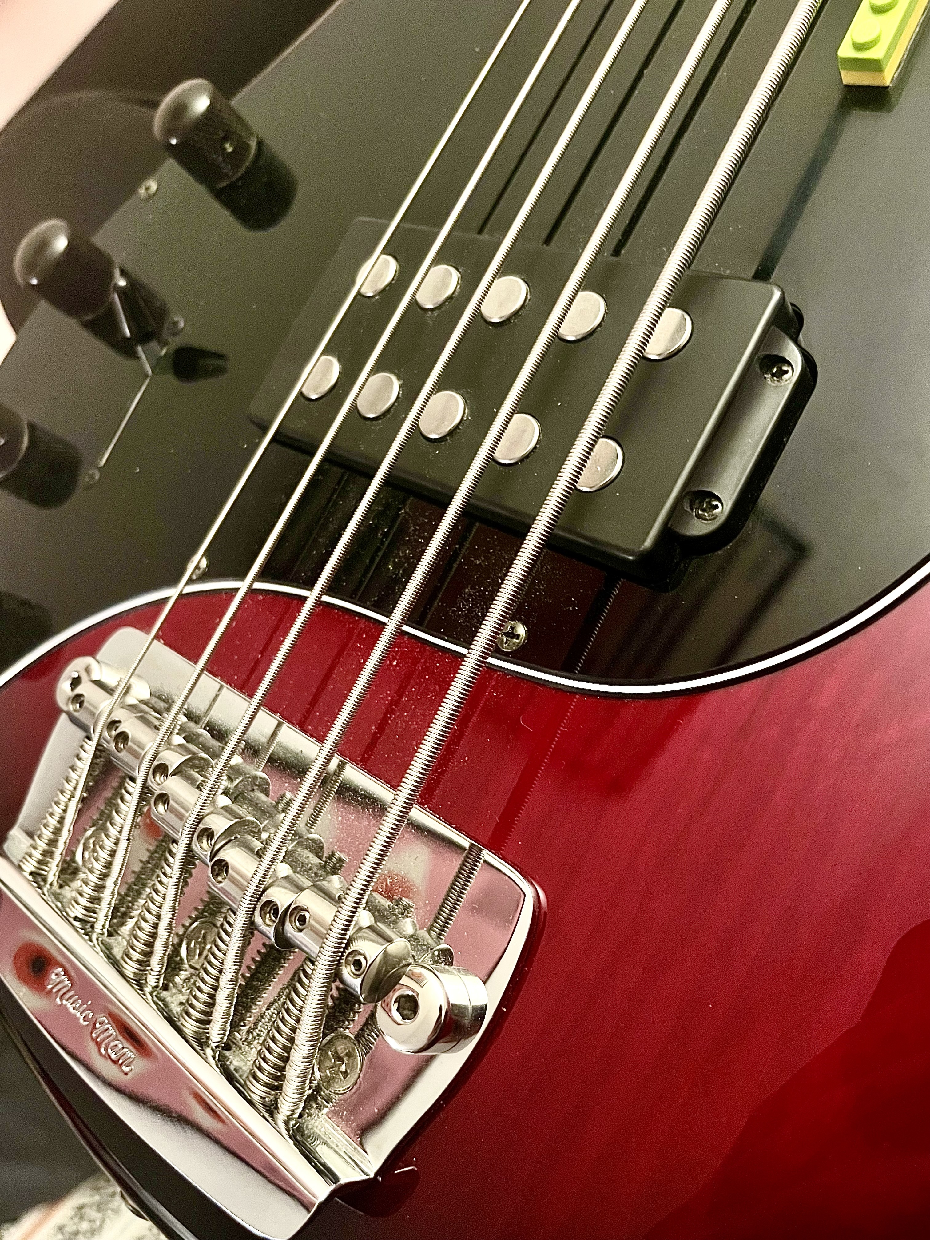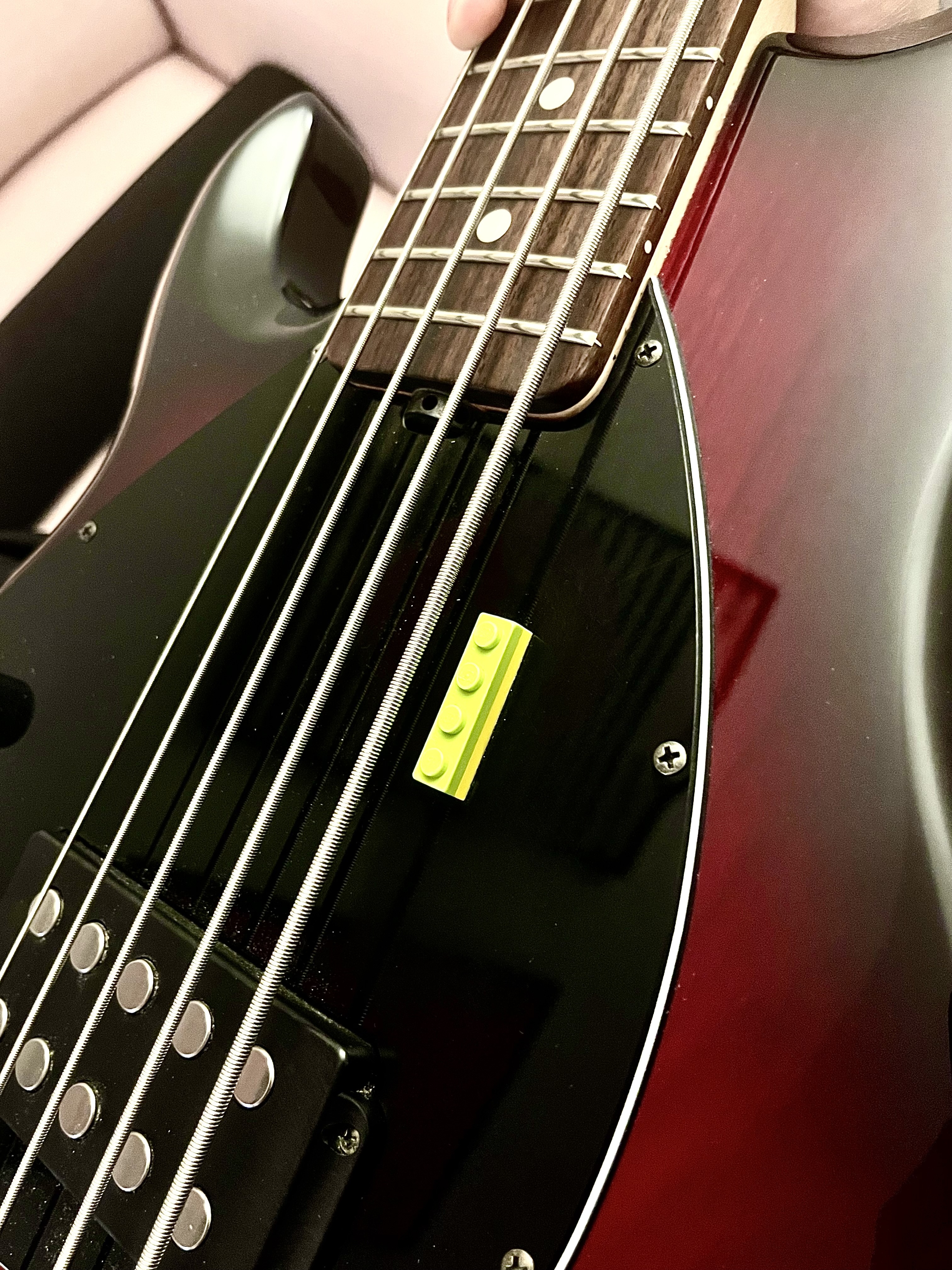 Un petit LEGO est collé sur la plaque comme le montrent les photos, j’ai eu la basse comme ça, je trouve ça très pratique et assez original personnellement.