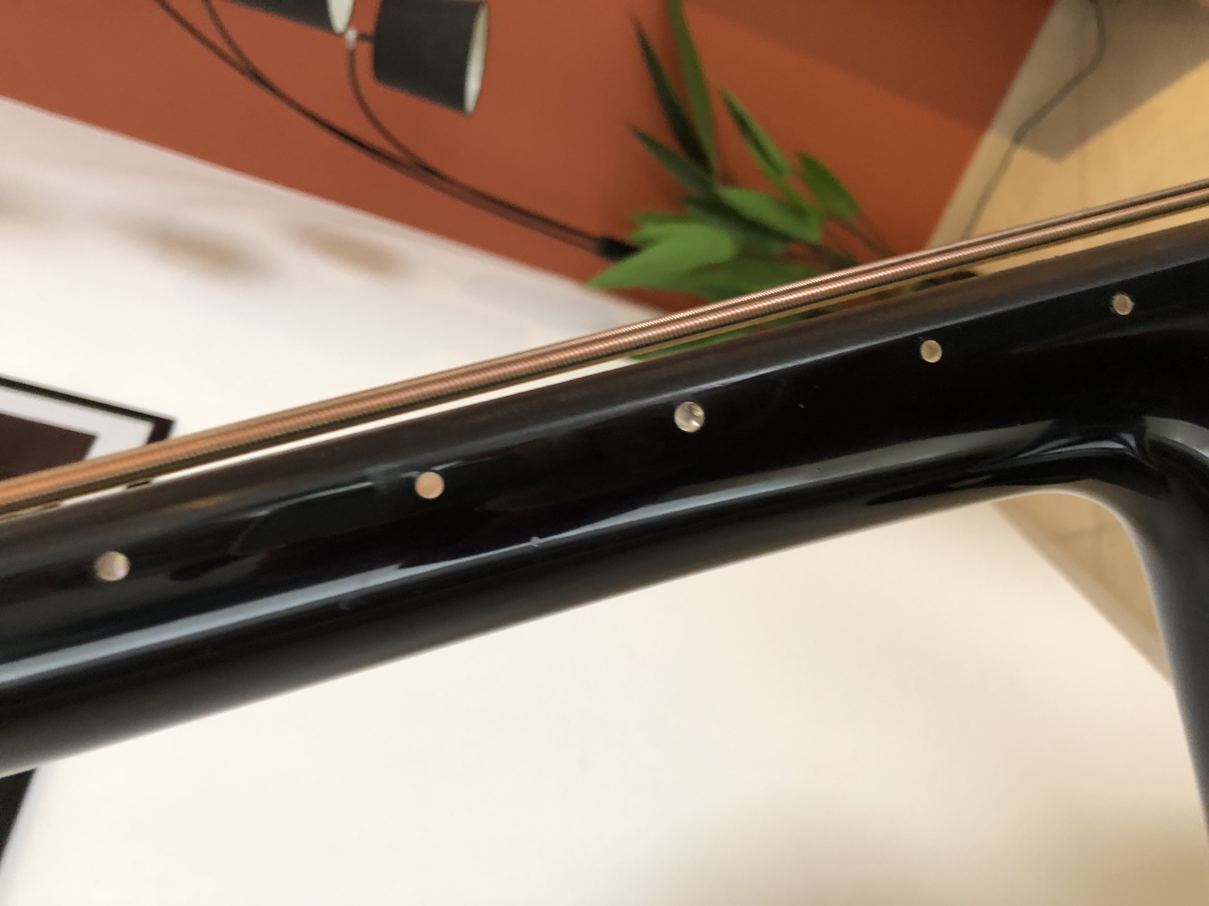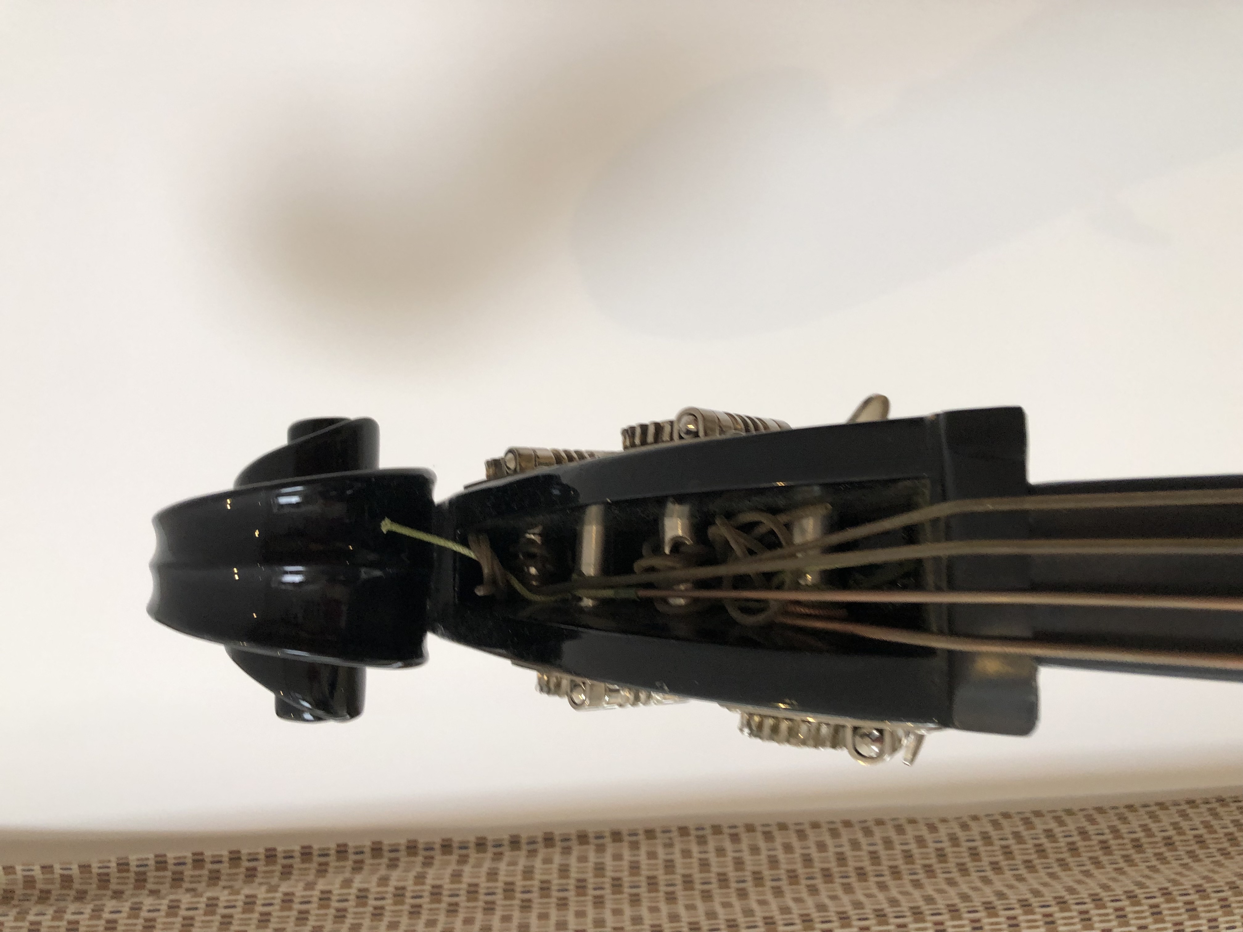 Elle est Montée de cordes a âmes metal et filets plat synthétique ( métal pour les capteurs soit cuivre a faible tension ) et le filet plat synthétique permet de slaper facilement. ( idéalement par exemple des Helicore accord solo ou des Presto hight -tension