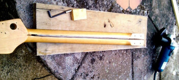 La basse est une Elypse B300 sunburst achetée 50 euros d'occasion. Le manche est une catastrophe, les frettes sont mal usinées et coupantes sur le bord, le truss rod est inopérant, il se visse bien au maximum mais n'a aucun effet, donc inréglable. J'ai enlevé les frettes et rebouché les fentes à la pate à bois mais l'action reste très haute sans truss rod efficace, la basse est injouable. J'ai imaginé de placer une tige filetée dans le manche pour contrer la tension des cordes. Le résultat est inespéré, ça marche très très bien.