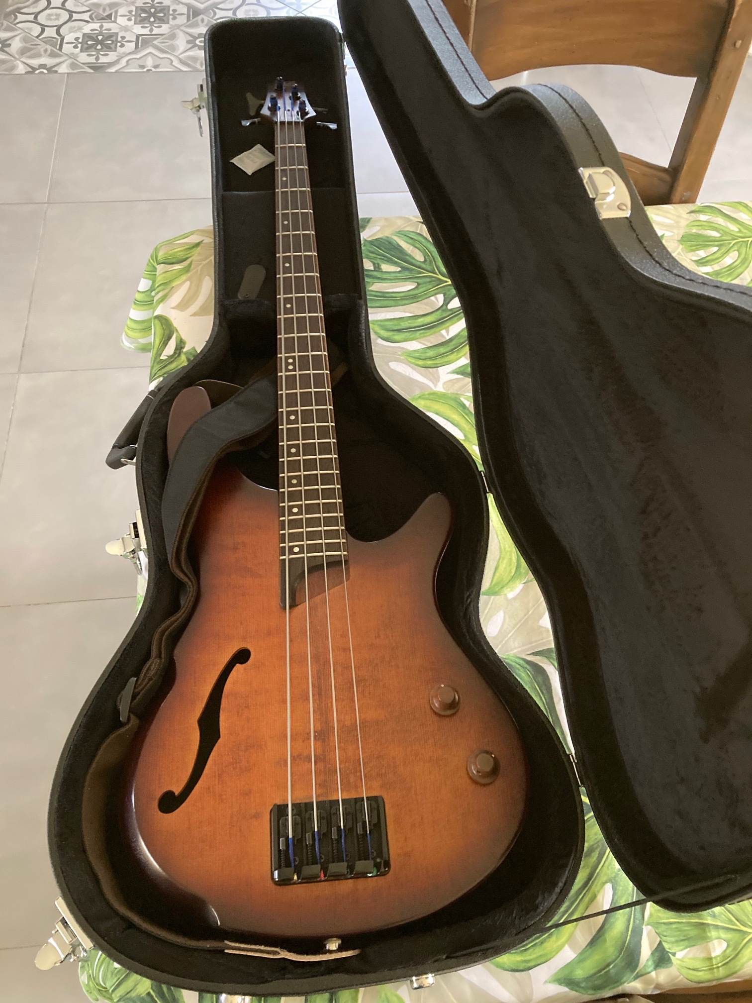 Pour remplacer ma JazzBass, je recherchais une nouvelle basse avec cette esthétique différente.. Difficile a dénicher car plus produite depuis quelques années, mais je l'ai enfin trouvée en occasion.. L'esthétique est très réussie; tant la forme générale que la couleur. Le manche est fin, bien réglé, la hauteur de cordes plutôt basse avec le tirant préconisé (45-100, important !).. A vocation de mon répertoire plutôt jazz, j'ai pour ma part opté pour les filets plats. Les micro piezzo demandent évidemment un peu d'accoutumance quand on ne connait pas; les bruits de doigts de corde, de caisse étant également amplifiés, mais laissent présager des possibilités d'expression. Le son produit a du coup une couleur bien "acoustique" ajoutée, et un très bon sustain.. La justesse est correcte, jusque la 24e case. L'électronique est simple, un potar volume et un "aigu", mais en restant dans la nuance. Le poids est un véritable cadeau pour les dos meurtris.. 3kg ! J'apprécie la découpe de la caisse; tant le bas qui se pose sur la cuisse et y reste bien calé, que l'angle du haut qui permet à l'avant bras d'y rester sans fatigue.. La finition vernie (je pense) exige un peu de soin. Je la joue pour ma part sur un MarkBass combo. J'ai trouvé cet étui de transport Fazley BC 100 parfaitement adapté.