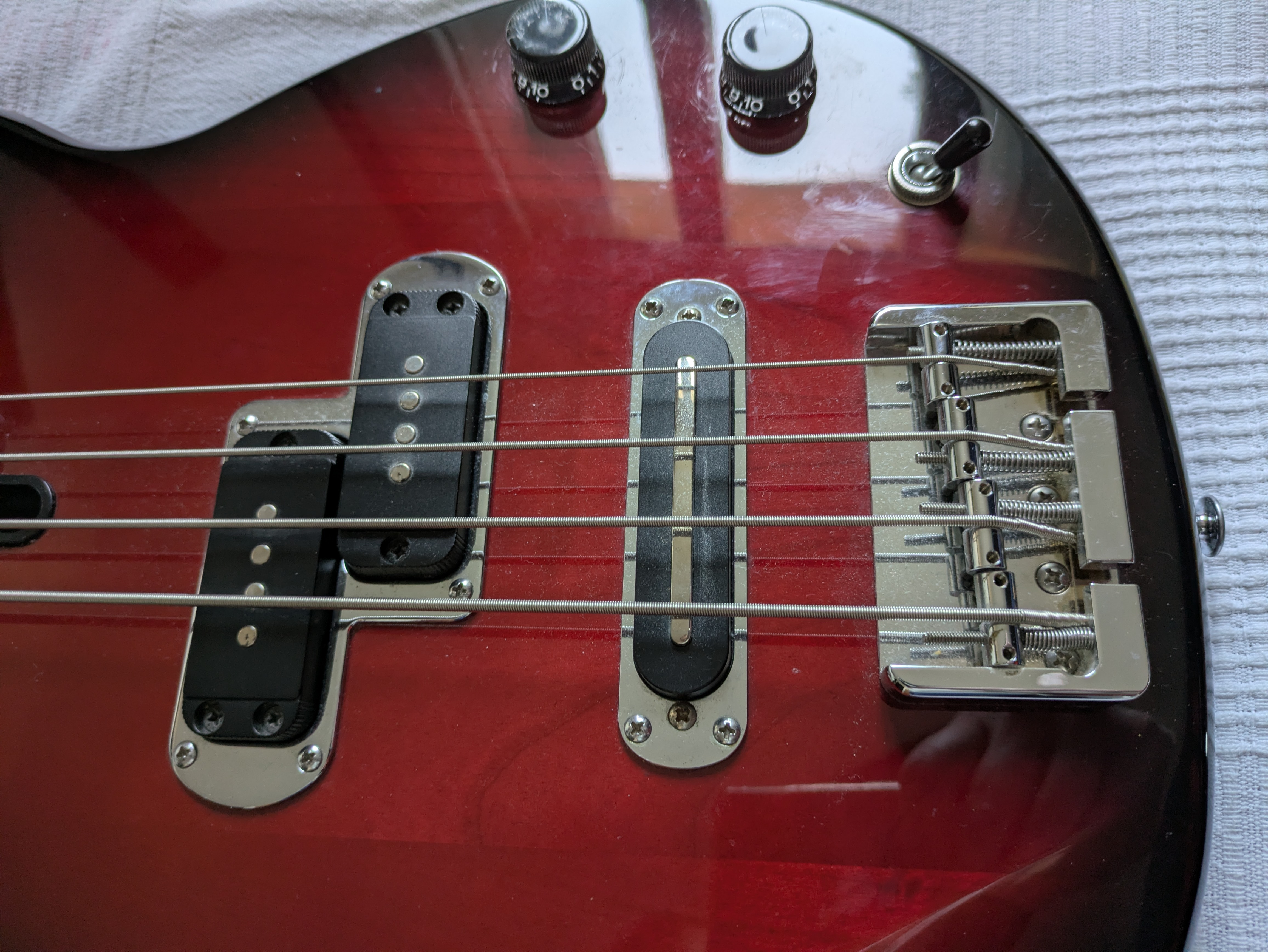 Lorsque je la joue, à l'aide du sélecteur, j'utilise soit le micro P.B.,soit le mix entre les deux micros, jamais le micro J.B. seul. Potar de volume à fond (normal) et tonalité à fond ou au trois quarts, suivant l'usure et le claquant des cordes. Voilà des réglages simples qui permettent d'avoir un son qui passe partout et d'accompagner dans différents styles(essentiellement blues-rock pour ma part)