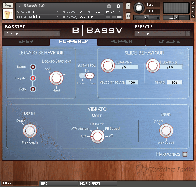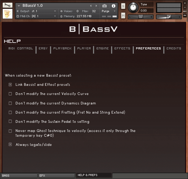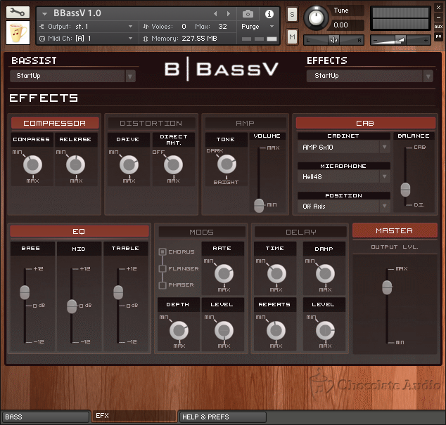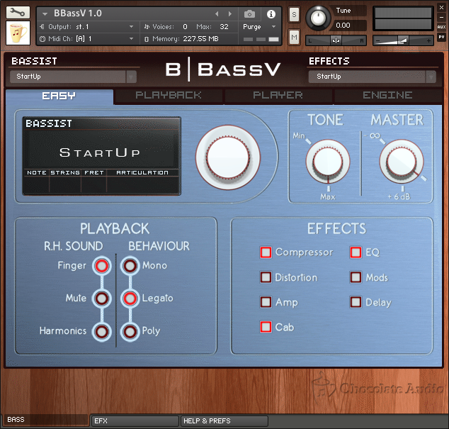 L’interface custom pour la version complète de Kontakt 5.4.3 et suivant vous donne accès à une section d’effets avec compresseur, distorsion, égaliseur trois bandes, chorus, flanger, délai et phaser, à la gestion de la courbe de vélocité, à des systèmes de fretting manuel et automatique (algorithmique), aux legato, slide et vibrato custom. Vous trouverez également 172 réponses impulsionnelles de baffles et micros combinés (Ampeg, Ashdown, Hartke, Mesa Boogie et des micros EKG, Audix, Neumann, Sennheiser, Shure, Sontronics, Heil Sound, ElectroVoice) et 26 presets d’usine.
