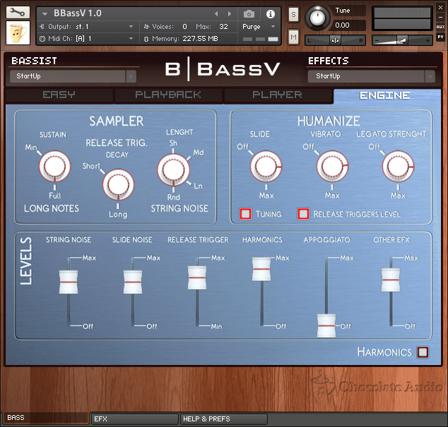 B BassV est une banque d’un peu moins de 1 GB comprenant 6 517 échantillons sonores de basse électrique. L’instrument a été enregistré en 24 bits / 96 kHz avec des préamplis Millennia DI, des convertisseurs Apogee et échantillonné en 24 bits / 44.1 kHz de manière chromatique avec 4 couches de vélocité et 4 round robins. Vous avez droit à trois articulation (jeu aux doigts, au doigts muté et harmoniques).