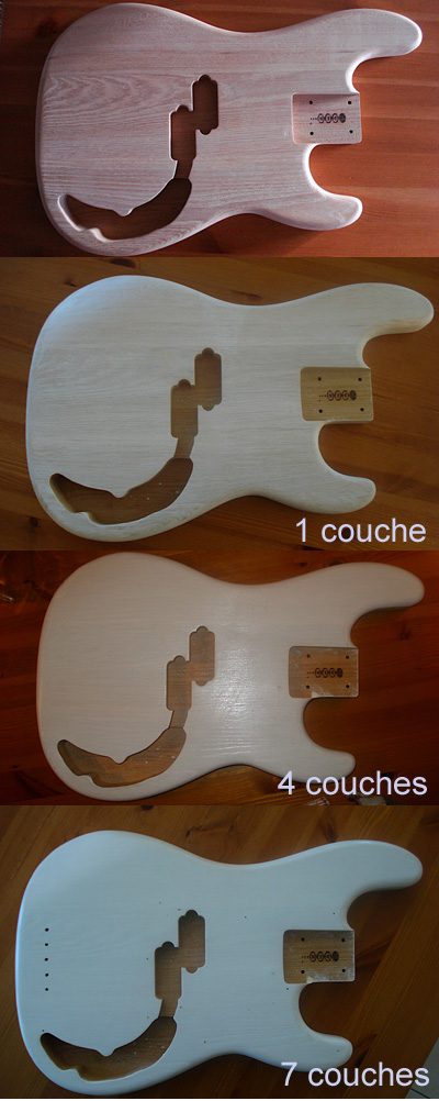 Et une photo qui reprend les différentes étapes jusque maintenant (0 , 1 , 4 et 7 couches de vernis).