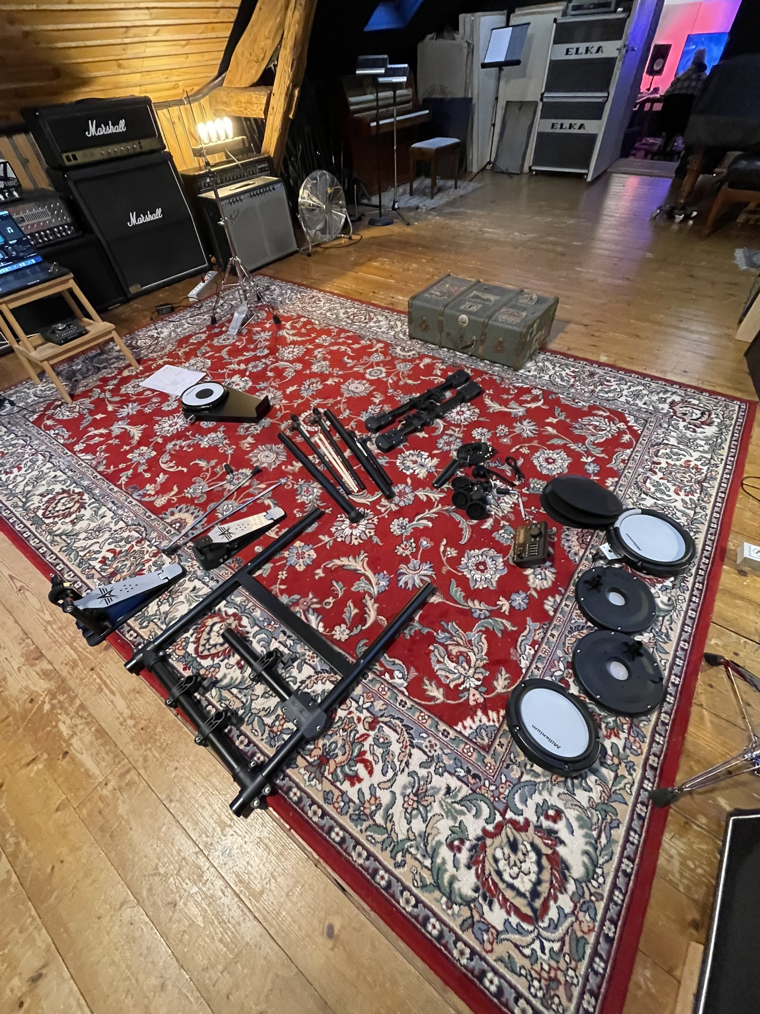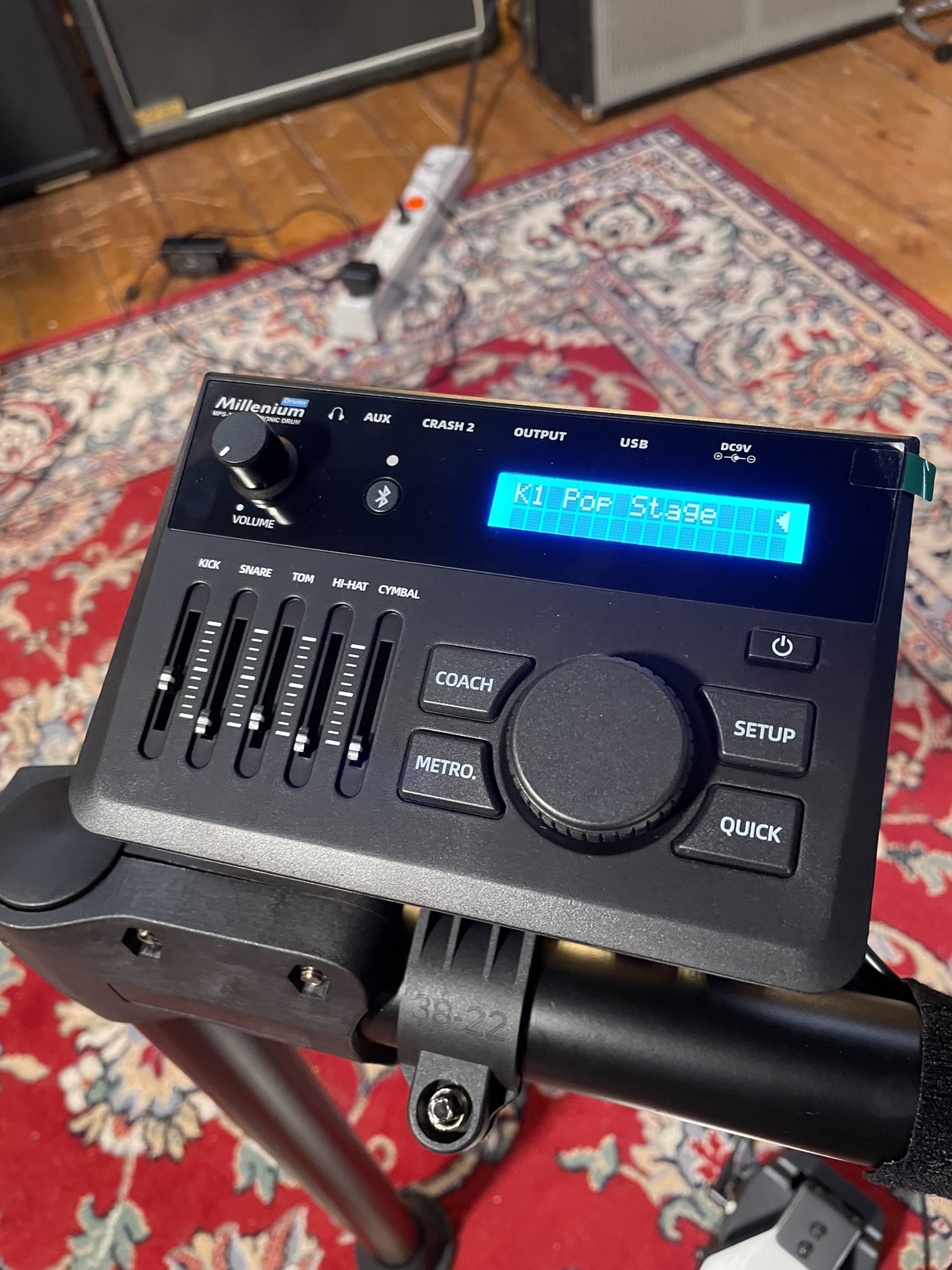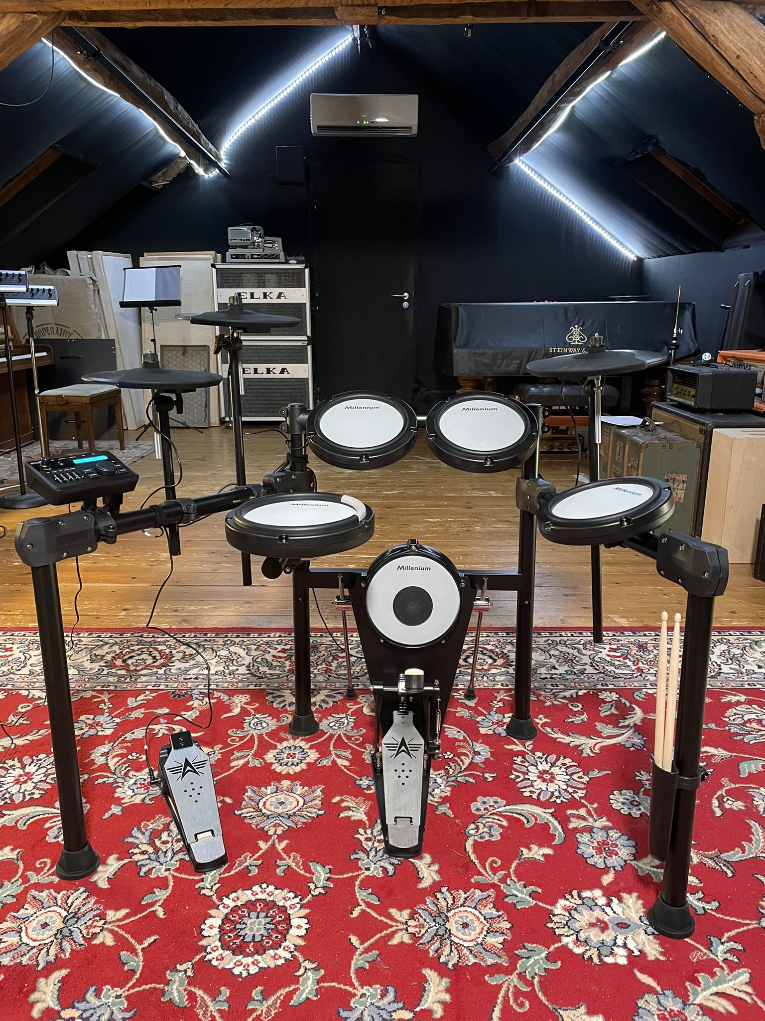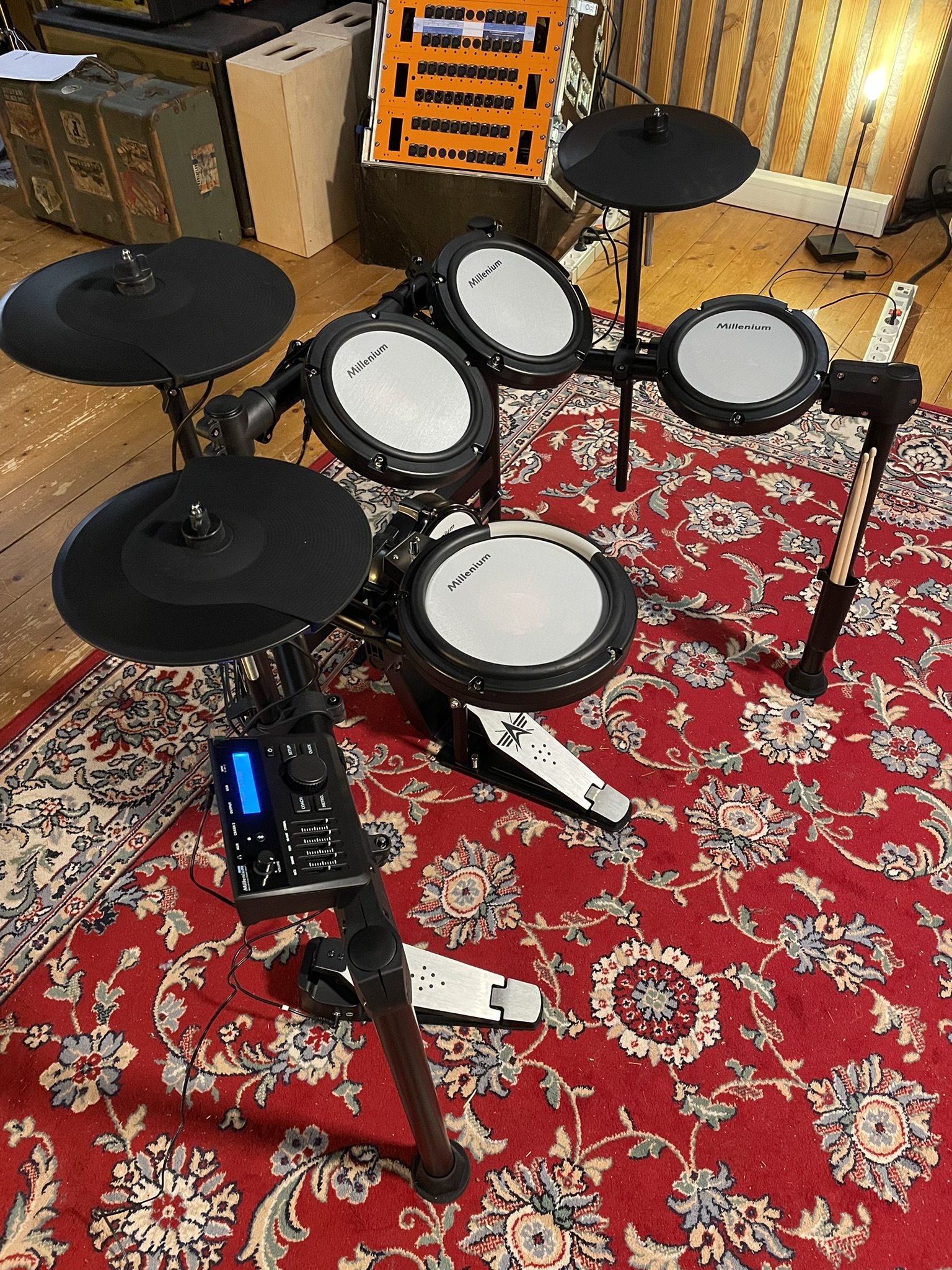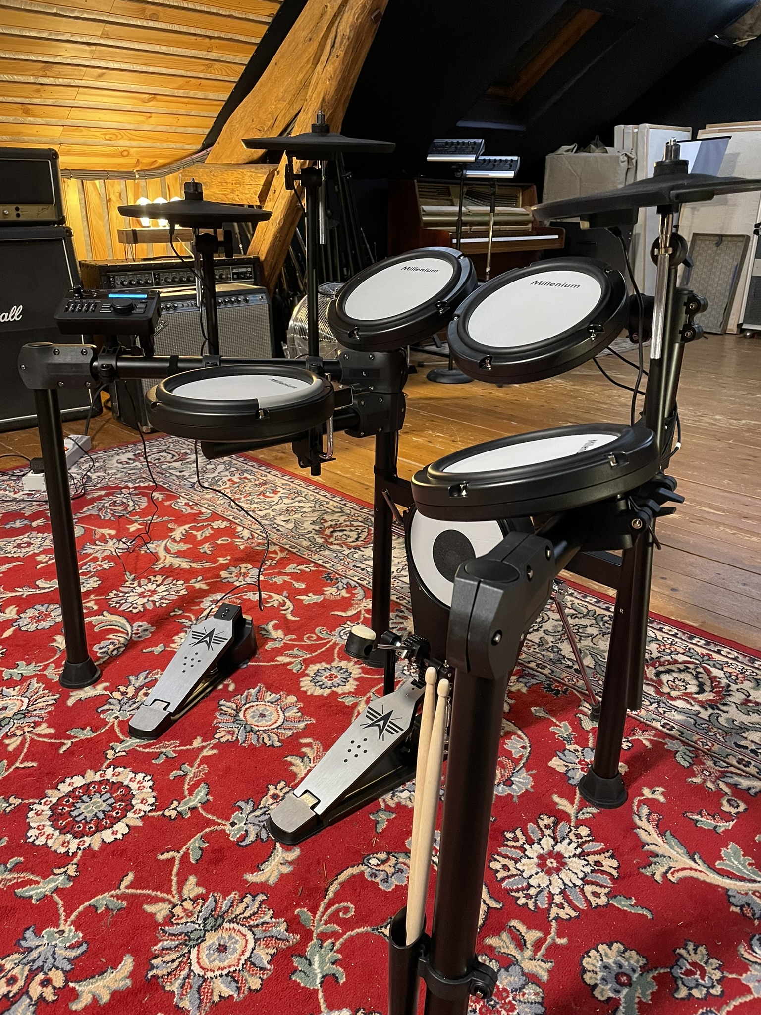 La pédale fournie est correcte et réglable en inclinaison, mais le positionnement relativement haut du pad kick oblige à surélever l’ensemble, ce qui peut fatiguer à la longue. Les cymbales intègrent bien le choke, toutefois avec une latence perceptible qui se fait sentir en jeu rapide.
