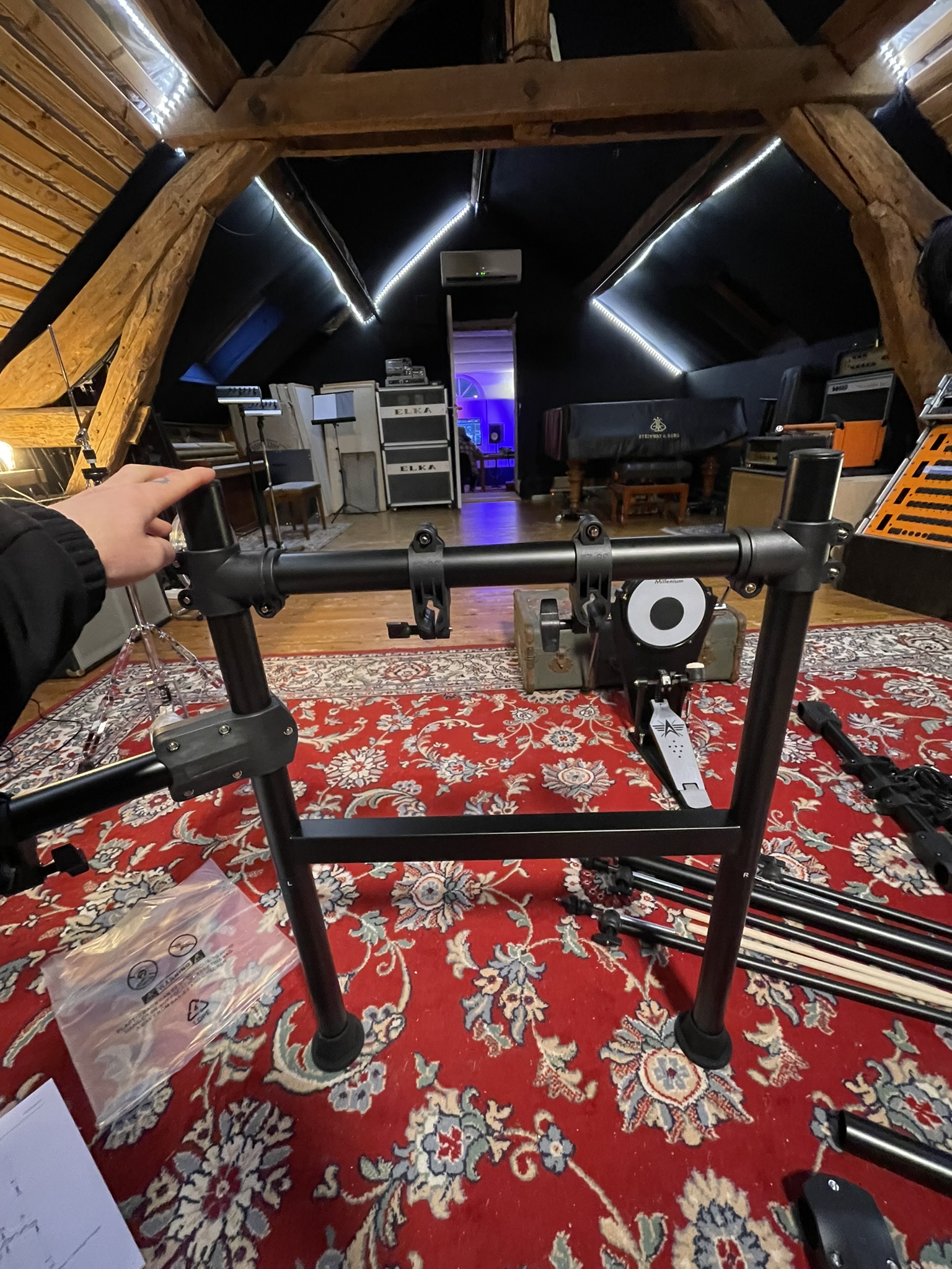Le pack inclut la pédale de grosse caisse, le rack métallique à quatre pieds et l’ensemble du câblage nécessaire, ce qui en fait une solution prête à l’emploi pour les débutants.