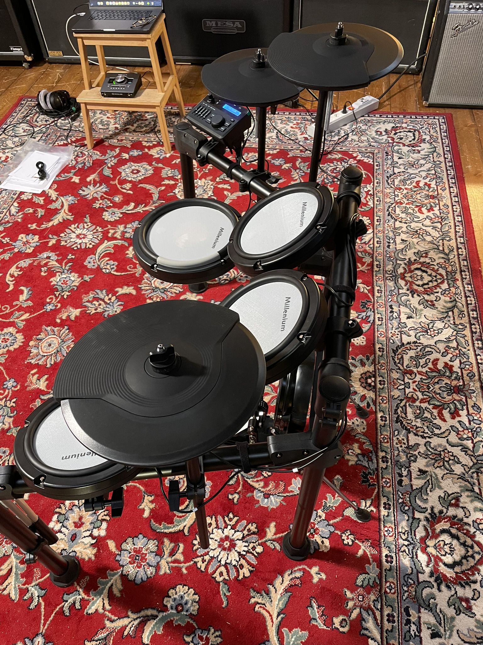 À 359 €, le Millenium MPS-350 offre un kit 8 pièces mesh, Bluetooth, 500 sons et rack complet. Idéal pour débuter, il souffre néanmoins d’un bruit de kick gênant et d’un module surchargé de réglages peu opérationnels.