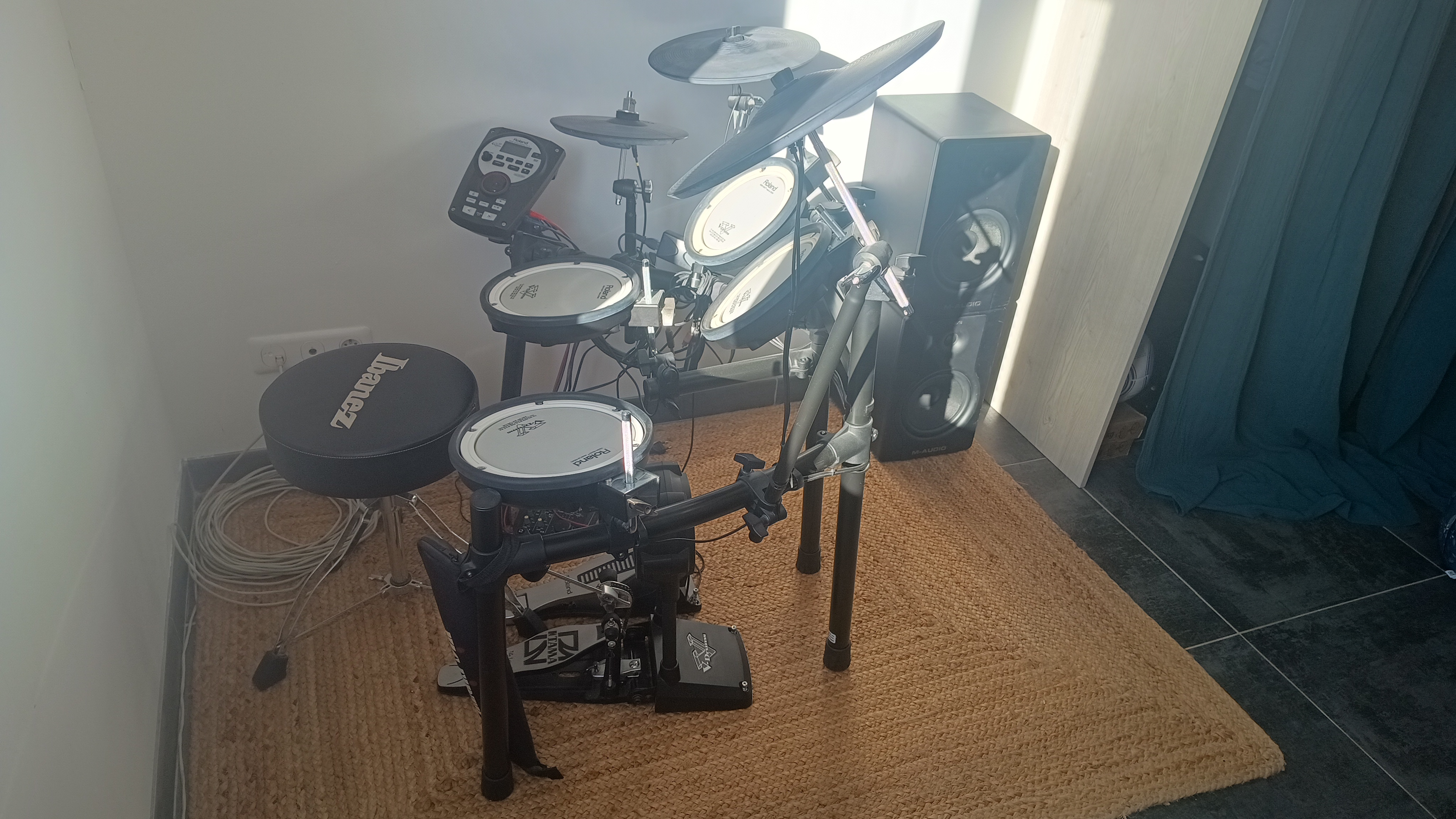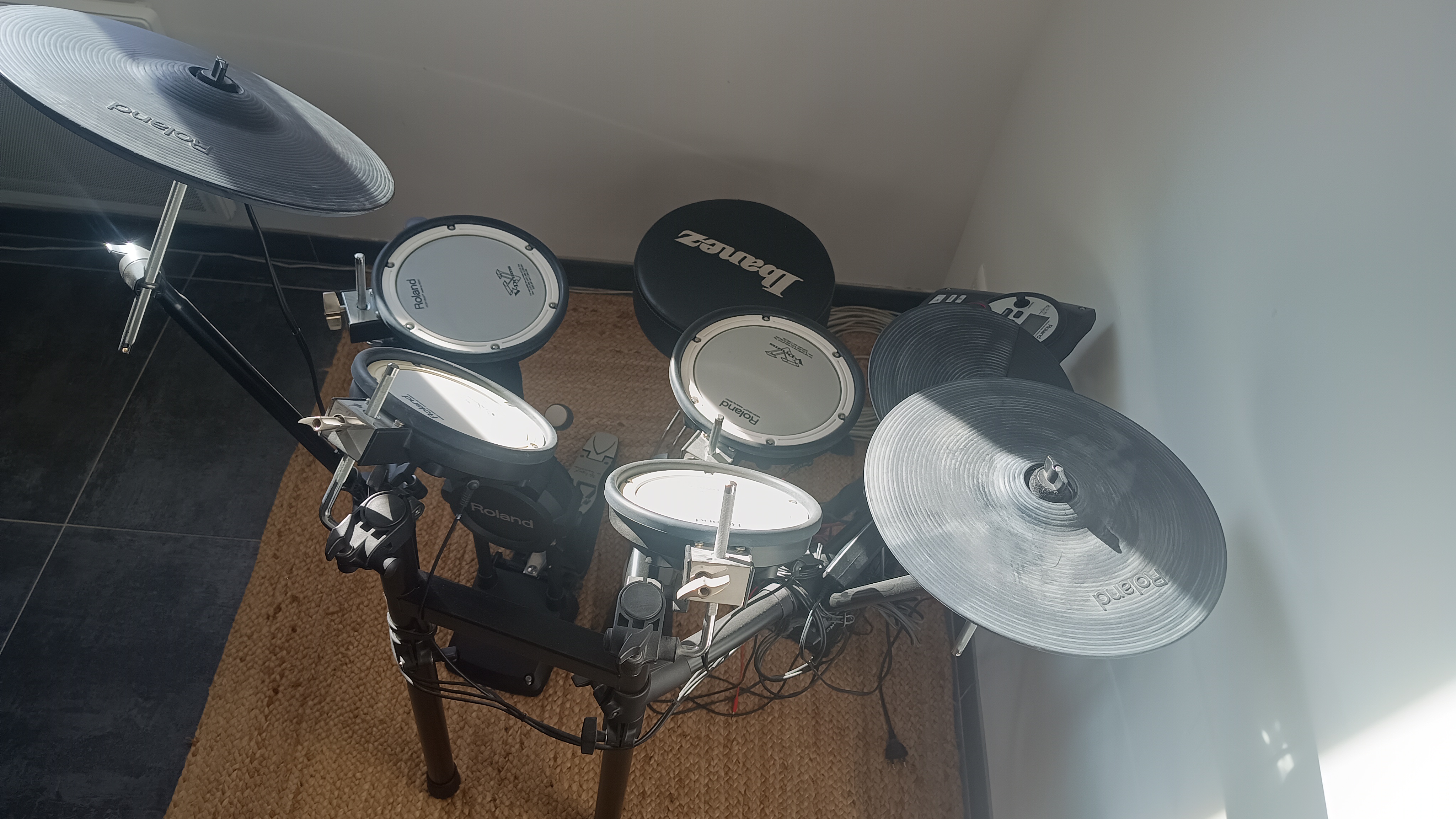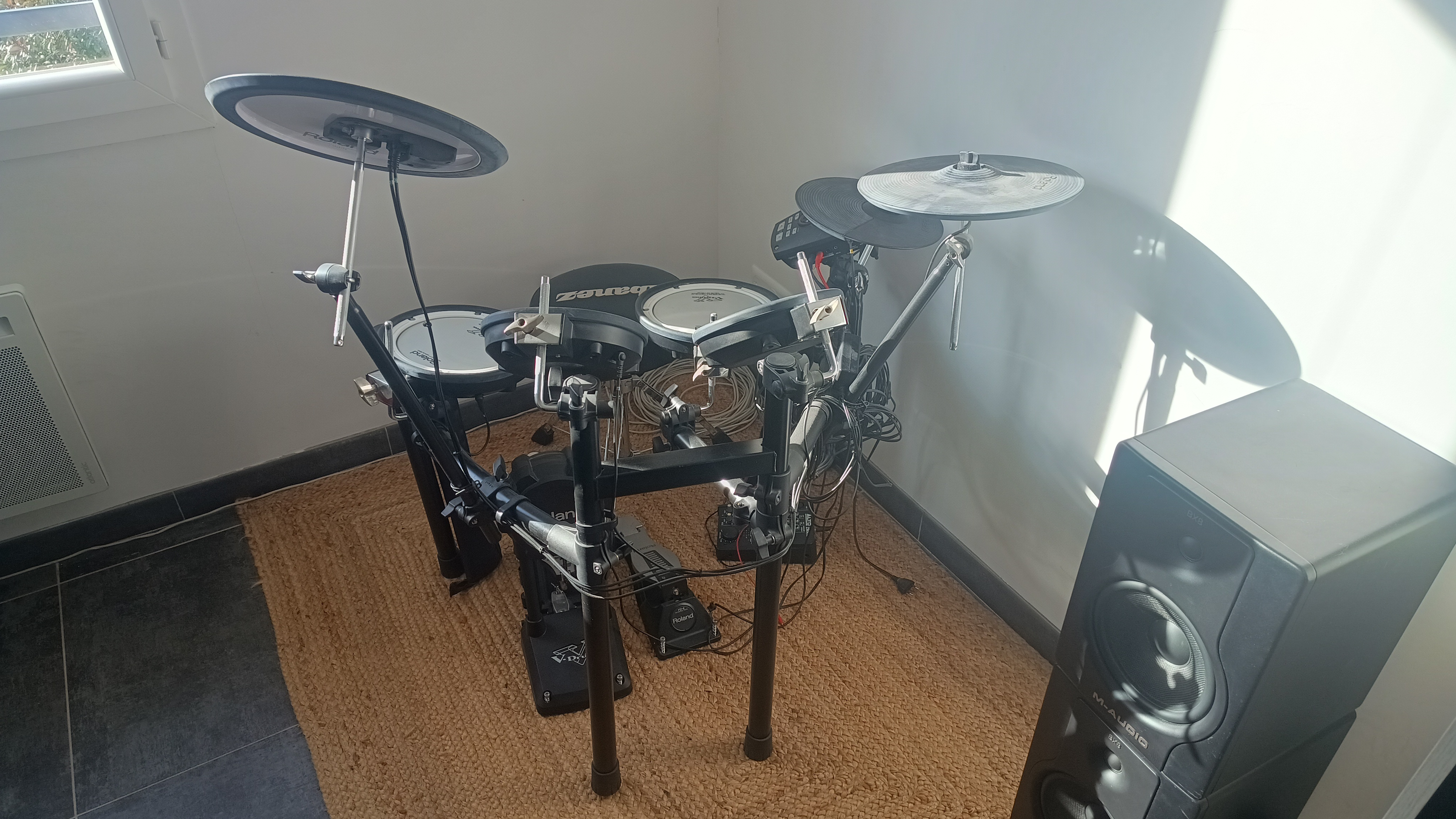 Pas d'entrée midi. Les cymbales bien-sûr ! qui sont en caoutchouc (trop bruyant).