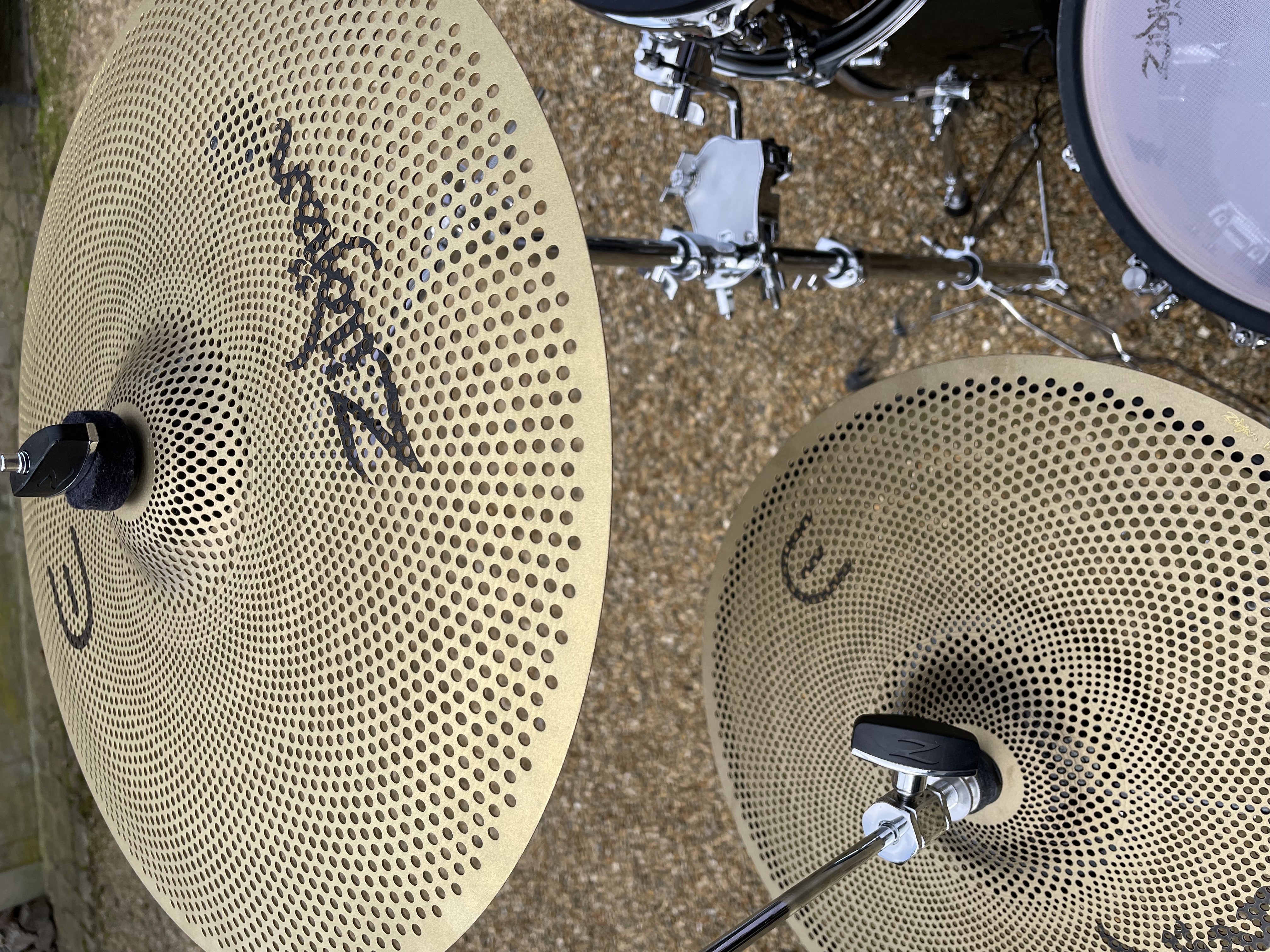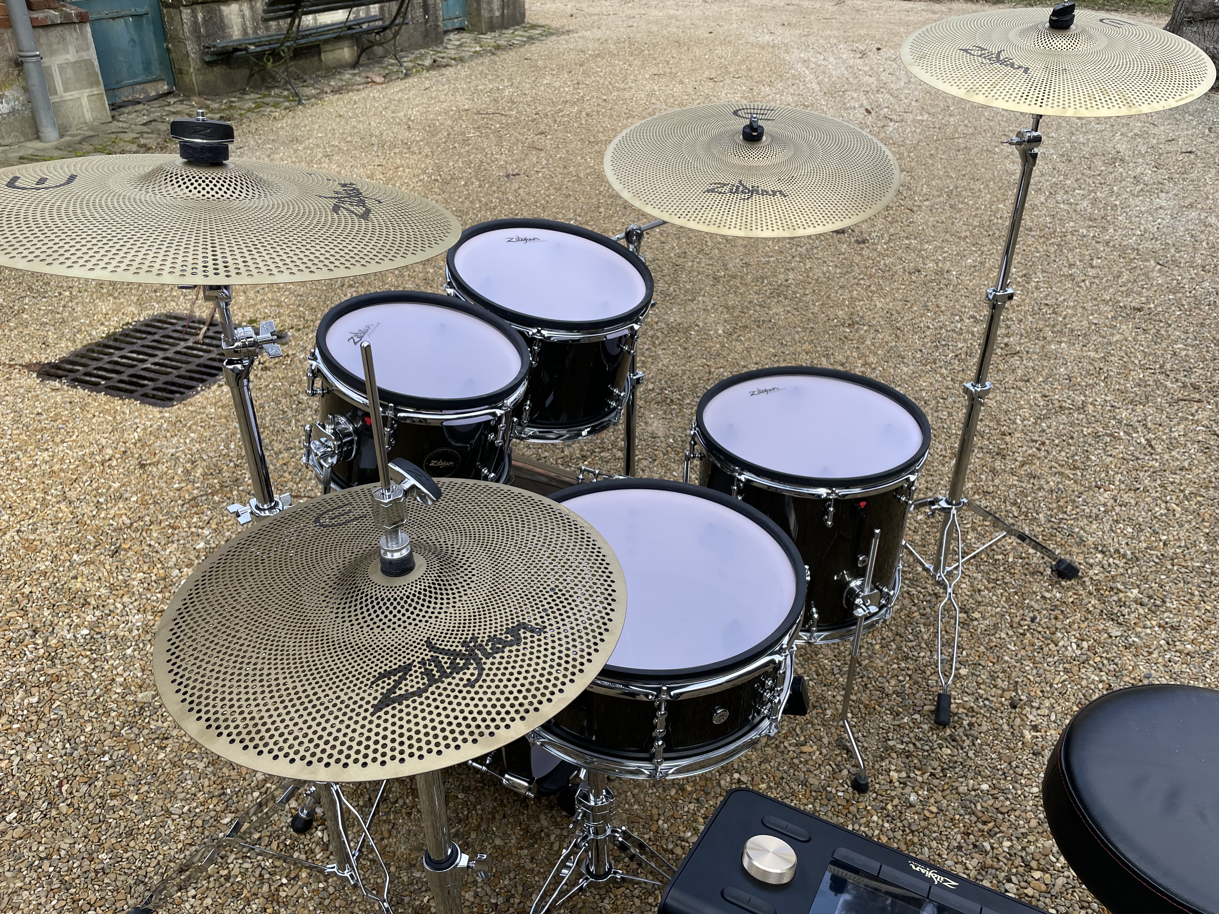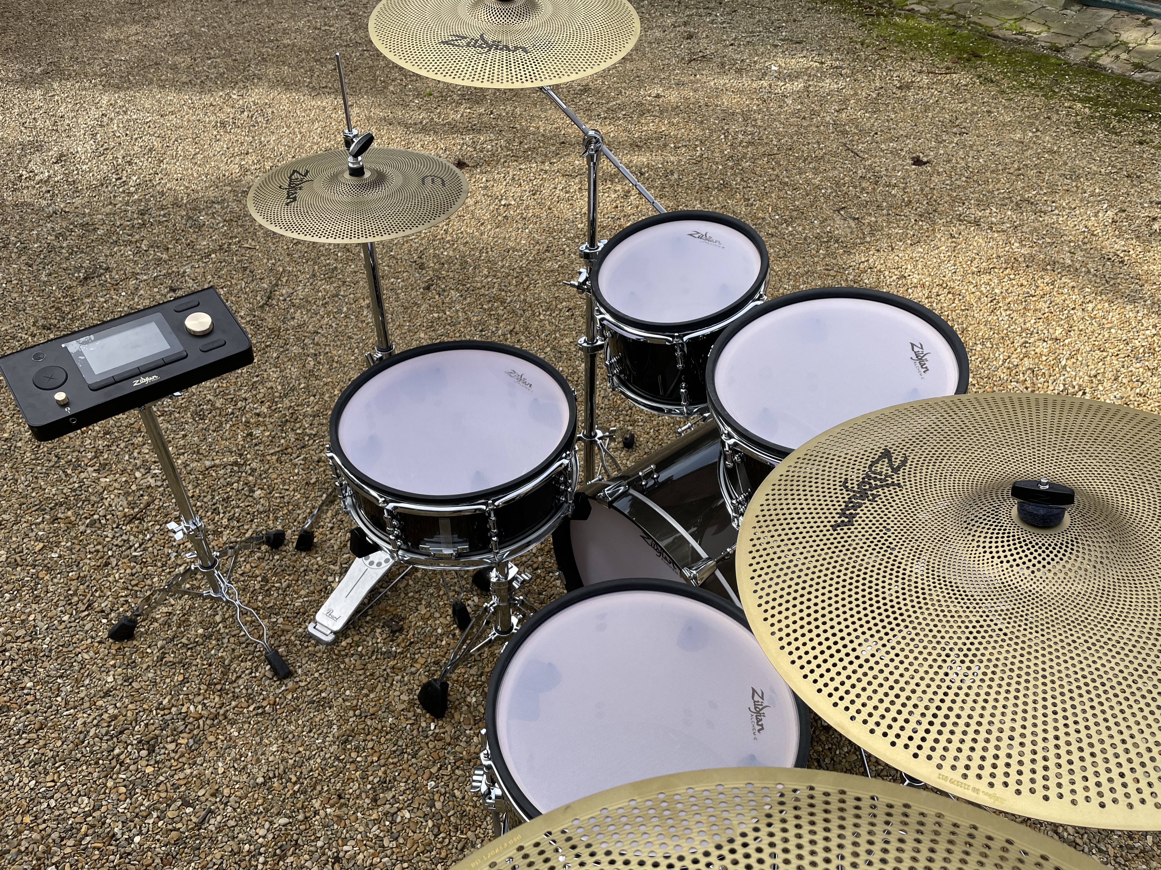 Les cymbales E-Family, en métal véritable, sont réalistes, avec un choke efficace sur toute la circonférence. Côté hardware, les stands cymbales fournis sont corrects mais restent entrée de gamme ; le tilter hi-hat Zildjian dédié est un vrai plus.