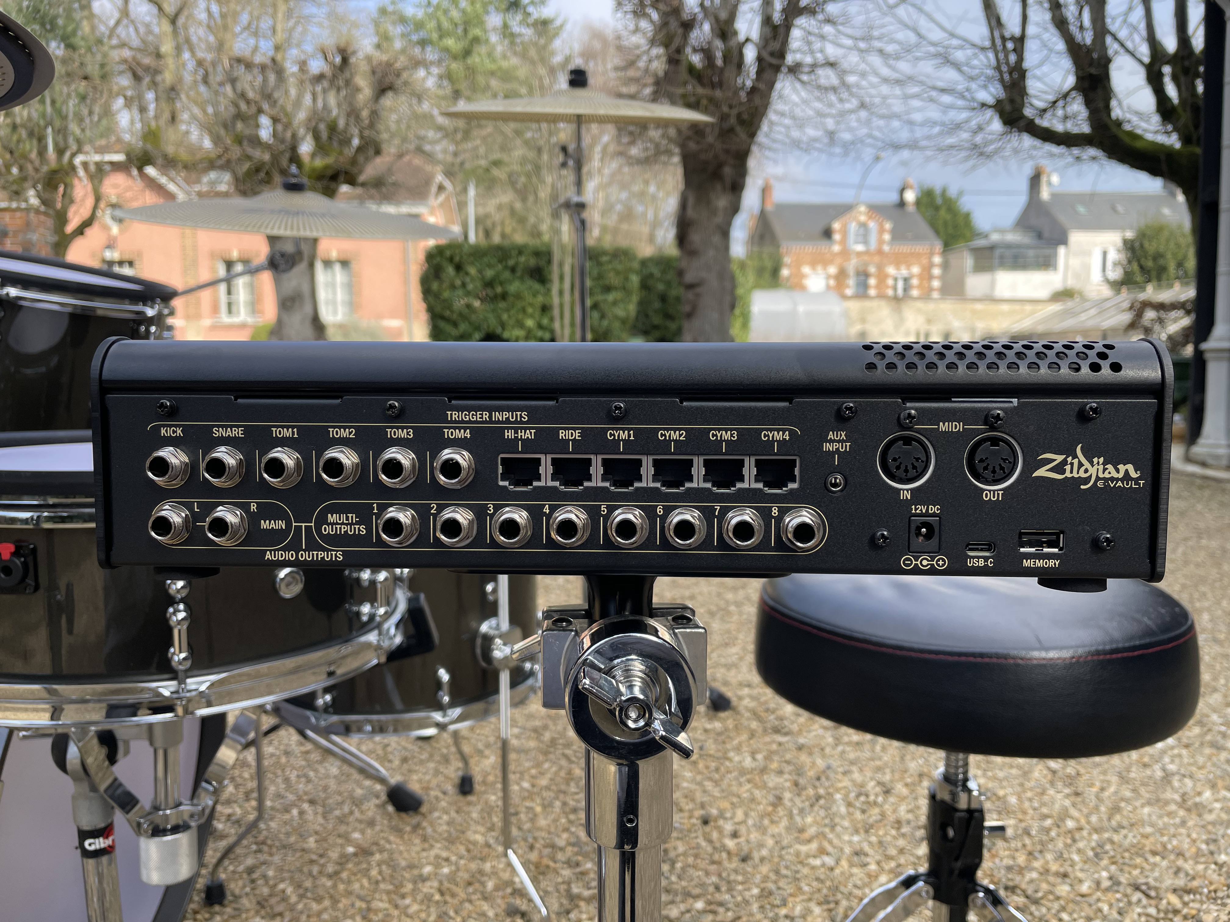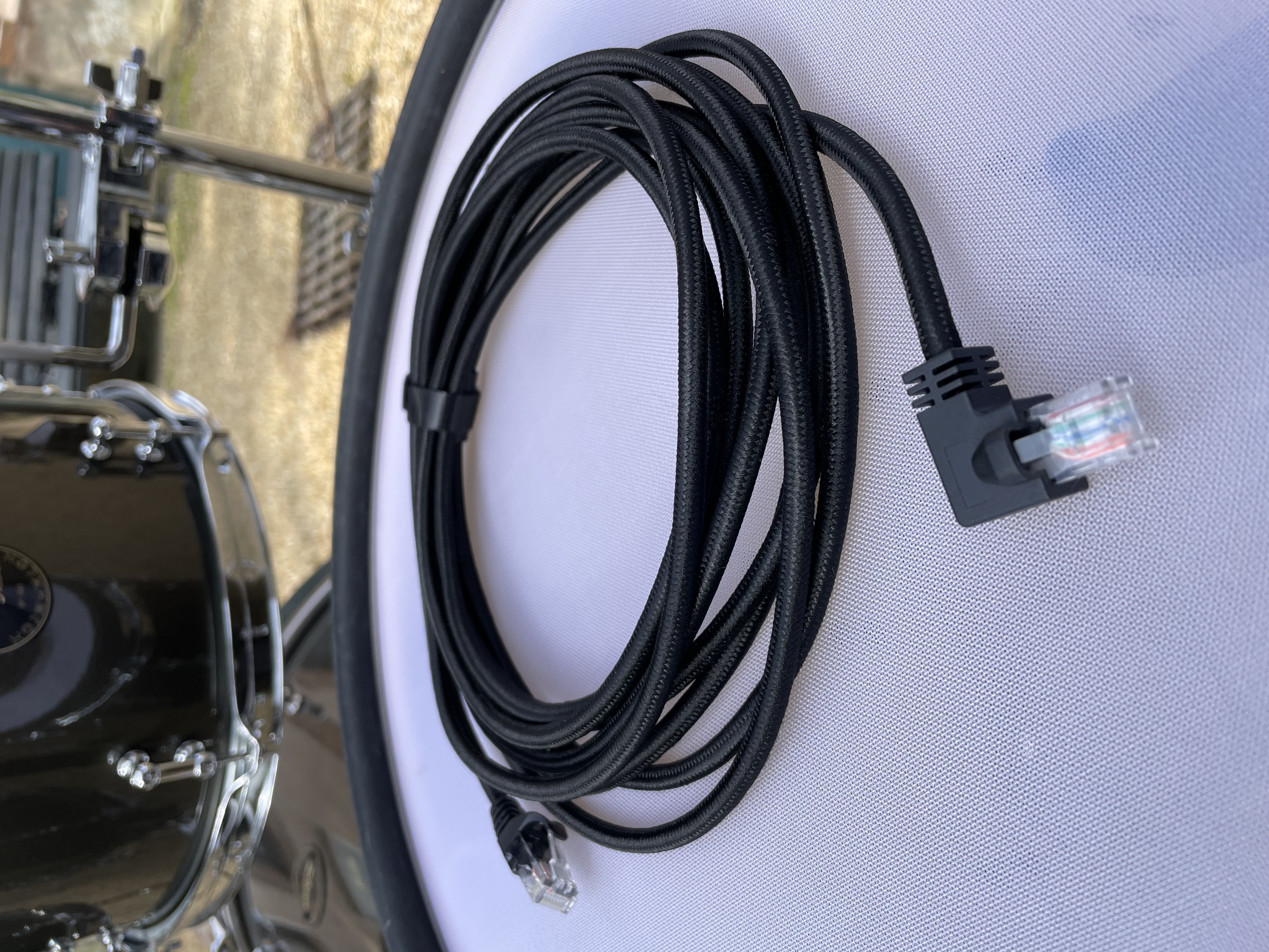 Lors de mon test en conditions réelles, le premier assemblage a demandé environ 30 minutes. Une fois le kit déjà monté et rangé en flight-case, le remontage descend facilement sous les 20 minutes. Ce qui prend le plus de temps – et pose le plus de problèmes – reste la gestion des câbles : il y en a beaucoup (RJ45 pour chaque cymbale + TRS pour les fûts), et les gaines nylon tressées, bien que de bonne qualité, sont trop rigides. Cela complique sérieusement le branchement/débranchement, surtout les prises RJ45 aux sorties cymbales et pads. Il faut clairement un coup de main pour y arriver sans frustration.
