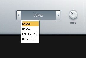 Voici un premier exemple de groove Close, puis alternativement avec Stereo Overhead, Mono Overhead, et Mono Room, et pour finir un mélange de toutes les prises. Précision : on n’entend ici que la couche de sons acoustiques échantillonnés. Chaque instrument dispose d’un réglage d’accord, selon les cas de sélection entre deux micros (top/bottom ou out/sub), de proportion entre Overhead et Room, d’un Trash ajoutant de la saturation, et d’une enveloppe trois segments (A, H, et D).