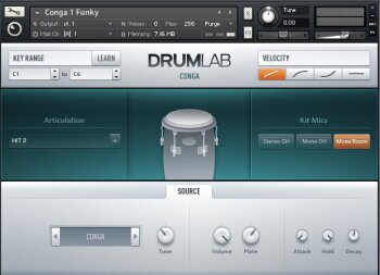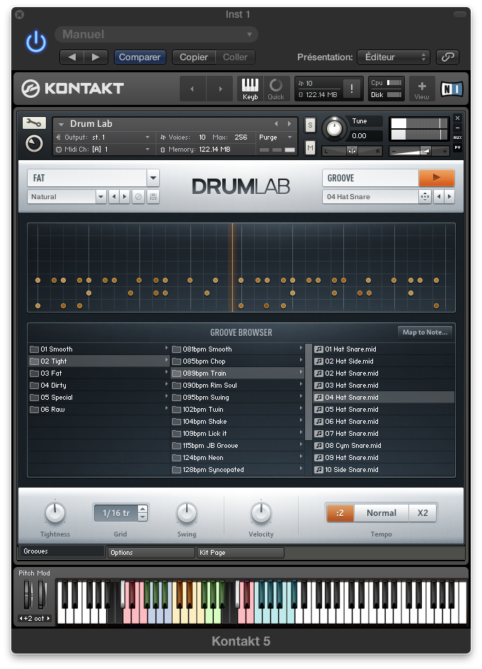 On trouvera donc la banque sur le site de l’éditeur, au tarif de 99 euros, conçue pour Kontakt 5 et Kontakt Player 5, spécifications, compatibilités étant donc celles de ces derniers logiciels. Le poids total est de 2,6 Go (avec la compression native de Native…) pour 26 500 échantillons. Elle est matérialisée sous la forme d’un unique instrument .nki, DrumLab, qui regroupe tous les outils nécessaires au sound design ainsi que la partie séquenceur rythmique. Mais on dispose aussi de la plupart des éléments sous forme de programmes individuels, offrant les mêmes possibilités que celles incluses dans l’interface du programme principal. Idéal pour rajouter une deuxième caisse claire, ou une cymbale supplémentaire, d’autant que l’éditeur propose une transposition plus étendue que celle disponible via l’interface (voir plus bas).