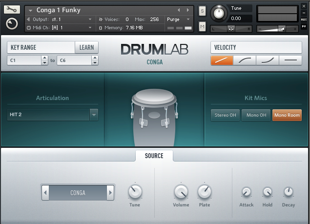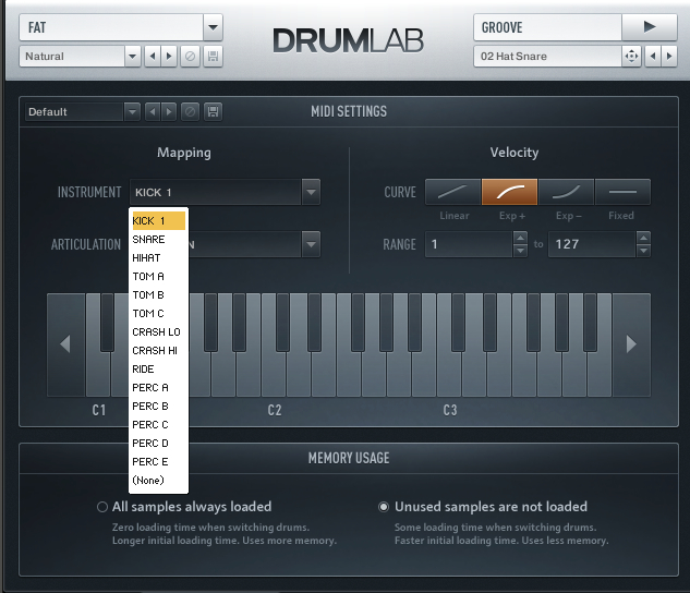 La seconde page offre quelques réglages d’options, tels que le mapping des sons sur le clavier, les courbes de vélocité, la plage de réaction à la vélocité (de 1 à 127) et ce par instrument et par articulation dudit instrument, s’il vous plaît, merci m’sieur Native. Une autre option concerne la façon dont l’instrument va utiliser la RAM disponible dans l’utilisateur hôte, plutôt intéressant pour les petites configurations, même si Drumlab n’a pas une empreinte si énorme sur la mémoire.
