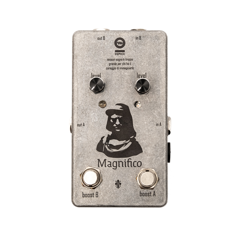 Le Magnifico Artur Menezes Signature du fabricant italien Dophix est une pédale de boost pour guitare. C’est le modèle signature du guitariste brésilien Artur Menezes. La pédale intègre deux circuits de boost identiques avec leurs entrée et sortie ainsi que leur réglage de niveau et leur footswitch. Un portrait de Laurent de Médicis dit « Le Magnifique » orne la face avant de la pédale.