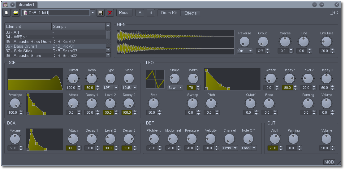 Enfin, drumkv1 est un sampleur et synthé de batterie avec effet stéréo.