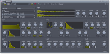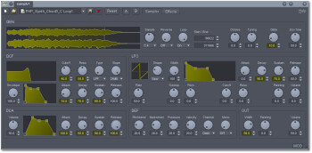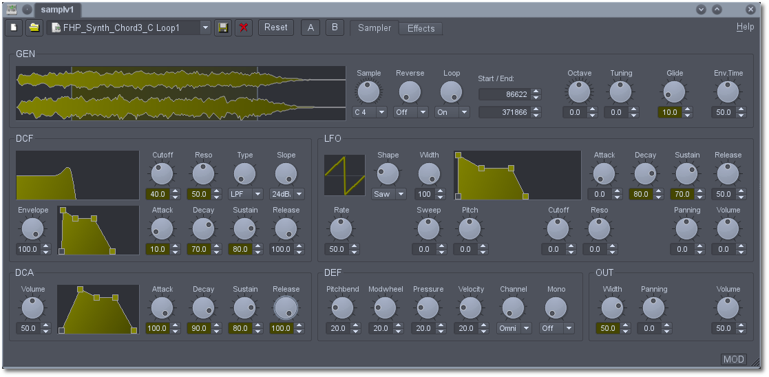 Samplv1 est un synthé sampleur polyphonique, également avec effet stéréo proposant les mêmes outils de synthèse que le Synthv1.