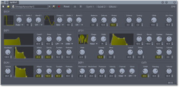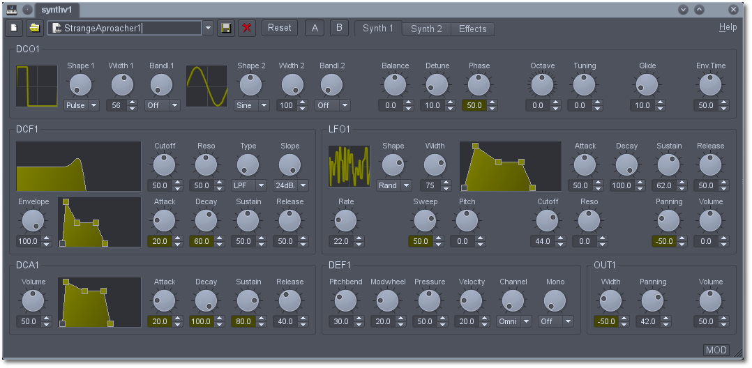 Synthv1 est un synthé soustractif polyphonique à 4 oscillateurs avec effet stéréo. Vous y trouverez différents réglages pour les LFO, DCF, DCA, ainsi qu’une section de sortie avec réglages de la largeur stéréo, volume et panoramique.