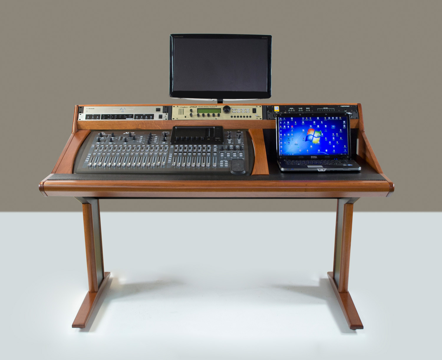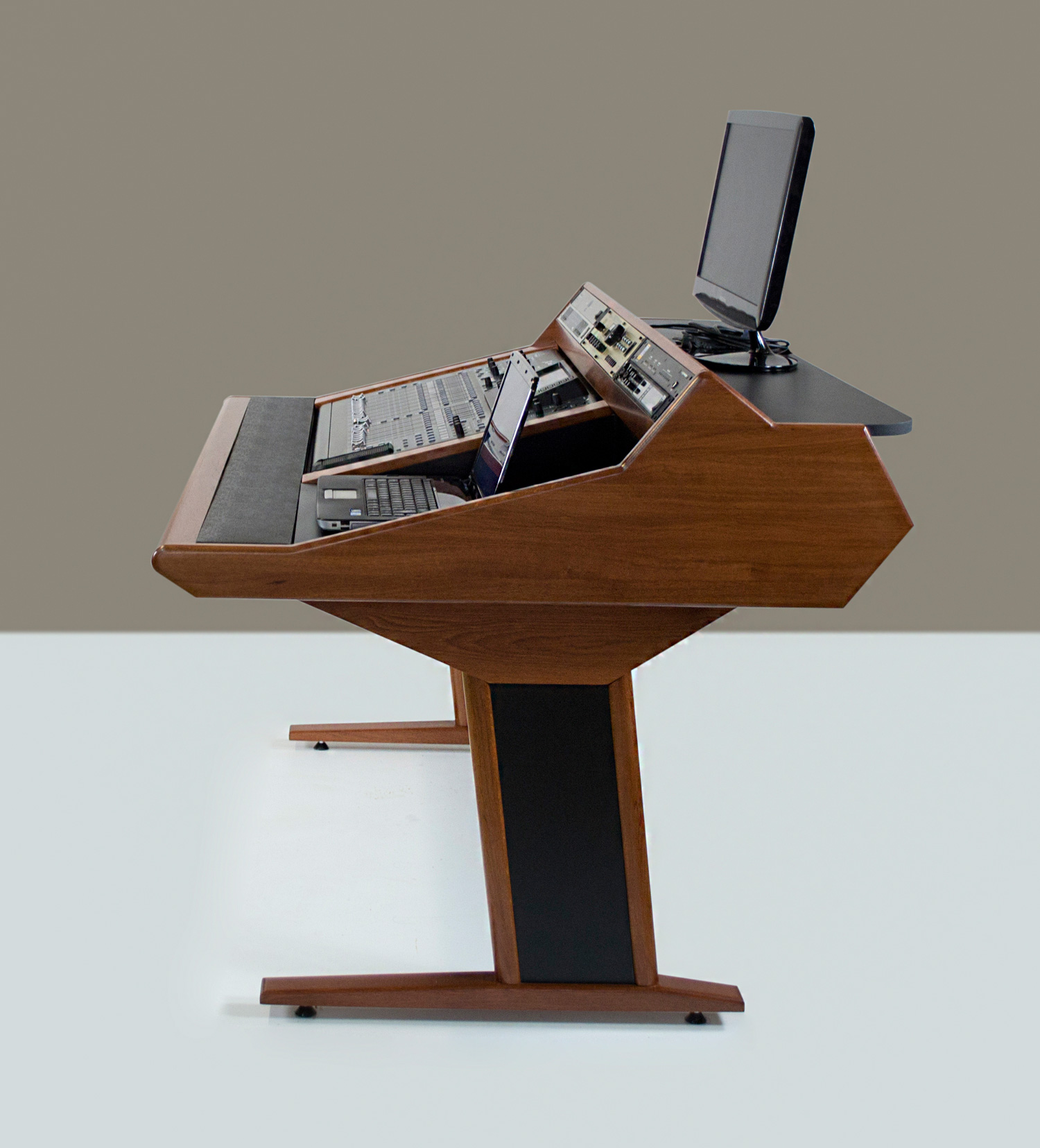 Le panneau principal est organisé en plusieurs sections qui accueilleront votre table de mixage, 6 processeurs au maximum (3×2 racks), et un dernier espace de 158 × 110 pourra recevoir un ordinateur portable ou un pad…