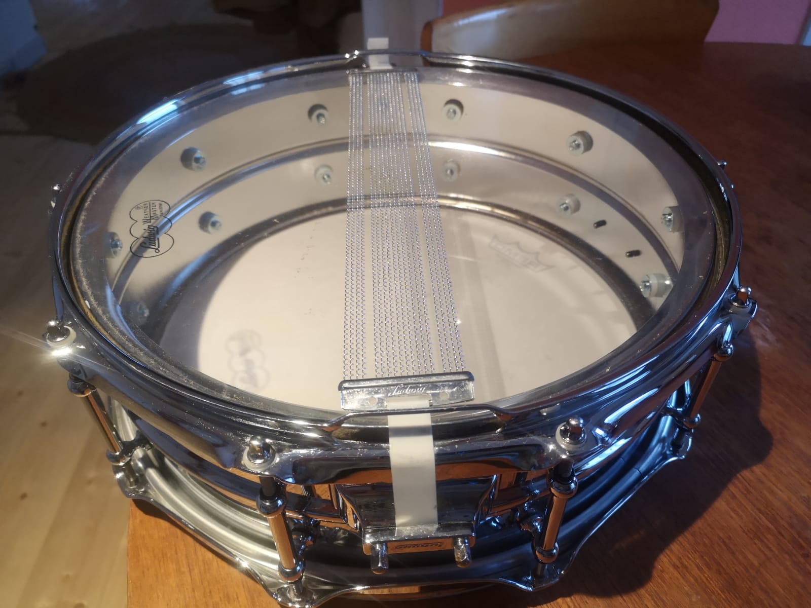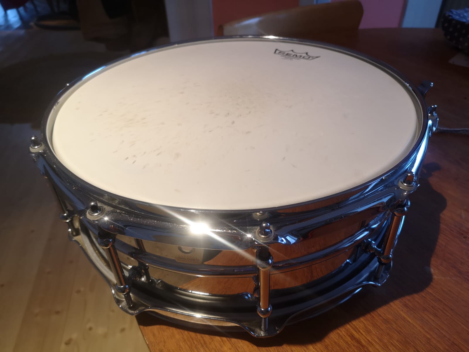 10 tirants "tube lugs", ré-édition des années 90, plus produite depuis, avec housse en bon état et Remo Ambassador peu jouée, et un muffle.