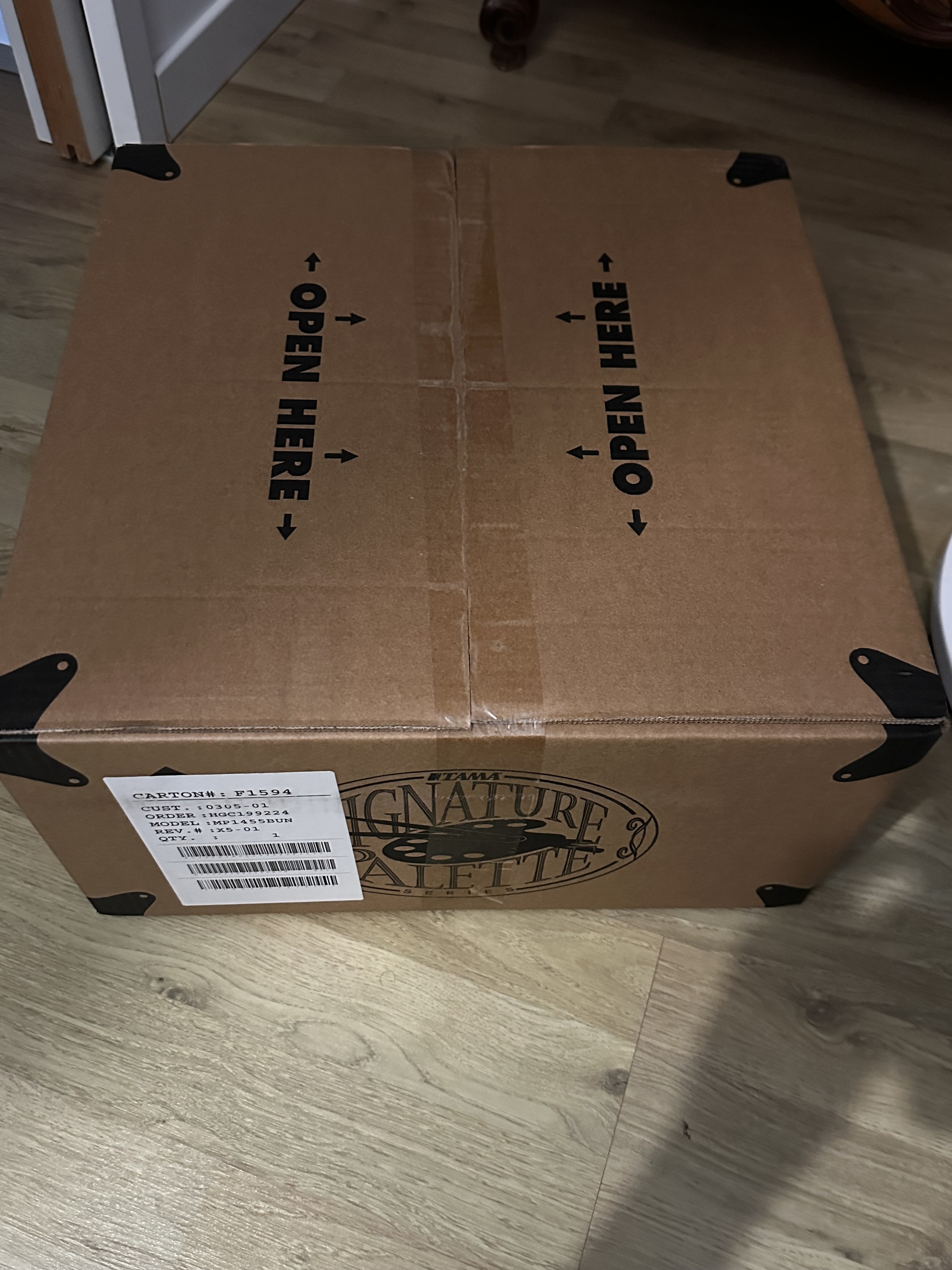 (La photo présentée n'est pas celle qui est dans le carton (oui j’en ai deux), mais le carton est bien chez moi, avec la caisse claire à l’intérieur!)