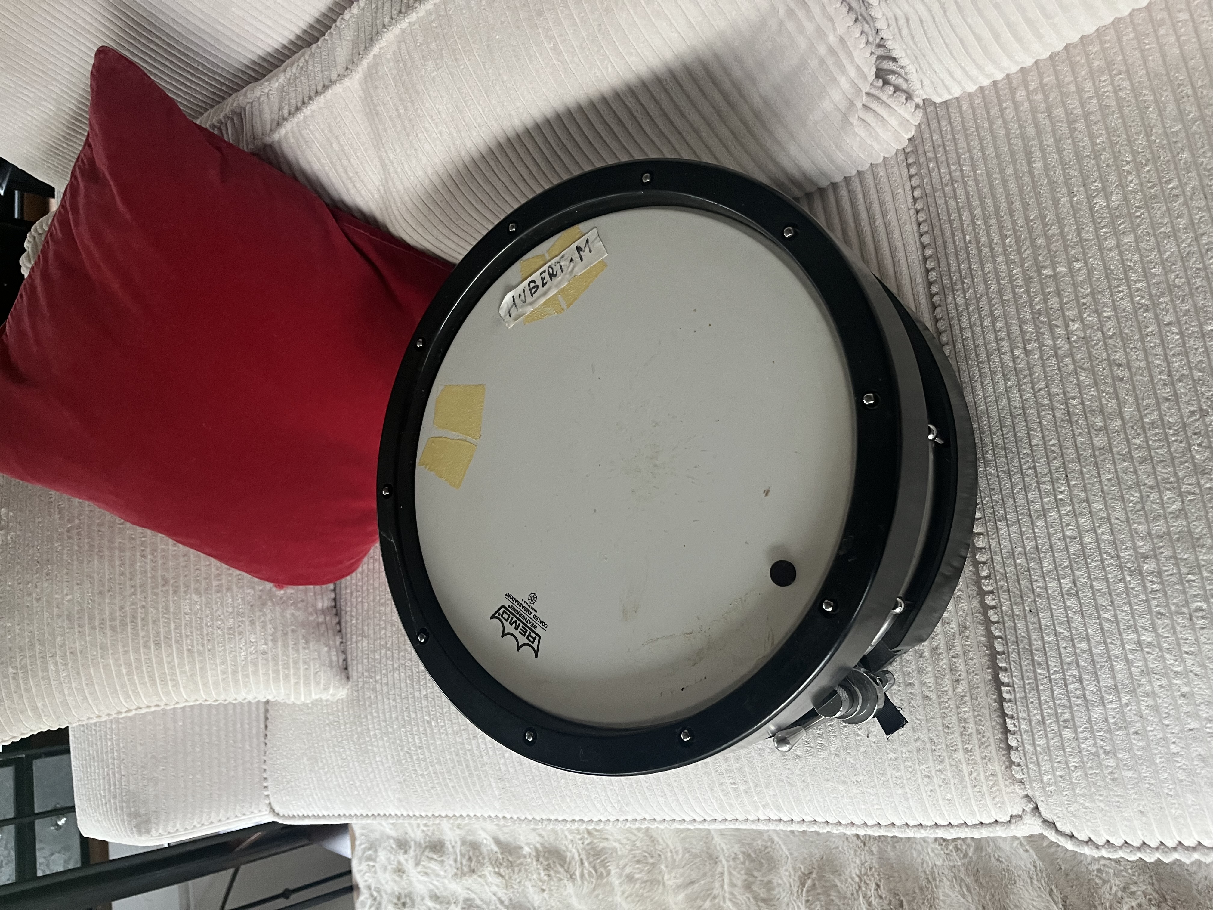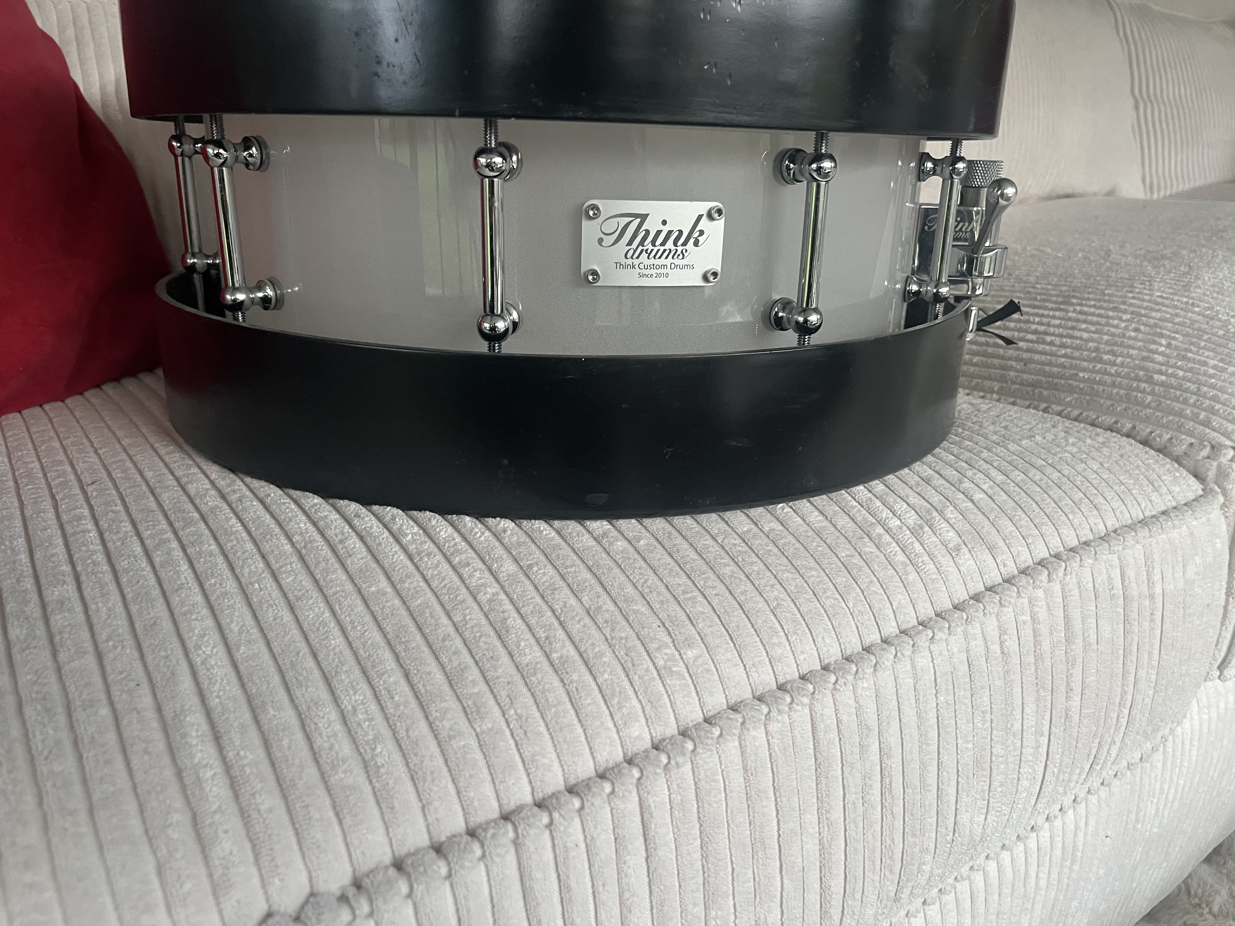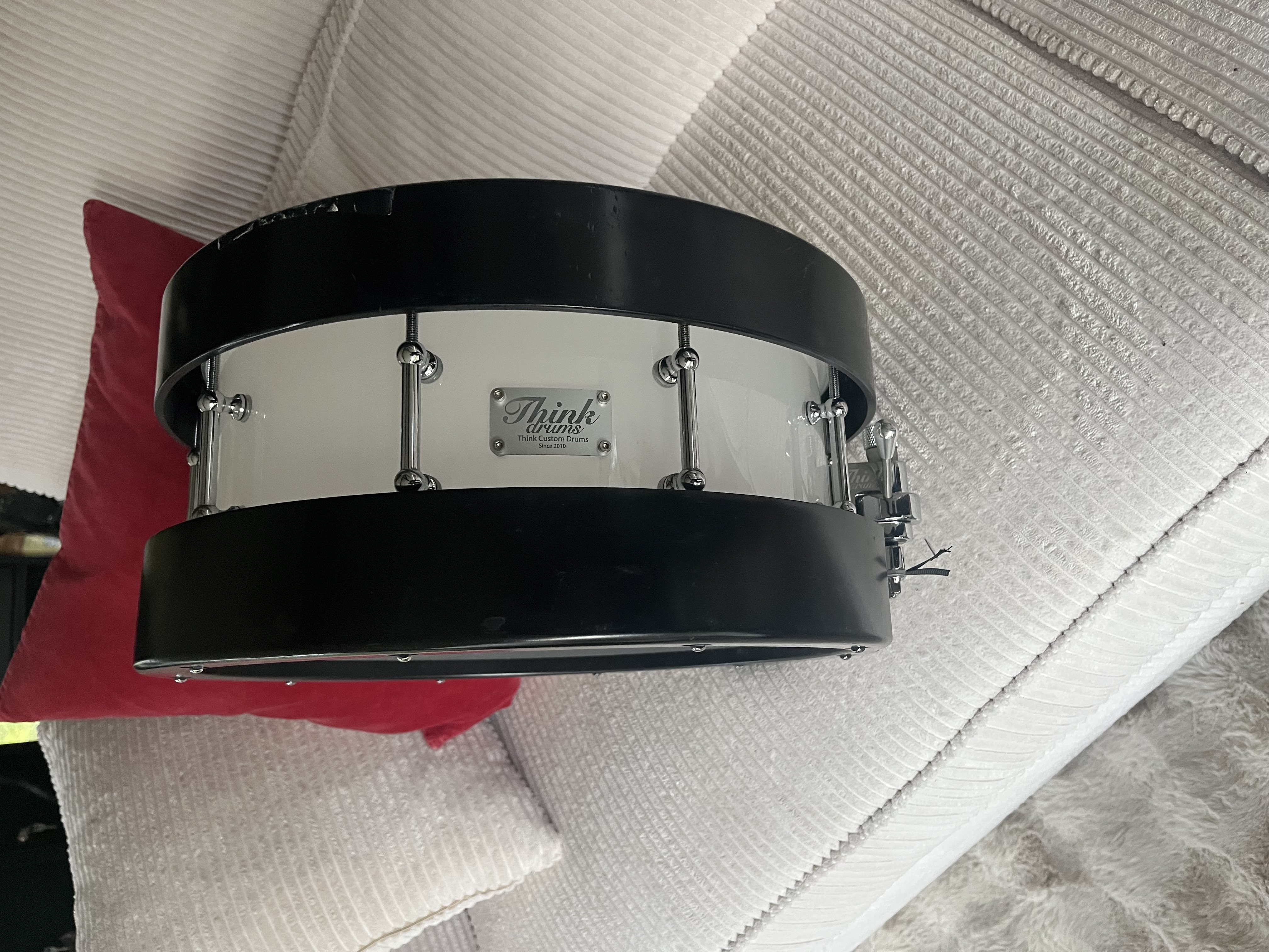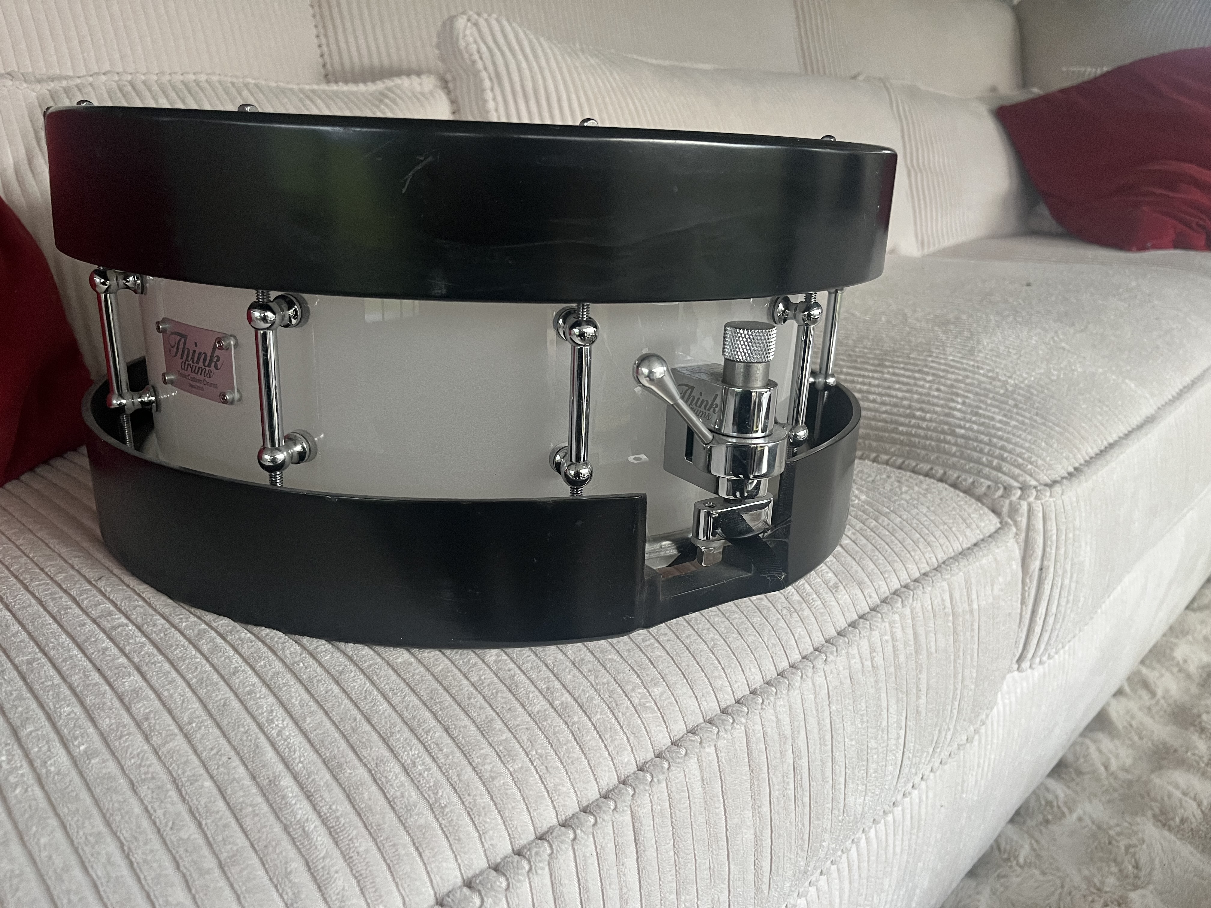 Caisse claire Acrylique opaque blanche 14X5,1/2 avec cercle Bois noire sur mesure sons très puissant !! Je ne m'en suis servi que trois fois en studio....
