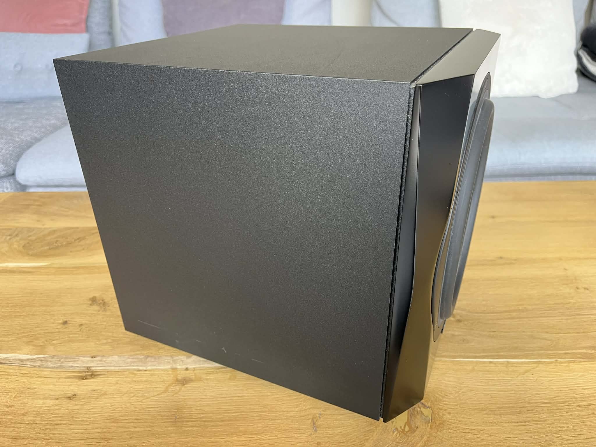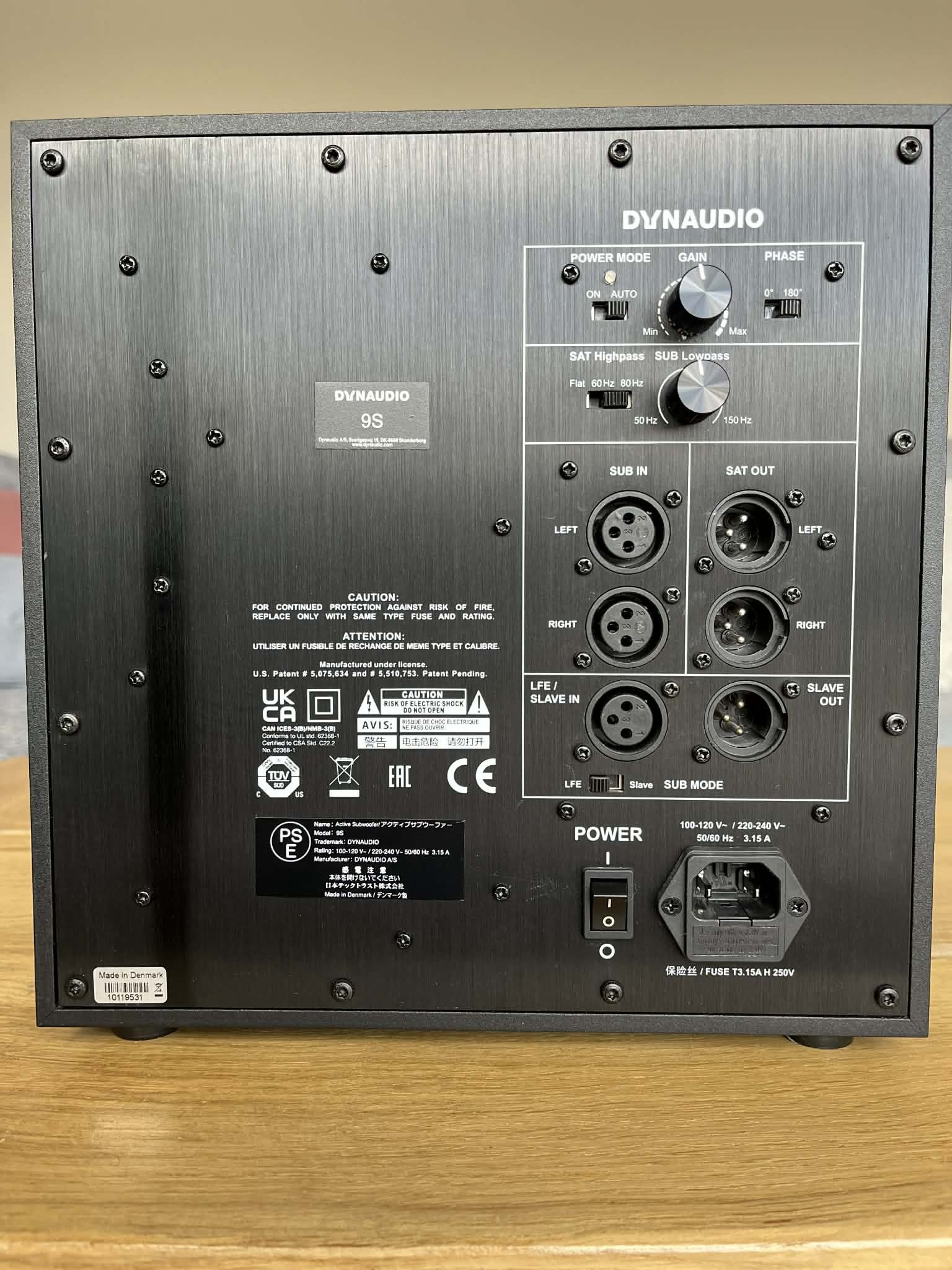 Dynaudio 9S. Caisson de basse actif. Amplification : 300 W Class-D. Haut-parleur longue porte 9,5" (24 cm). Réponse en fréquences : 22 – 175 Hz (± 3dB). Fonction maître / esclave. Filtre passe-bas reglable. SPL Max 1 m (CEA-2010) : 106 dB. Fréquence crossover : 50 – 150 Hz. HP : 28 cm (9,45”) longue excursion MSP. Connecteurs E/S : XLR symétrique. Sortie SAT (satellite) avec filtre passe-haut commutable. Auto ON/OFF. Dimensions (H x L x P) : 276 x 266 x 320 mm. Poids : 10,5 kg.Facture 04/2023.