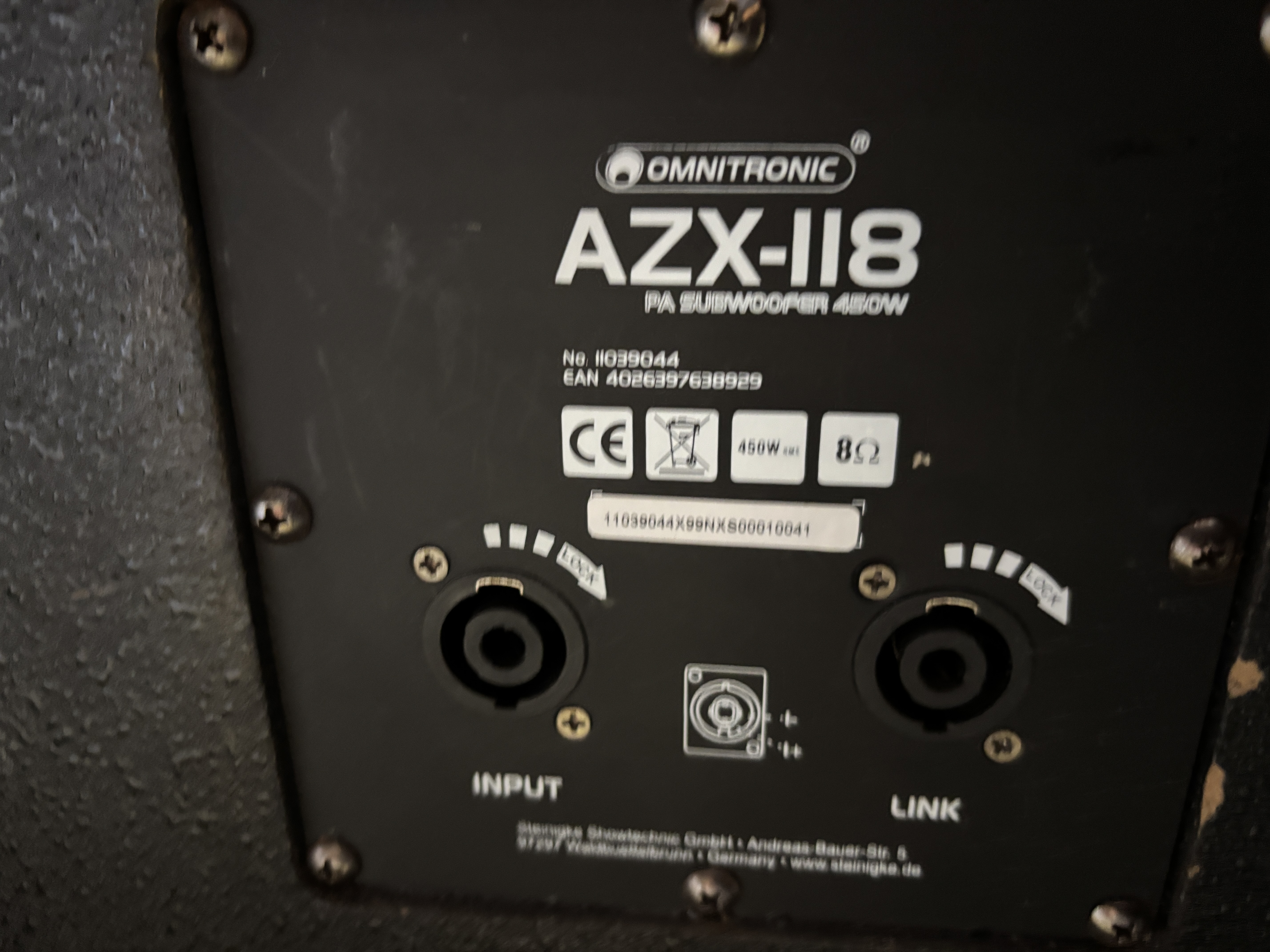 Vends 2 caisson AZX-118Le caisson de basses passif Omnitronic AZX-118 présenté ici est doté d'un woofer de 18 pouces capable de déplacer un grand volume d'air. En résulte des graves profonds et précis. Il affiche une puissance RMS de 450 watts (900 watts en crête). Polyvalent, le AZX-118 peut être posé au sol ou monté sur un pied. Il fournit une sérieuse dose de basses, et ce quel que soit l'endroit où vous le placez !