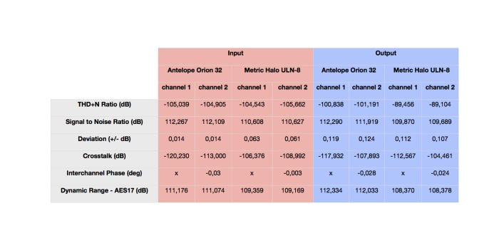 Pour essayer cette interface, nous avons fait une série de mesures avec notre Audio Precision 515 et nous avons comparé les mesures à notre Metric Halo ULN-8. Aussi, nous avons fait notre habituel « Loop Back Test » qui consiste à brancher les sorties sur les entrées, jouer un fichier audio et l’enregistrer une fois passé par les convertisseurs A/N et N/A. Un logiciel compare alors le fichier original et le fichier enregistré et établit un niveau de corrélation entre les deux. Plus ce niveau est élevé, plus le fichier enregistré est proche de l’original, et donc, mieux c’est.