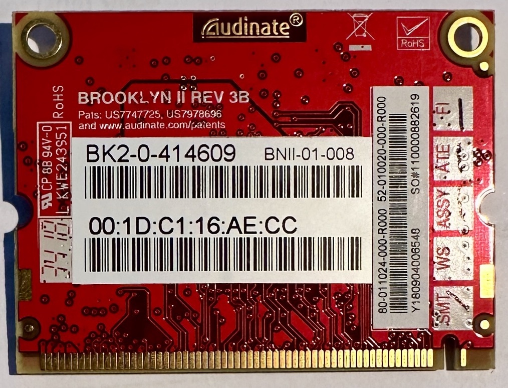 Carte Audinate Brooklyn II pour réseau Dante. La carte s'est mise en mode "safe mode" et nécessite d'être débloquée via le logiciel Dante Recovery et réinstaller le firmware.