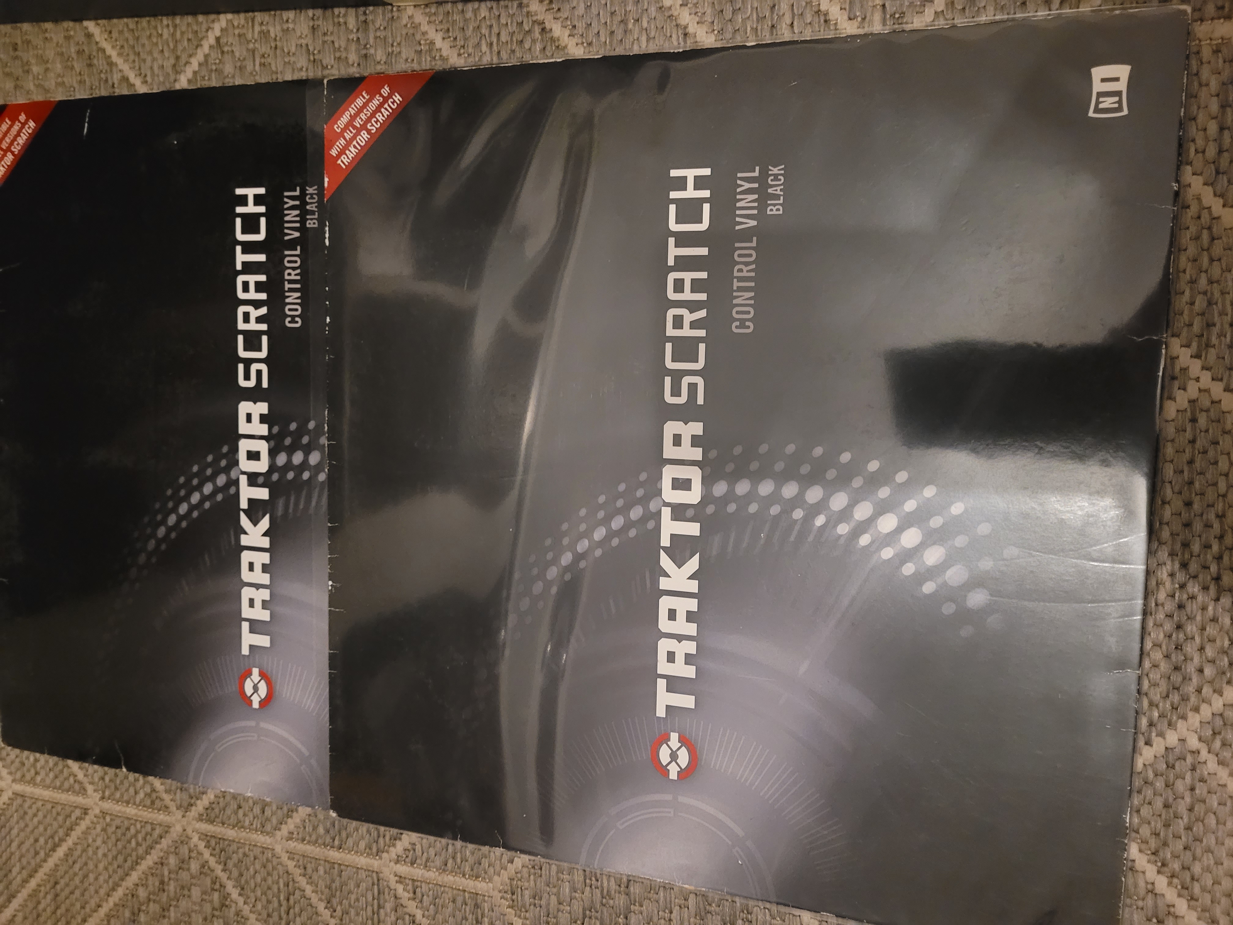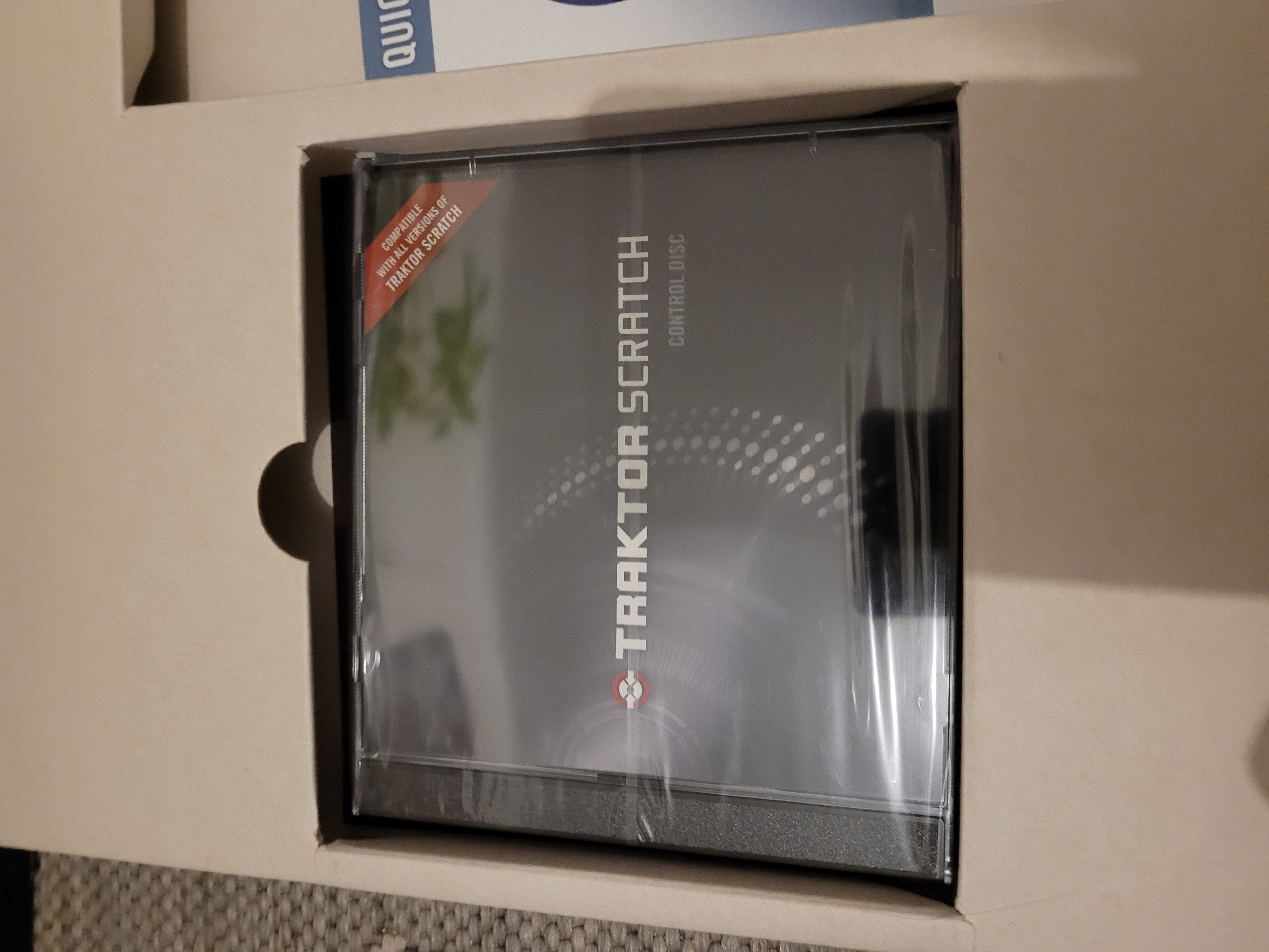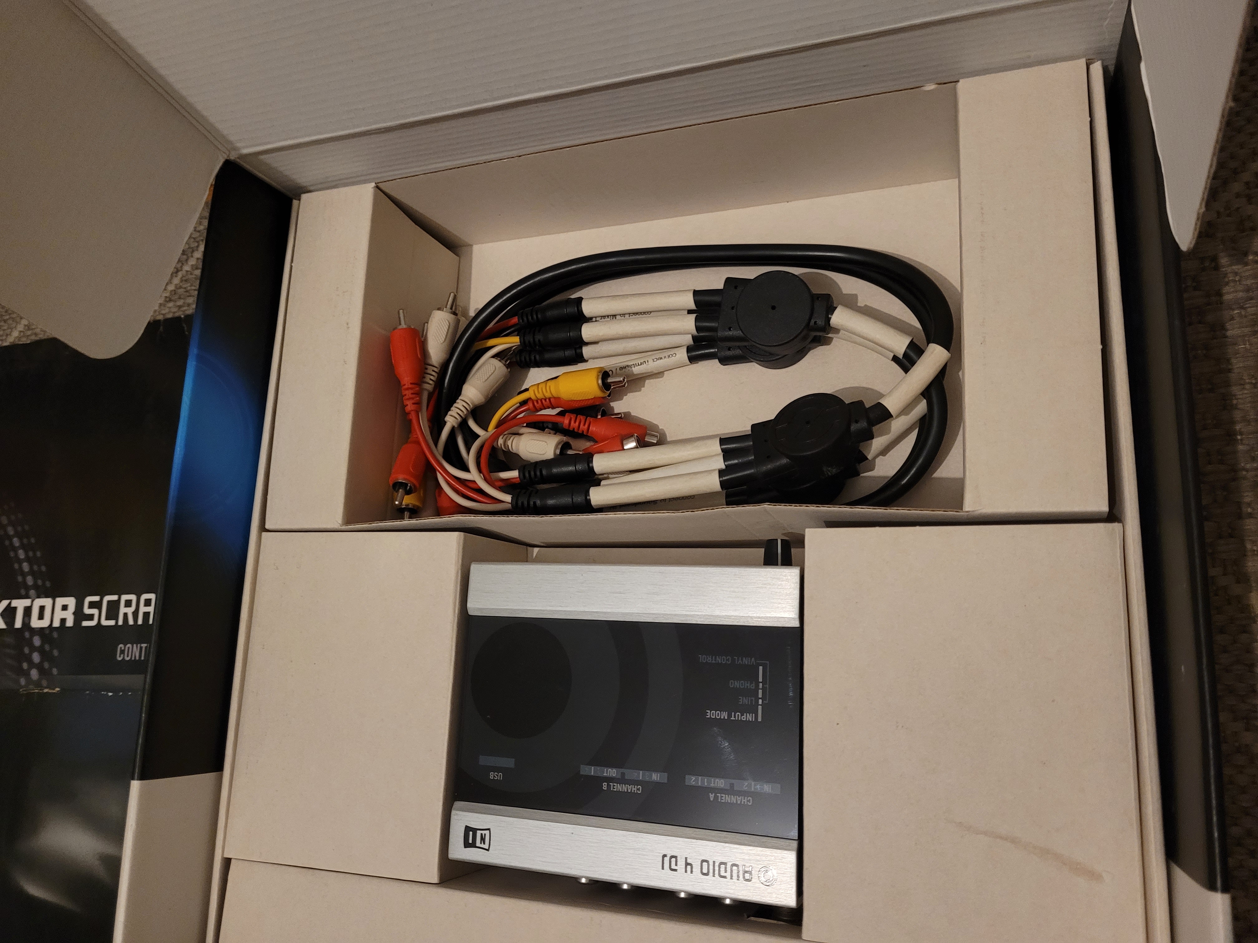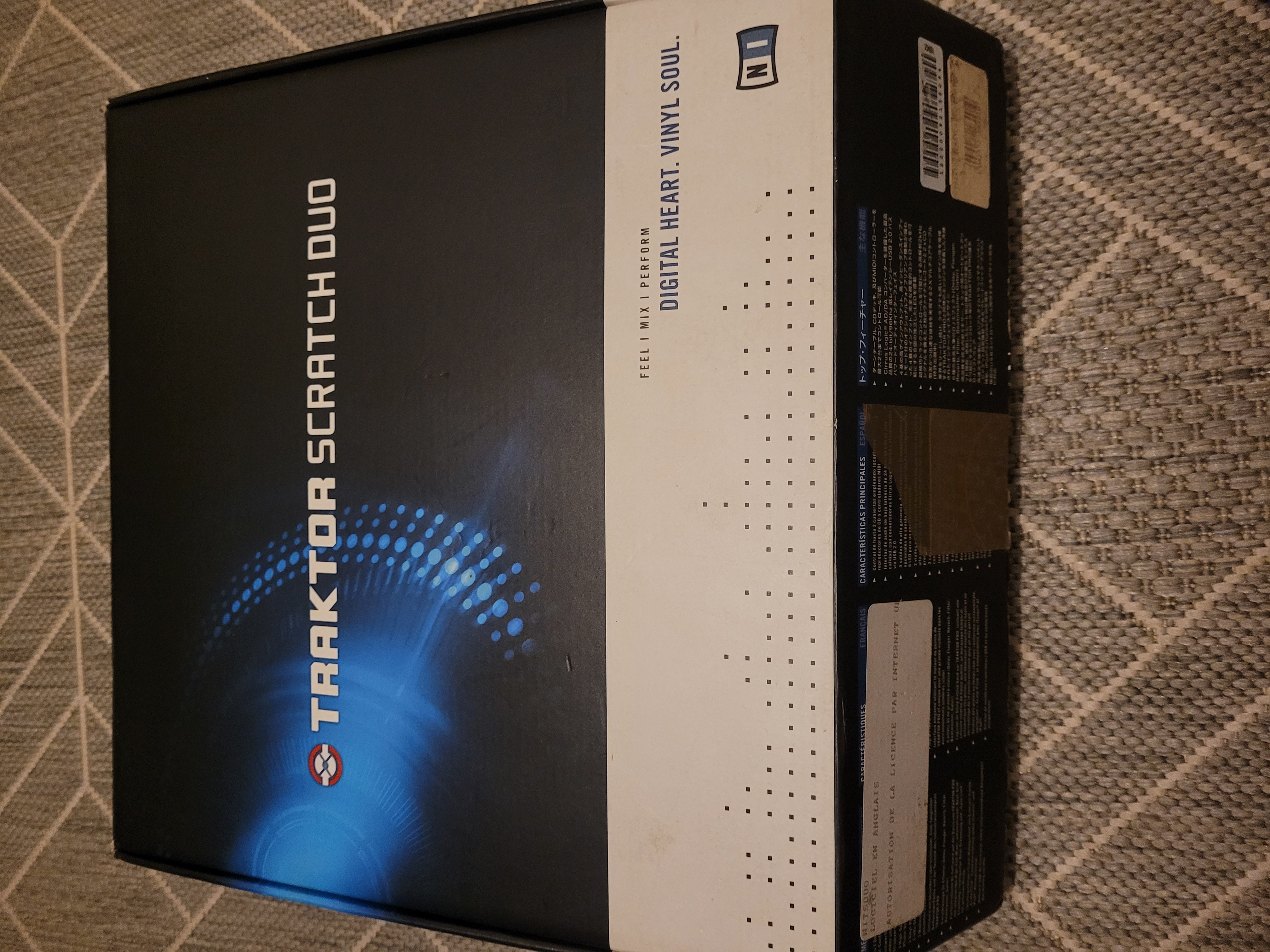 J'ai trouvé et négocié un pack Traktor Scratch Duo dans lequel il manquait la licence de Traktor à bas prix (de fait, hé hé... la mine du vendeur....) dans un magasin du type Machin Cash véreux que je ne nommerai pas. Je miroitais uniquement la carte son et les vinyles time-codés pour bidouiller sous Max/MSP et avoir une petite carte son USB permettant de numériser correctement mes vinyles. Les quatre entrées (oui, bon 2x2 stéréo mais 4 en tout et en mono, ça peut servir me disais-je, quitte à bricoler avec des adaptateurs jack/RCA si besoin...) m'avaient déjà séduits auparavant.