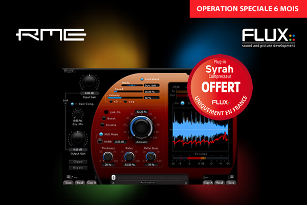 Si vous achetez un des produits suivants de marque RME chez les revendeurs agréés dans l’hexagone, vous recevrez gratuitement une licence du plug-in de compresseur Syrah de Flux:: d’une valeur de 150€ ainsi que 3 mois d’essai de tous les plug-ins de l’éditeur :