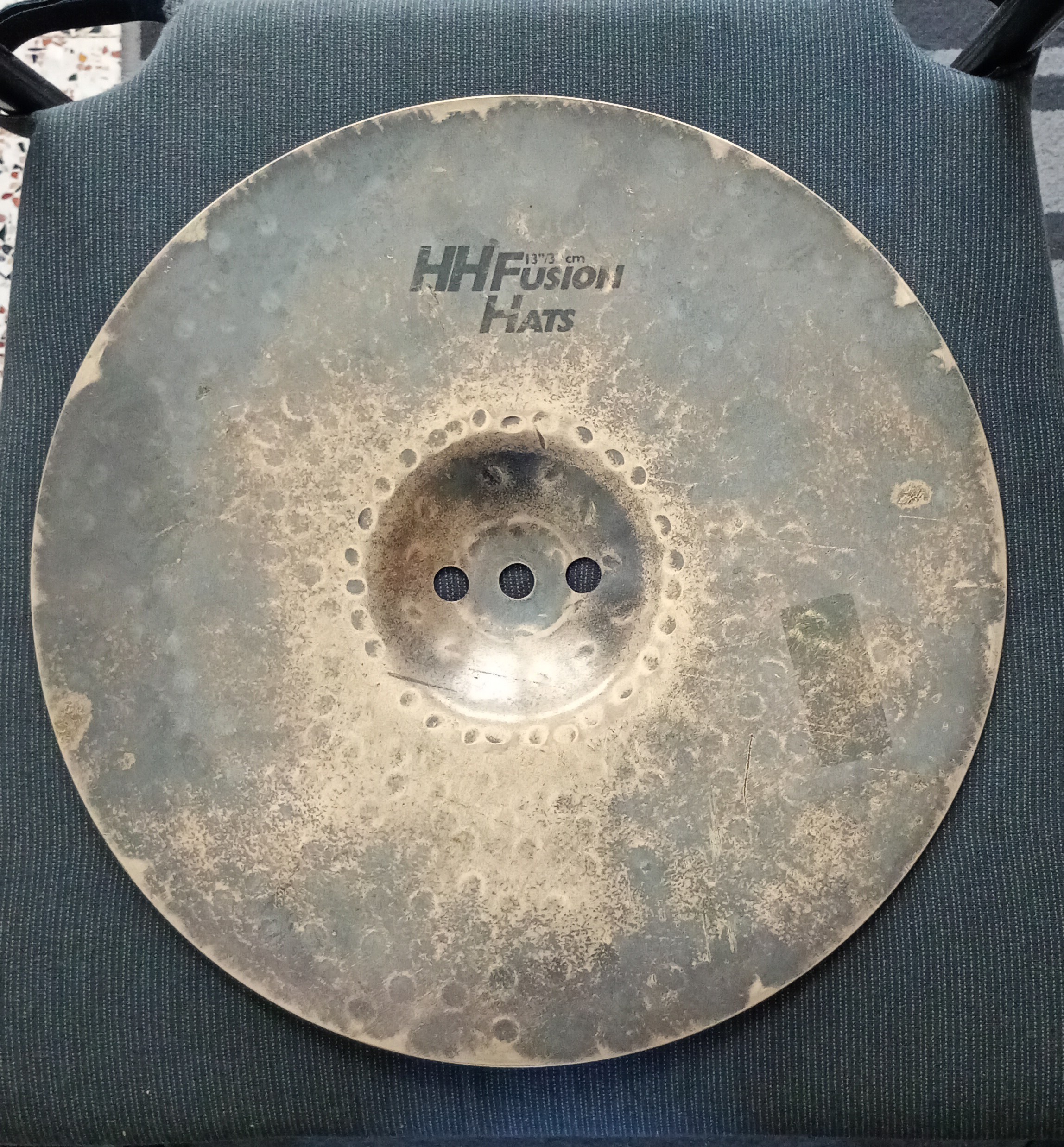 Suite à un changement de configuration, je mets en vente cette cymbale (fabriquée au Canada vers le début des années 2000). Une seule cymbale en vente ici (bottom uniquement) pas de paire, d'où le prix. Le haut de la gamme HH Sabian (Hand Hammered). Une cymbale assez épaisse, martelée à la main avec une finition naturelle, brute (qui rappelle la série Leopard de même marque).En très bon état. Pas parfaite, compte tenu de son âge - quelques traces d'utilisation complètement superficielles, rien de flagrant qui viendrait détériorer le son ou la durabilité de la cymbale (pas de fissures, ni de déformations, ni de keyhole). Les trous situés sur la cloche sont d'origine, ce qui permet à l'air de s'évacuer rapidement lorsque la charley est fermée (son plus sec, précis) même principe que sur les Fast Hats ou encore les Quick Beat de marque "Z...".