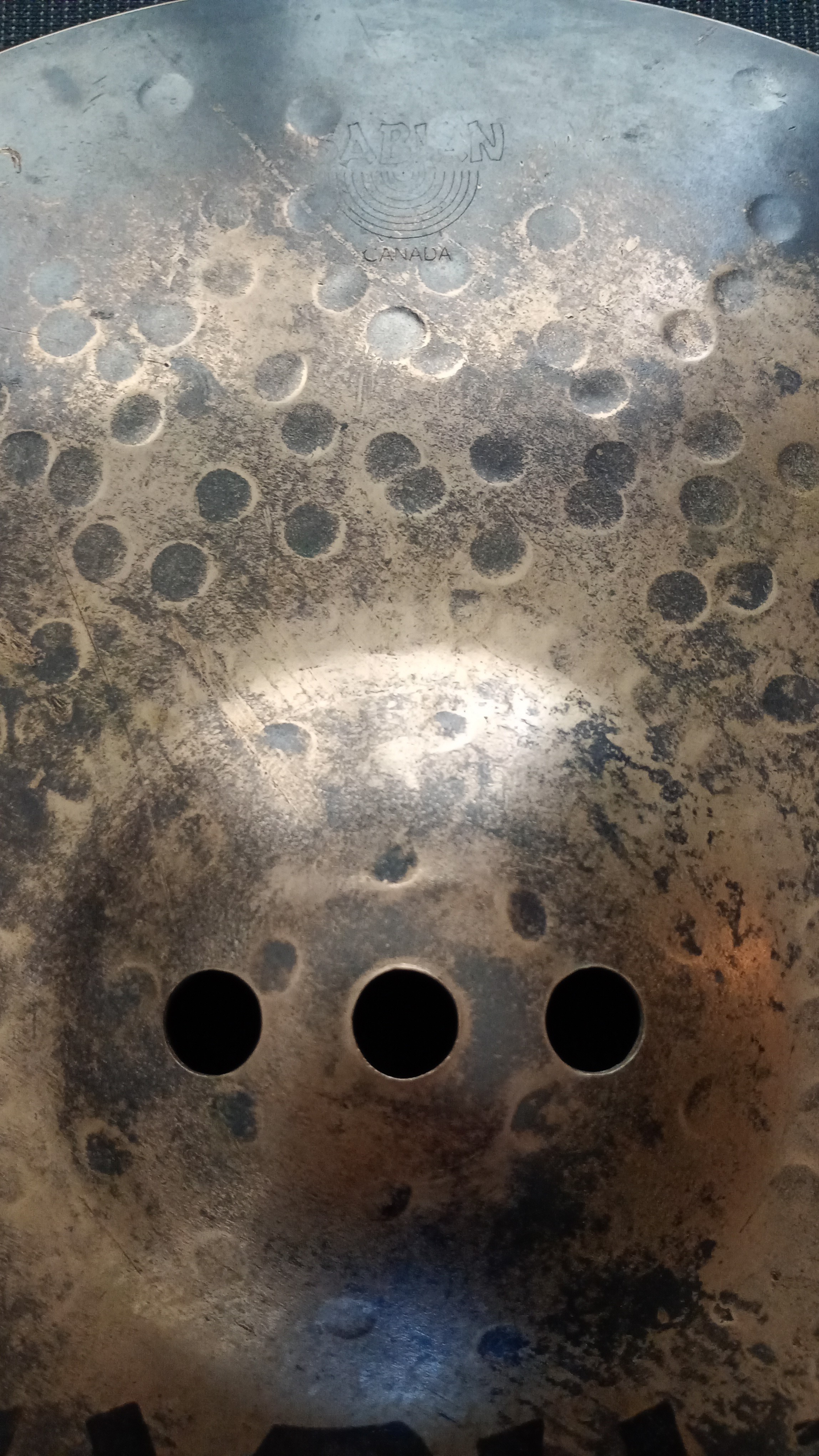 NB : étant donné son épaisseur, je m'en servais aussi comme petite ride secondaire - pour des plans alternés rapides (façon George Kollias de Nile ou Trey Williams de Dying Fetus entre autres) ça fait bien l'affaire pour qui ne veut pas s'encombrer d'une autre cymbale de 18," 20" ou plus... Plus de photos et de détails sur demande.