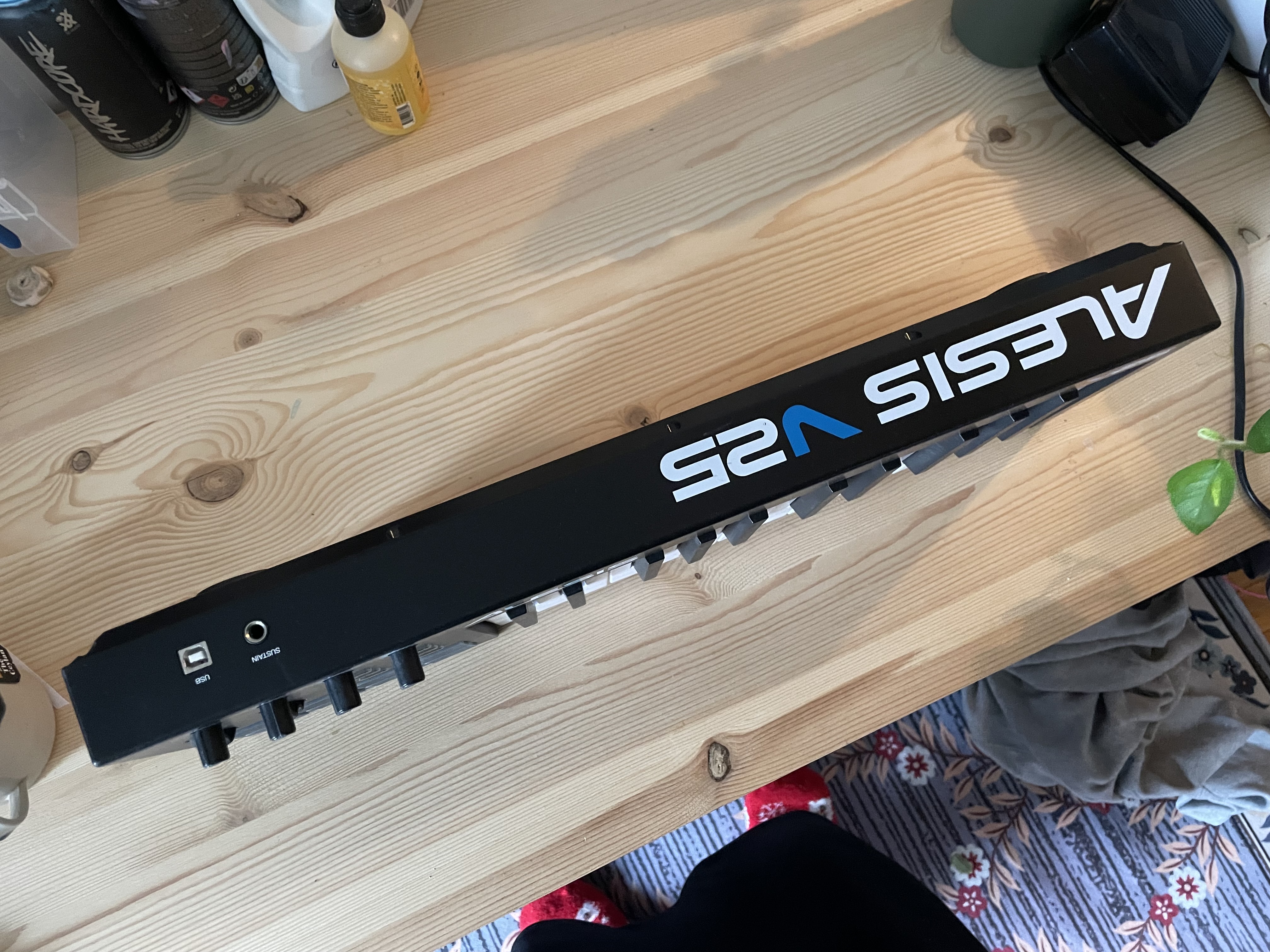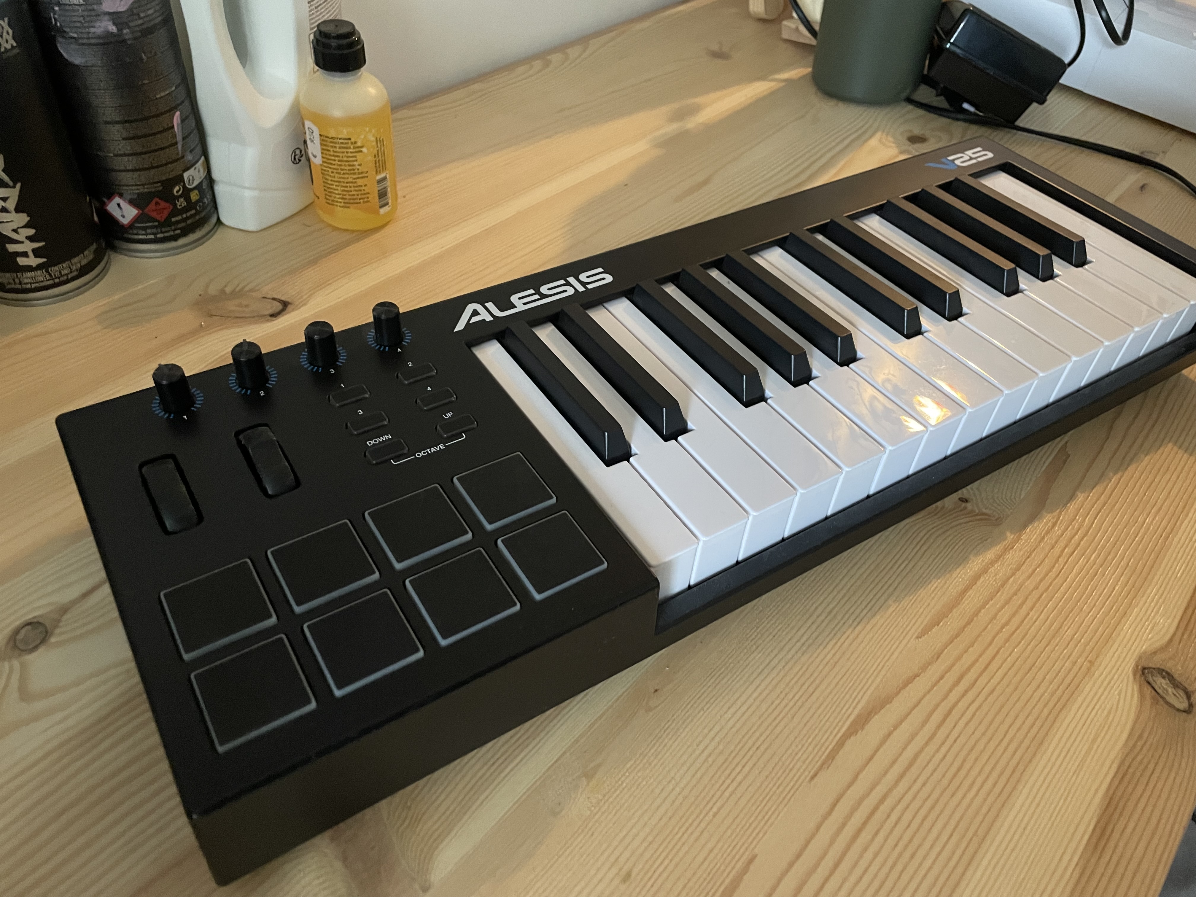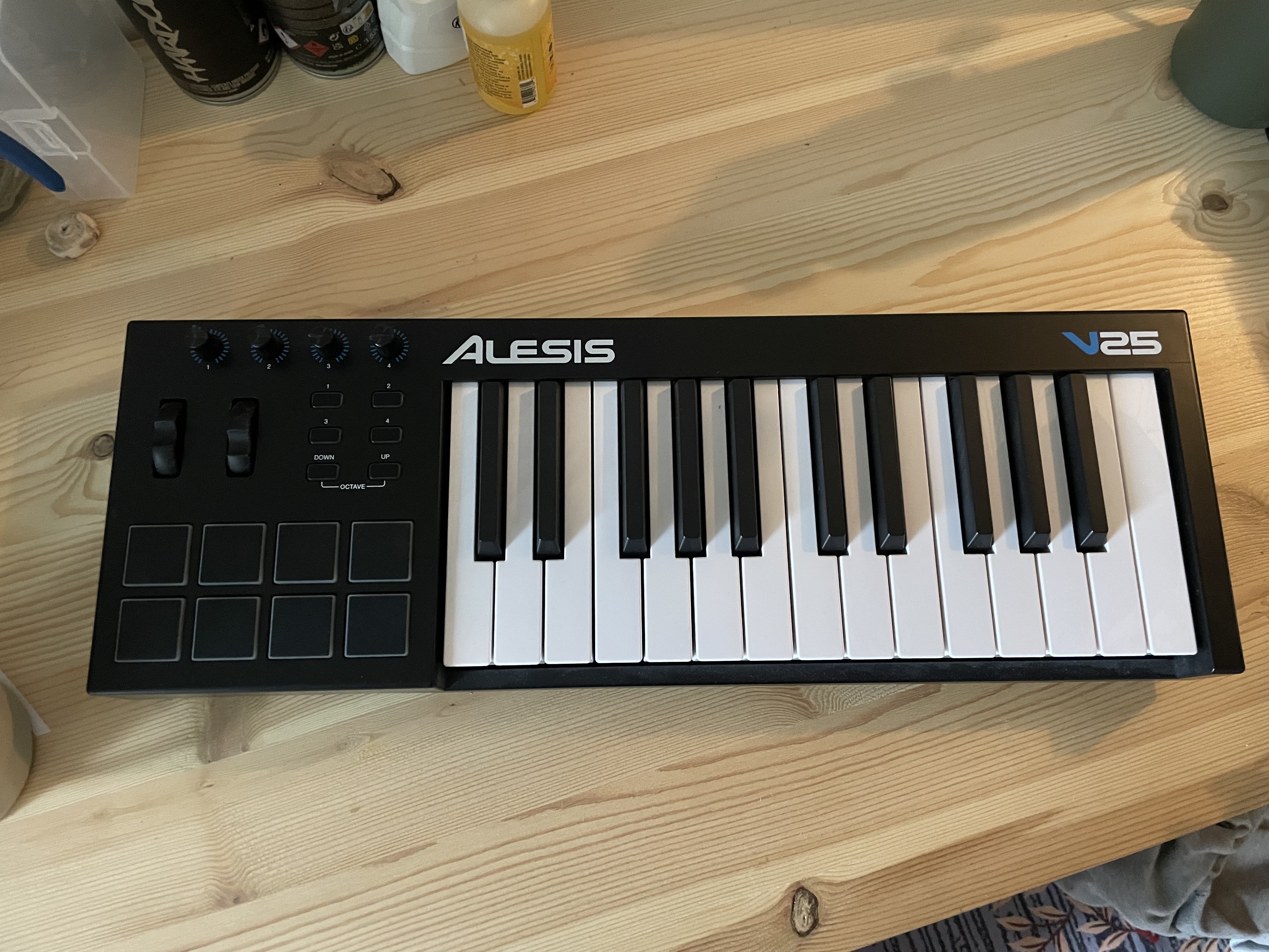 Je vends mon clavier MIDI Alesis V25, avec 25 touches, 8 pads de batterie, 4 boutons, et 4 potards assignables. Connexion MIDI via USB type A.