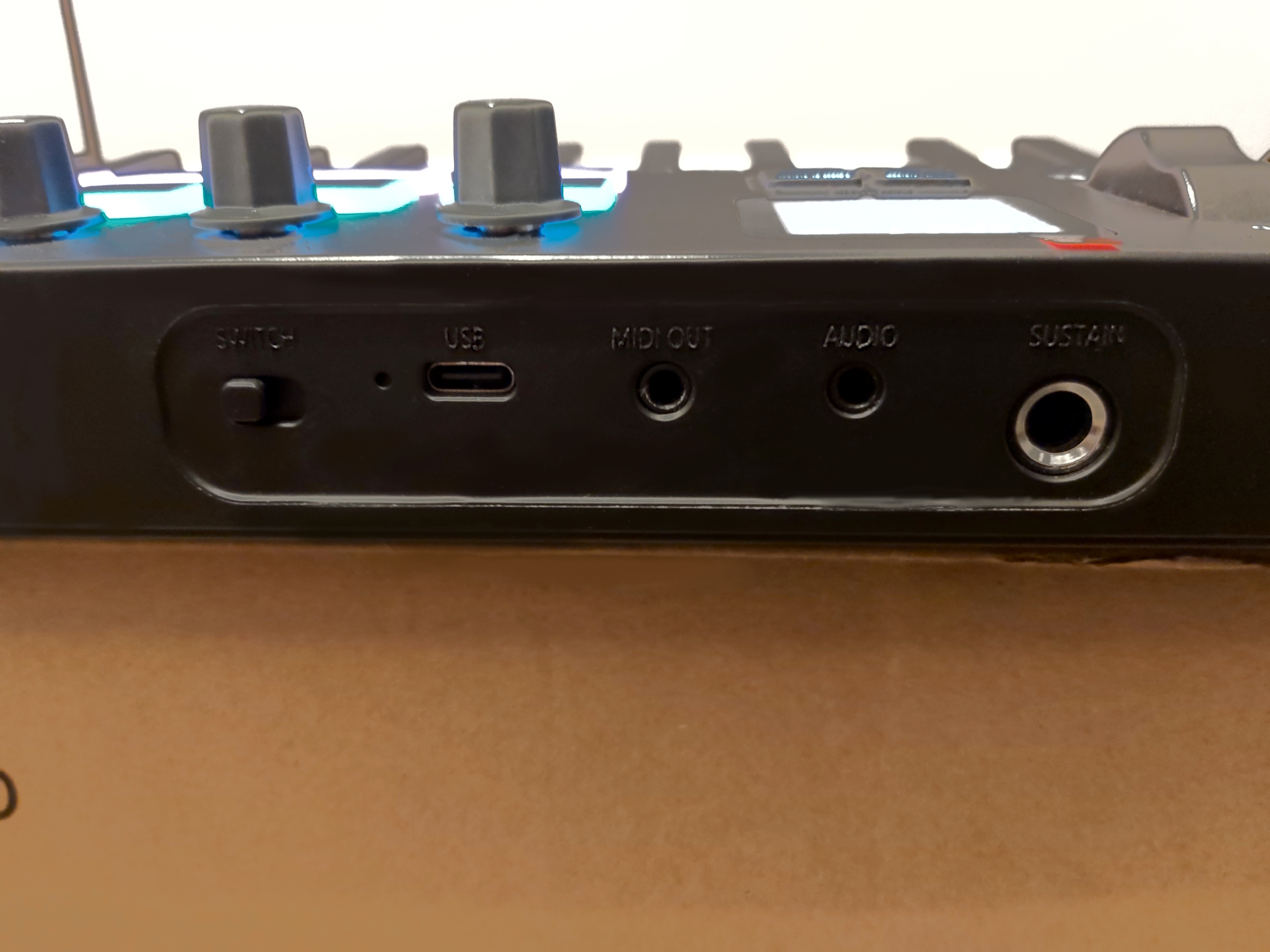 Interface d'entrée/sortie MIDI 3,5 mm, interface de pédale sustain/latch 6,5 mm.