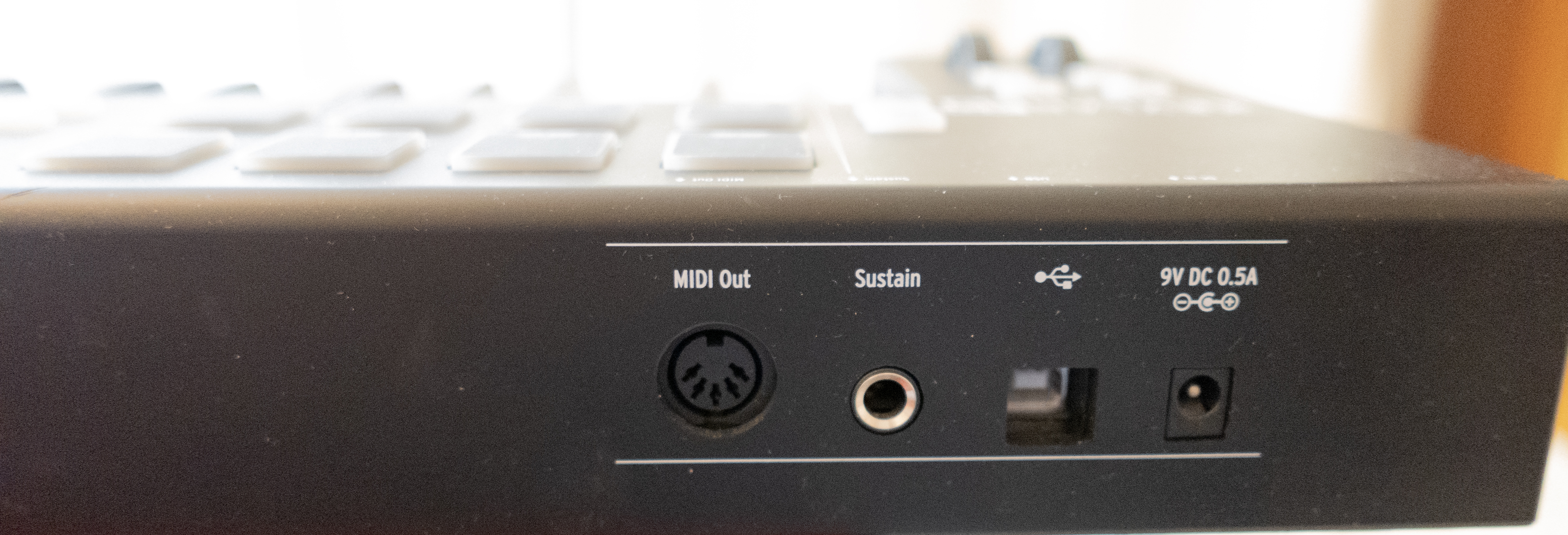 Connexions: 1 entrée pour pédale de contrôle (Jack 6,3 mm), 1 sortie MIDI (DIN 5 broches), 1 port USB-C
