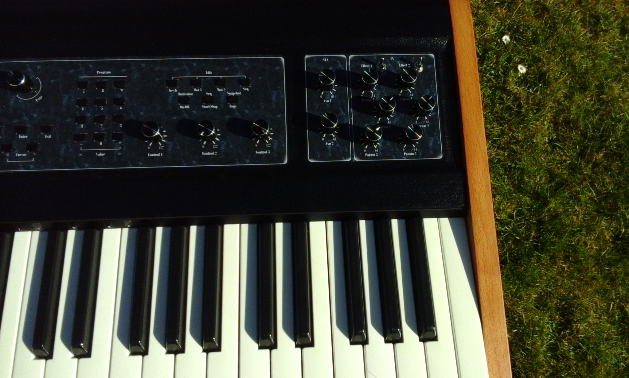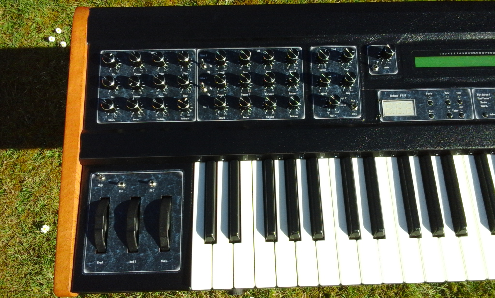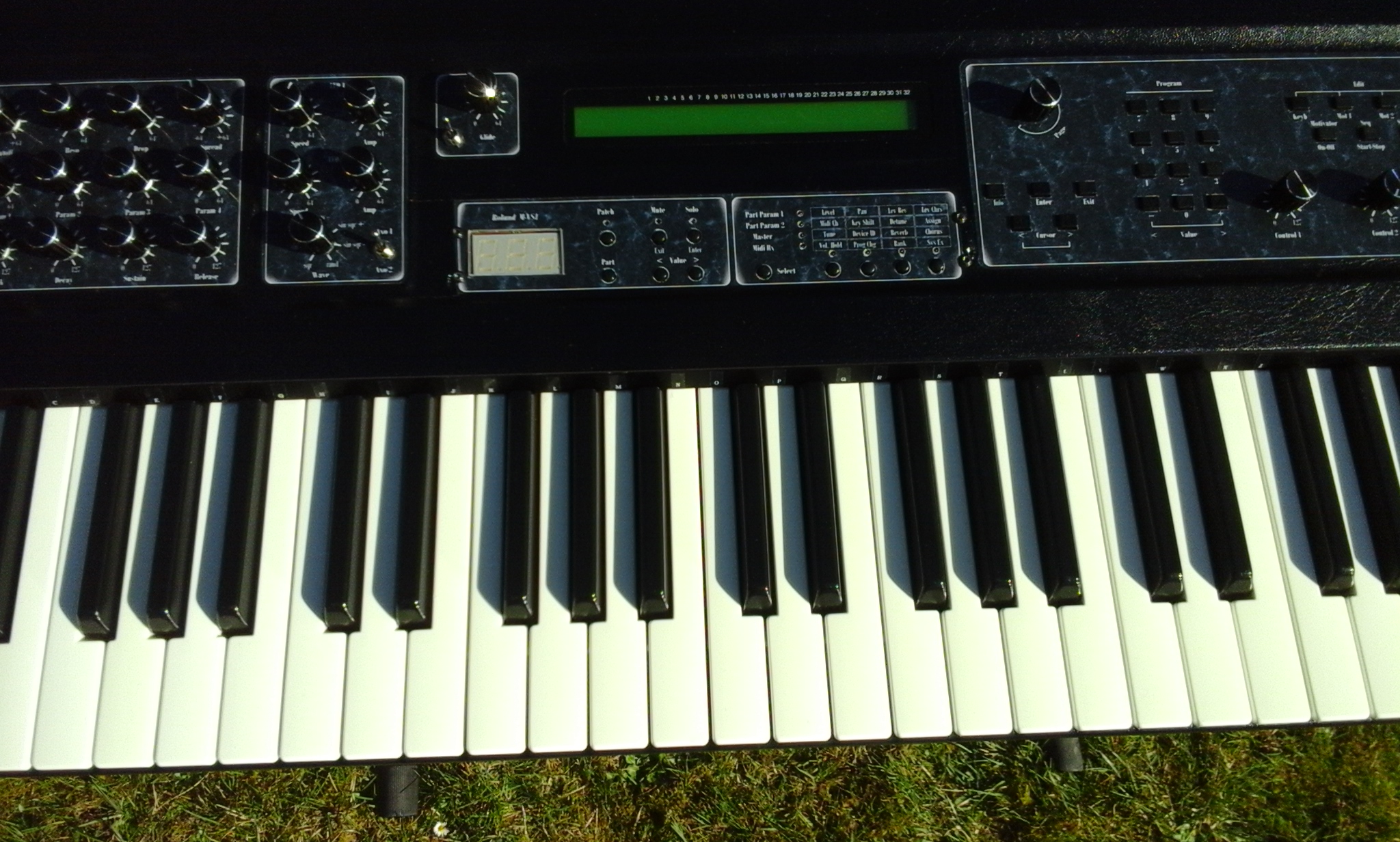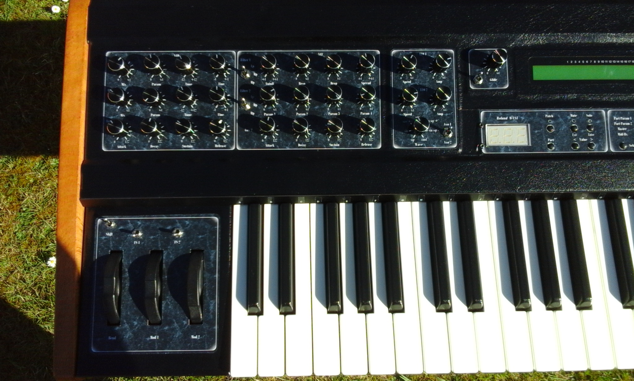 Je lui ai ajouter l'expandeur Roland M-VS1 (Vintage synth) connu pour ses sons de mellotron magnifiques entre autres. Sa façade est sous l'écran d'origine. Petit bémol, j'ai un faux contact sur un des segment de l'afficheur numérique. C'est pas génant mais j'ai jamais trouvé d'où viens le problème.