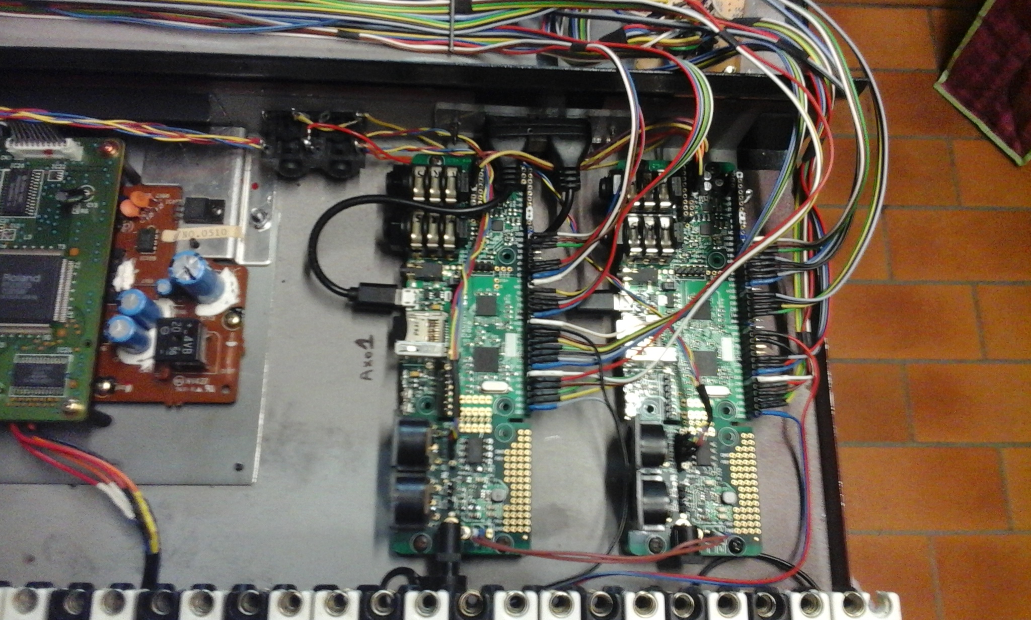 Je lui ai ajouter aussi 2 cartes Axoloti sur lesquelles sont raccordés 38 potentiomètres et 9 switchs. Cette carte est programmables, il suffit de télécharger le logiciel (compatible windows, mac ou Linux), connecter en usb et vous avez un modulaire virtuel polyphonique. Les potentiometres sont des doubles raccordé sur les 2 cartes pour certains. Ce qui donne une config assez géniale. (Voir le tableau de configuration). Ceux qui connaissent les cartes Axo savent que cette config transforme cette machine en un synthétiseur polyphonique conséquent est aux possibilités quasi infinies.