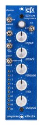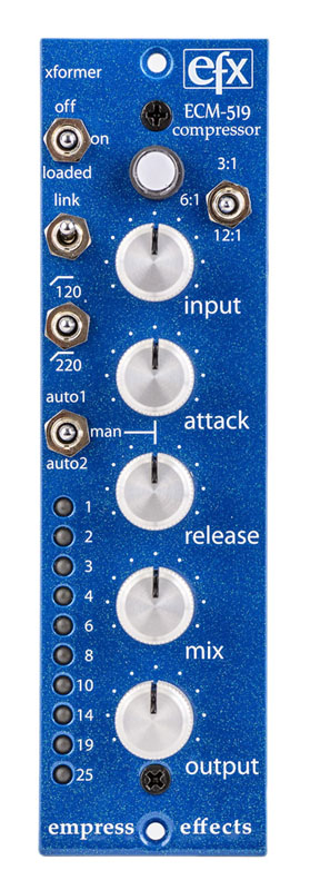 Côté réglages, l’ECM-519 dispose de trois ratios de compression (3:1, 6:1 et 12:1), de potards d’attaque (capable de descendre à 50 microsecondes) et de relâchement, de réglages des niveaux d’entrée et de sortie, d’un filtre passe-haut commutable à 120Hz ou 220Hz, d’un potard de Mix pour faire de la compression parallèle, et d’un Stereo Link pour coupler deux modules et faire de la compression stéréo.