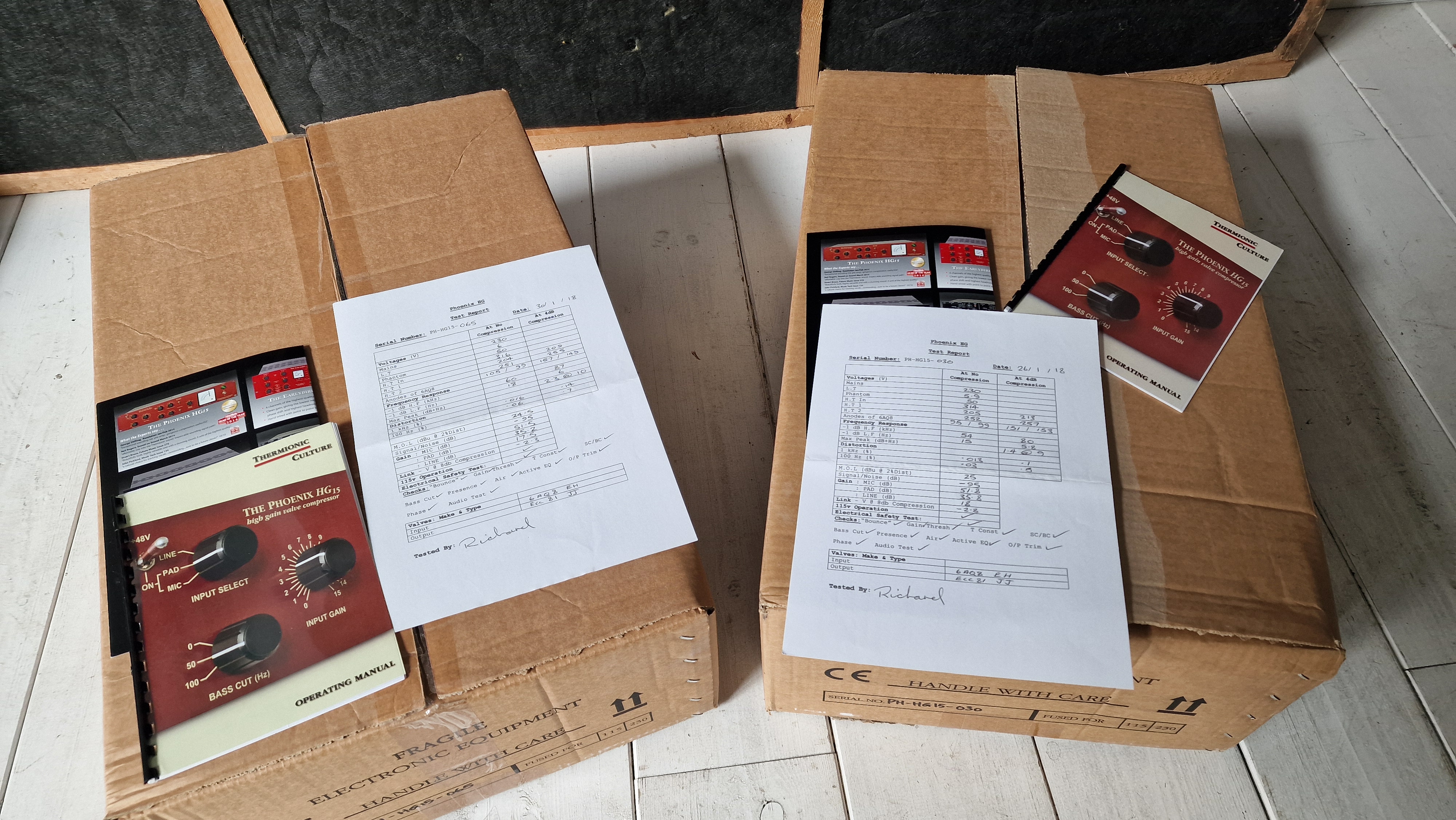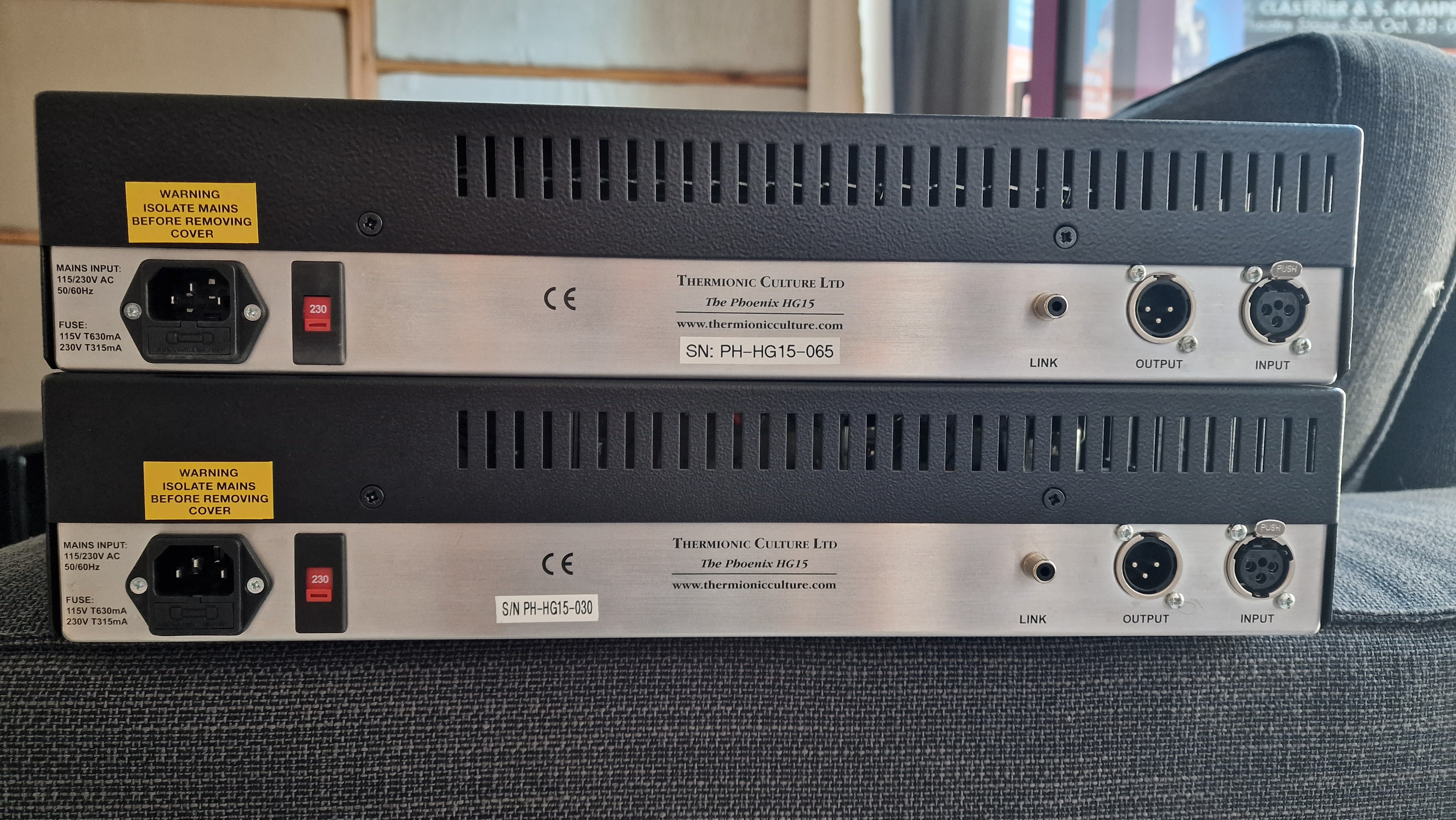 Nous vendons 2 unités, Thermionic Culture The Phoenix HG 15, 1er propriétaire uniquement utilisées dans notre studio non commercial du label homerecords.be, non-fumeur, sur facture. Avec mode d'emploi et conditionnement d'origine.Vente suite à la diminution de nos subsides.